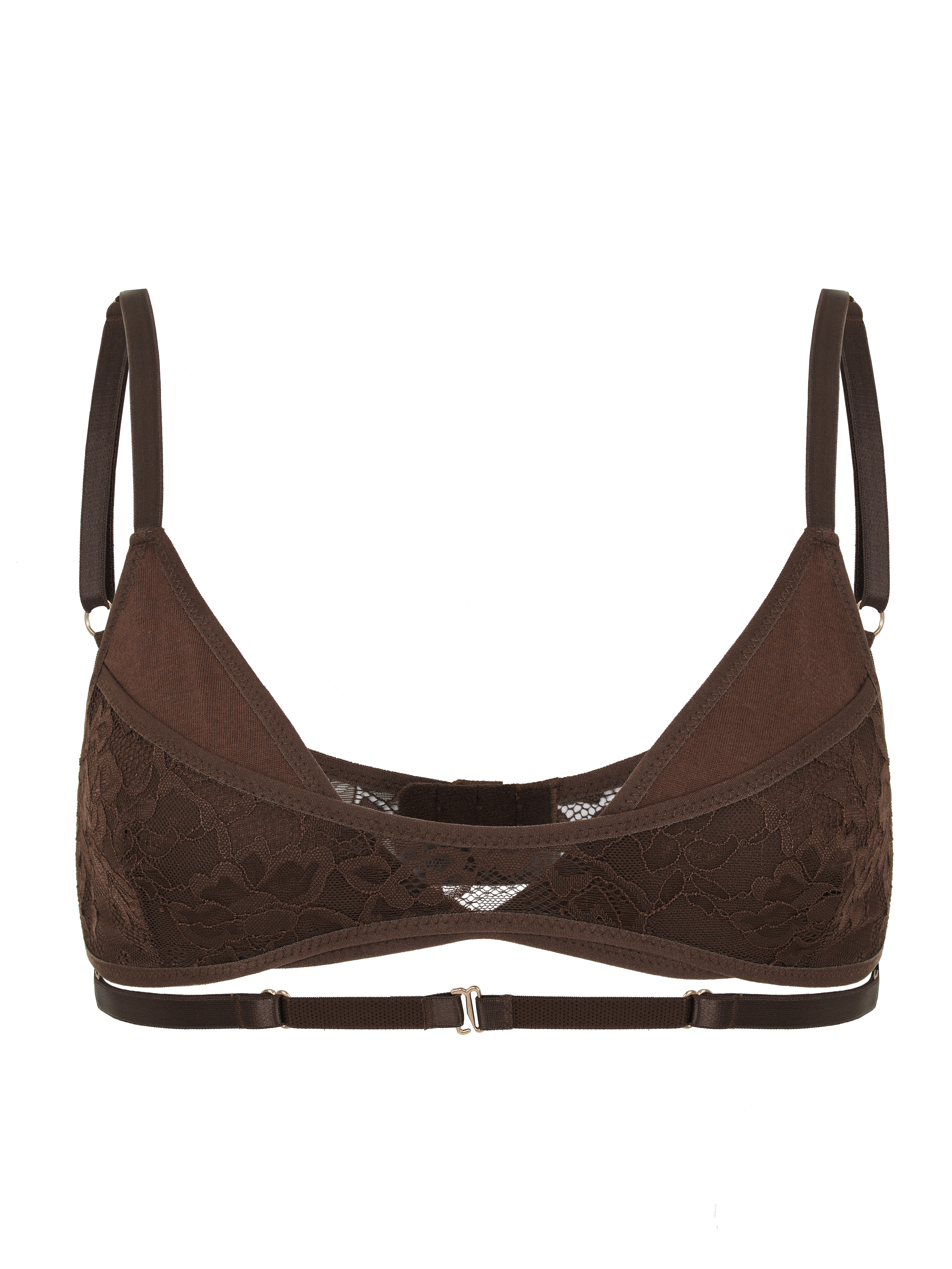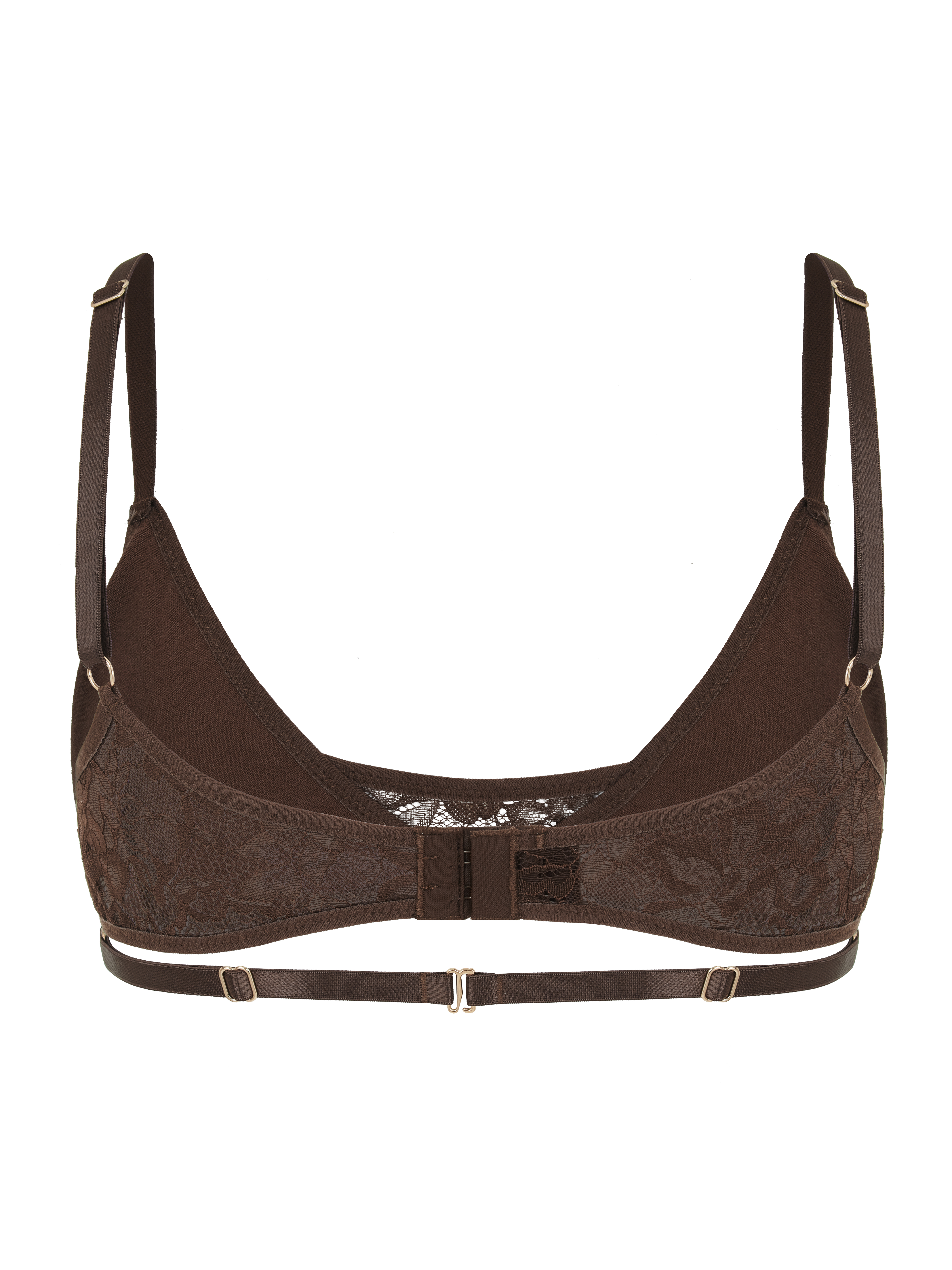 Форма бра максимально оголяет зону декольте, а фурнитура в виде сердца создает чувственный образ. Прозрачная эластичная сетка дополнена цветочной вышивкой.