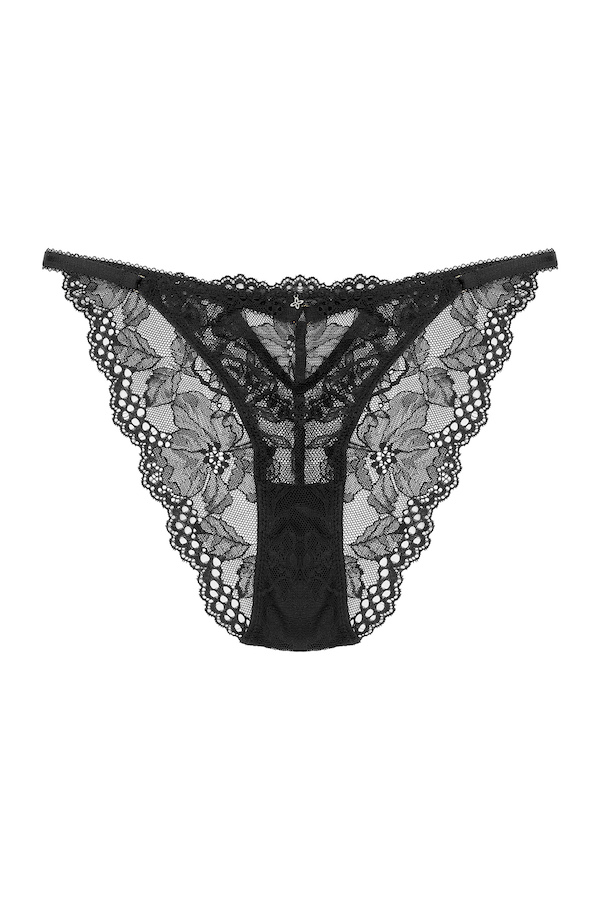 Смелое сочетание красной вышивки на черном кружеве, с акцентами в виде лепестков. Стринги выполнены из нежнейшего французского кружева.
