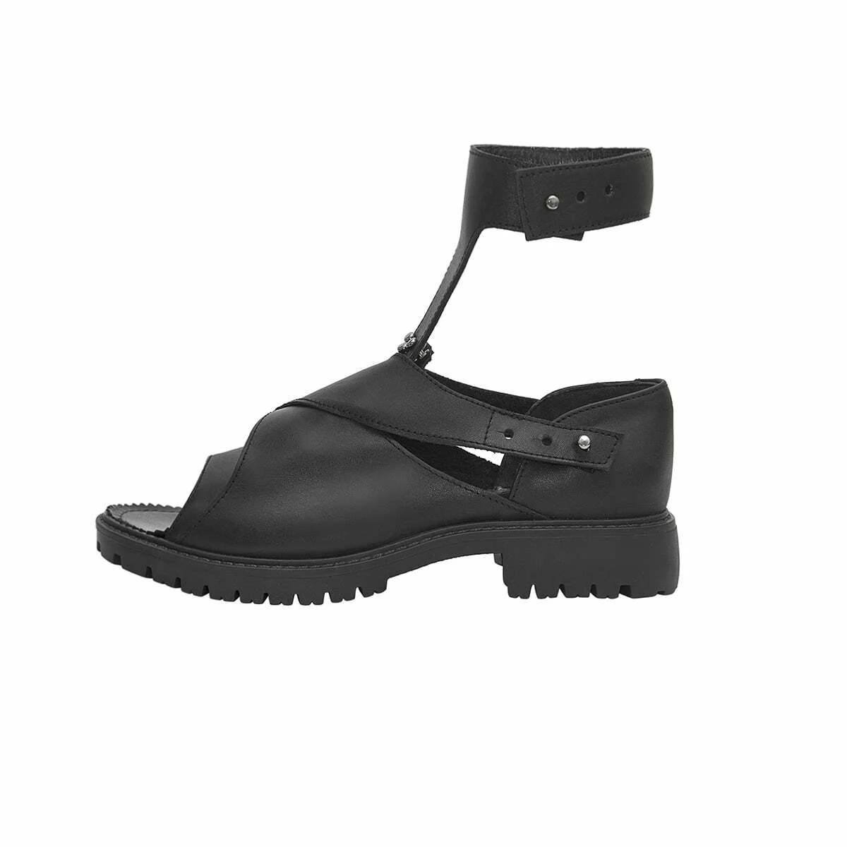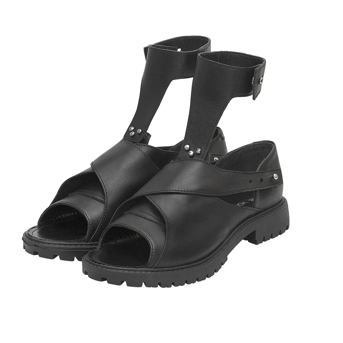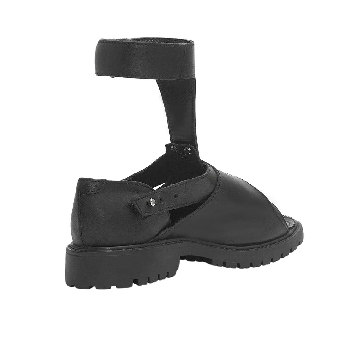 Кожаные босоножки с открытым носом, две панели крест на крест на липучках и деталь «браслет» в районе щиколотки. Рельефная подошва из легкой износостойкой резины ТЭП, низкий каблук.