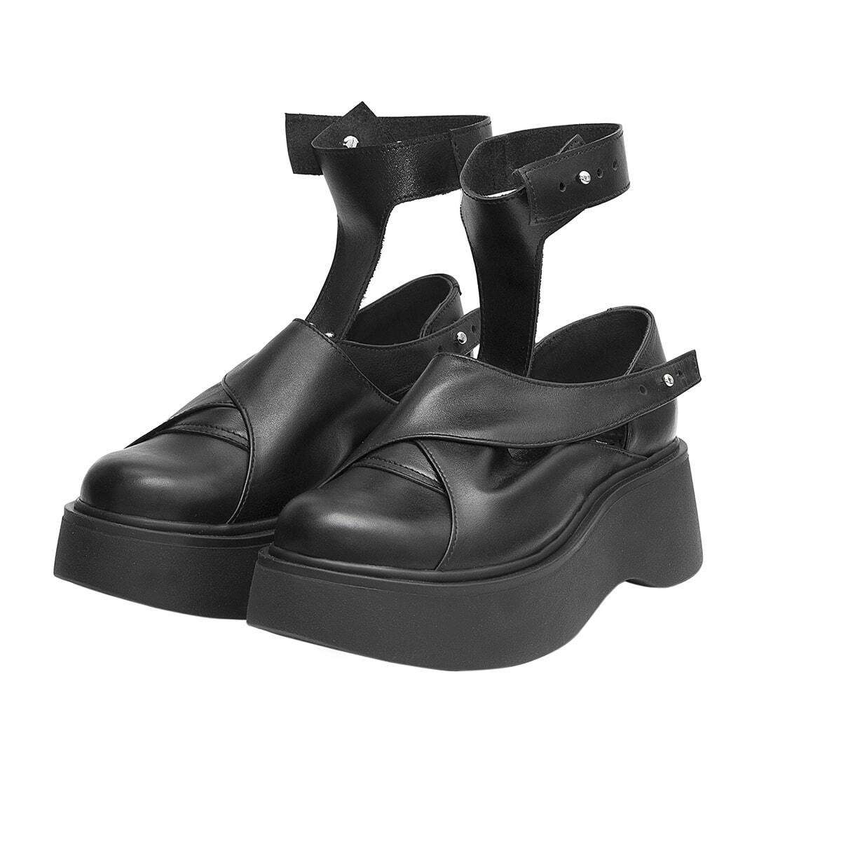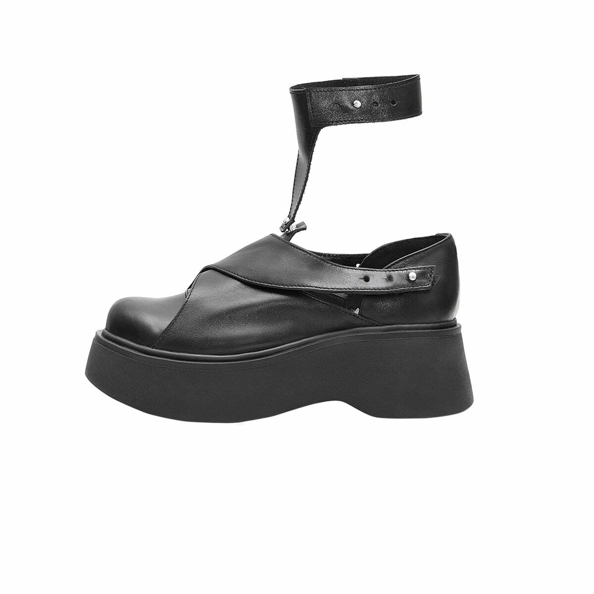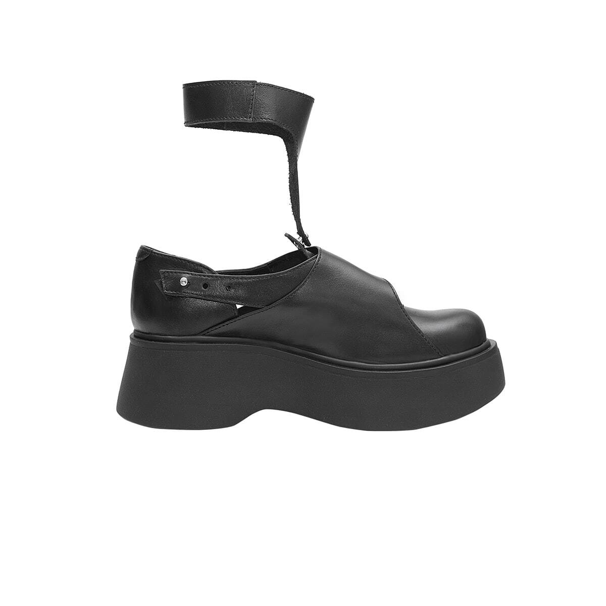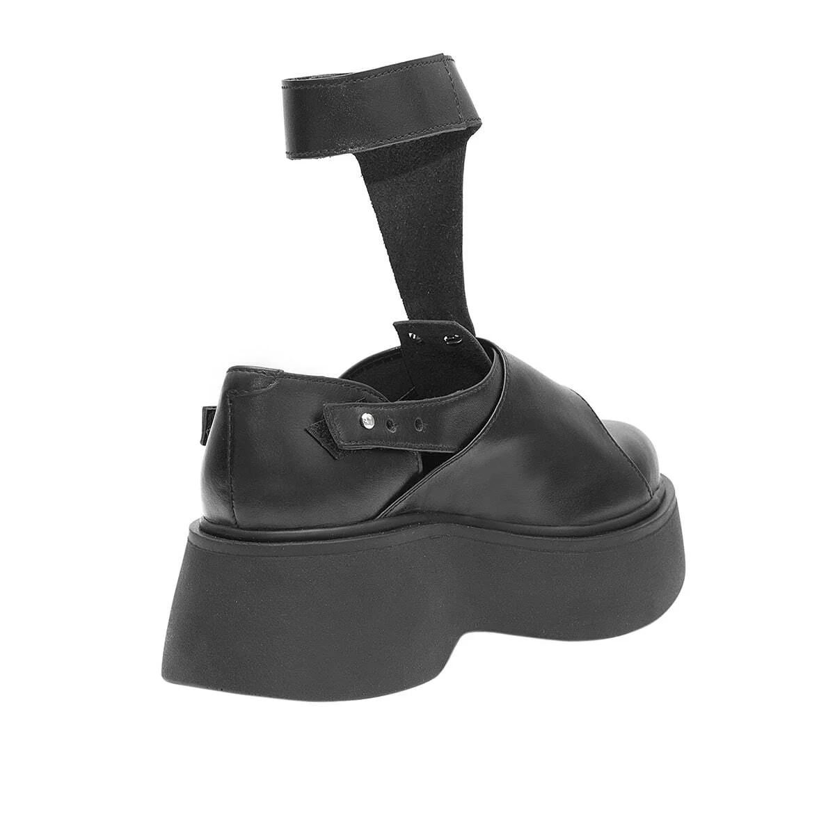 Кожаные сандалии с низкой пяткой, на резинке. Стропа и регулируемая застежка сзади. Перфорация на носу, функциональные шнурки. Подошва из легкого износостойкого материала PU.