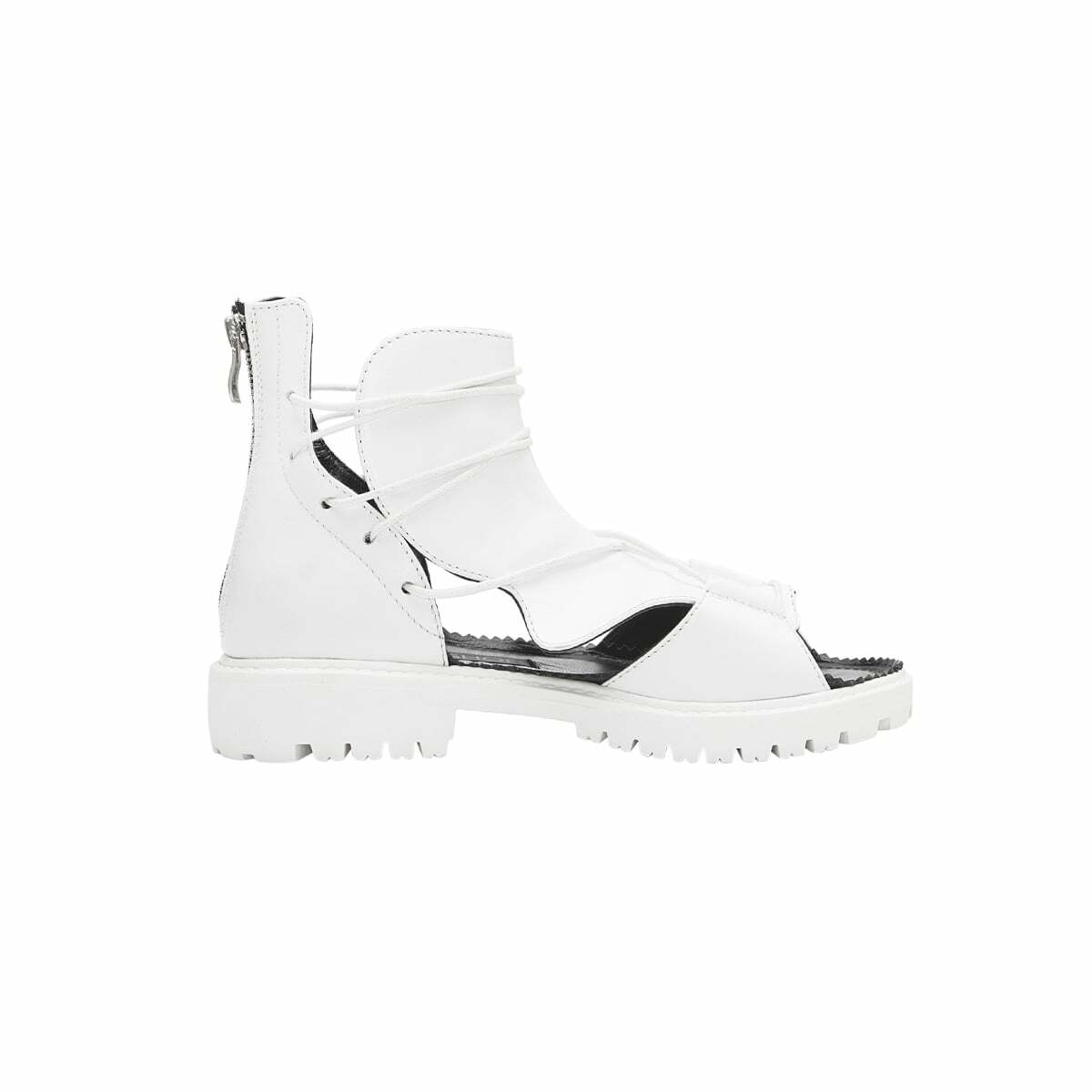 Кожаные босоножки с открытым носом, с функциональной молнией сзади. Декорированы кожаными деталями и шнурками поверх. Рельефная подошва из легкой износостойкой резины ТЭП, низкий каблук.