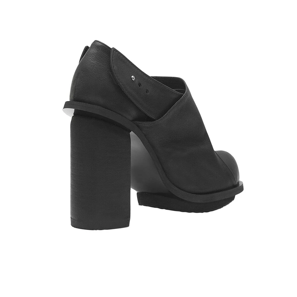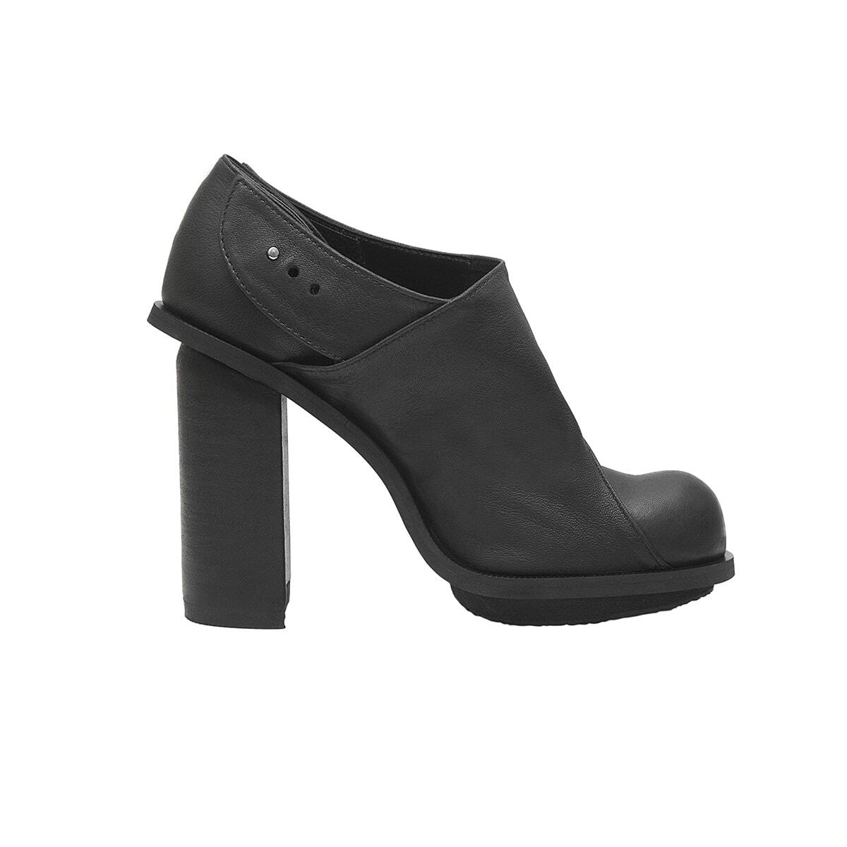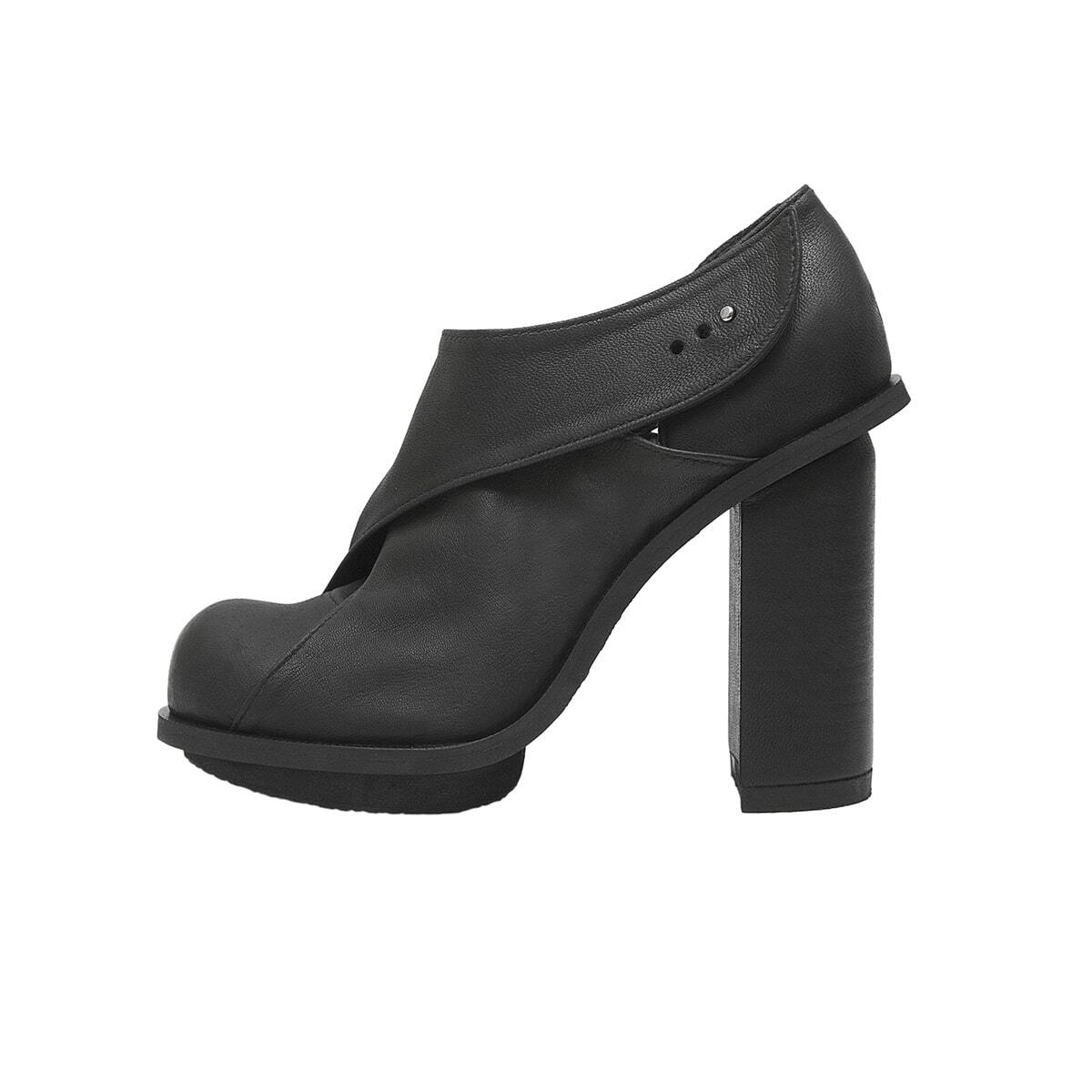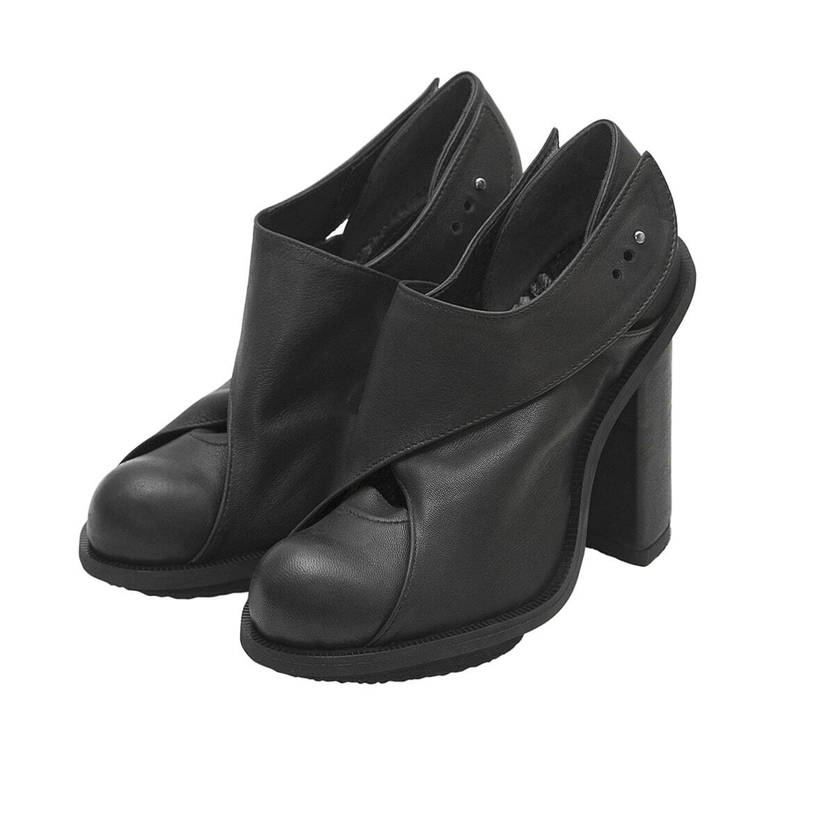 Кожаные ботинки с острым носом. Скошенный каблук, напечатанный с помощью 3-D принтера. Функциональная молния сзади.