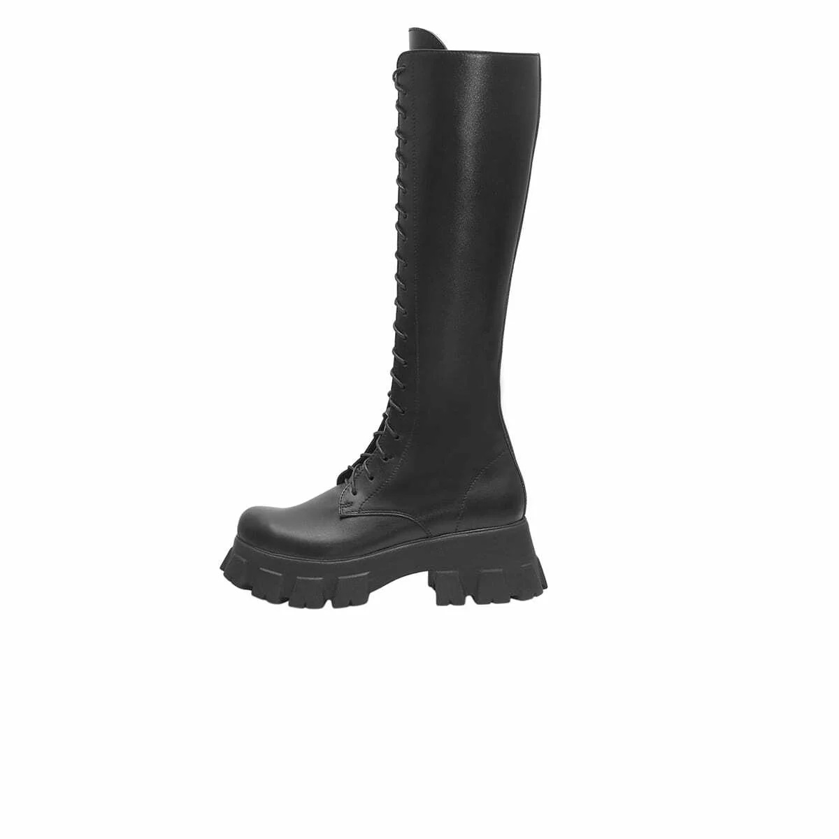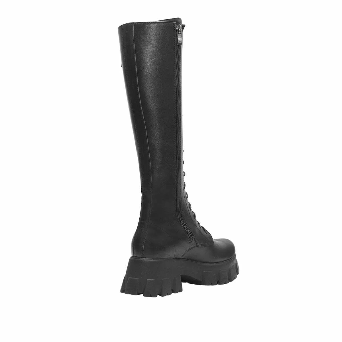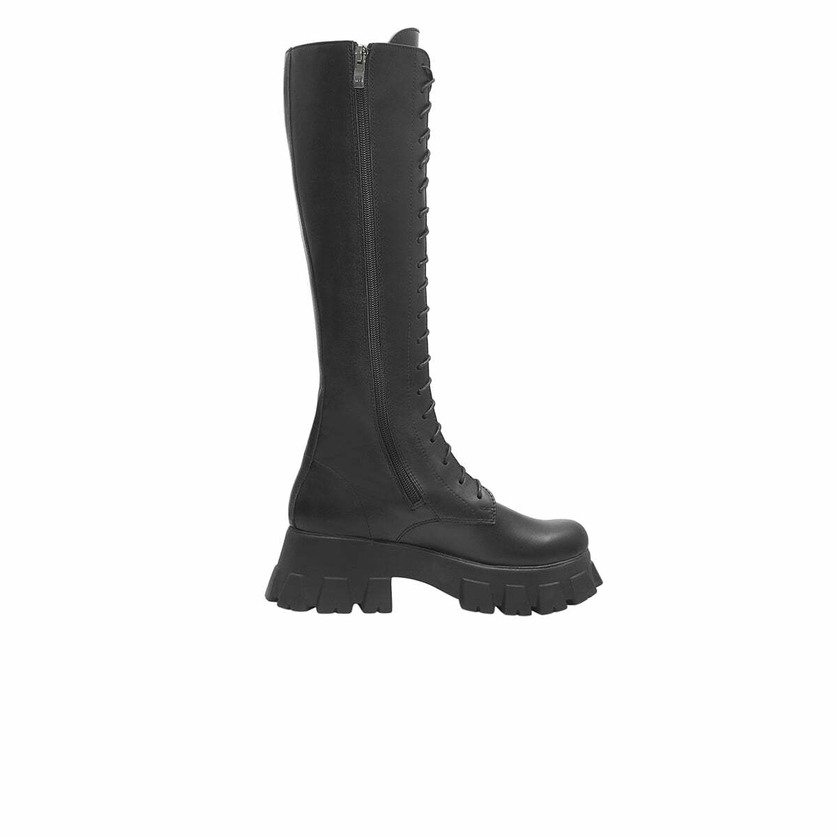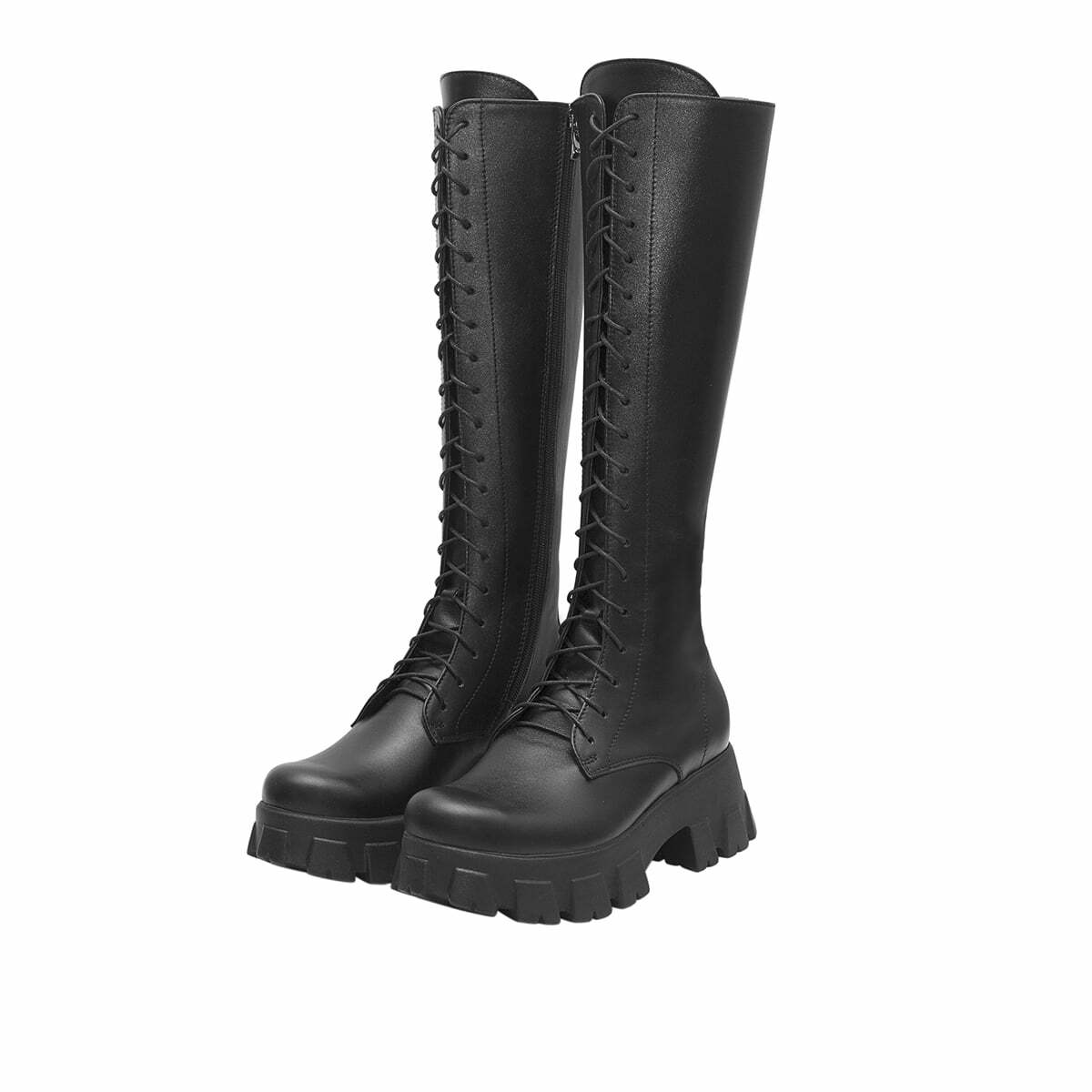 Высокие кожаные сапоги на шнуровке с функциональной молнией сбоку. Рельефная подошва из легкого износостойкого материала PU.