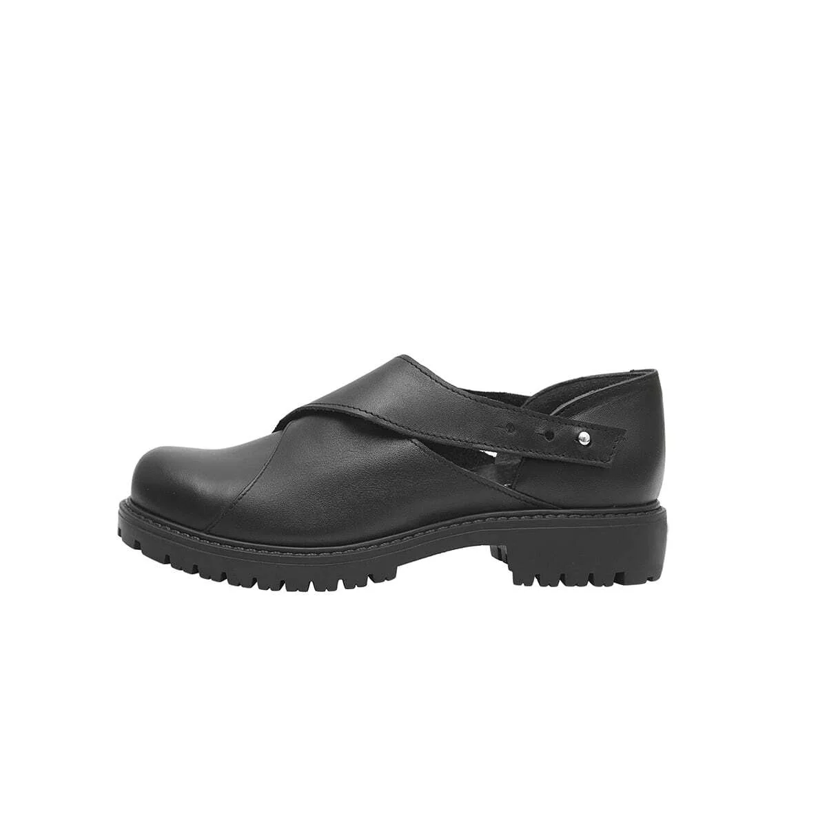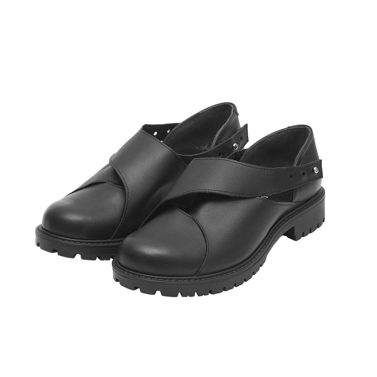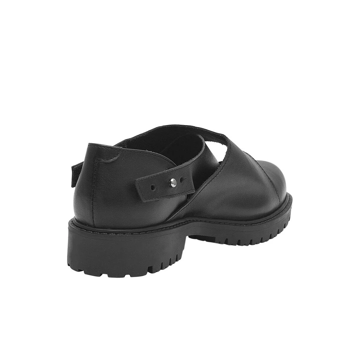 Кожаные сандалии с низкой пяткой, на резинке. Стропа и регулируемая застежка сзади. Перфорация на носу, функциональные шнурки. Подошва из легкого износостойкого материала PU.