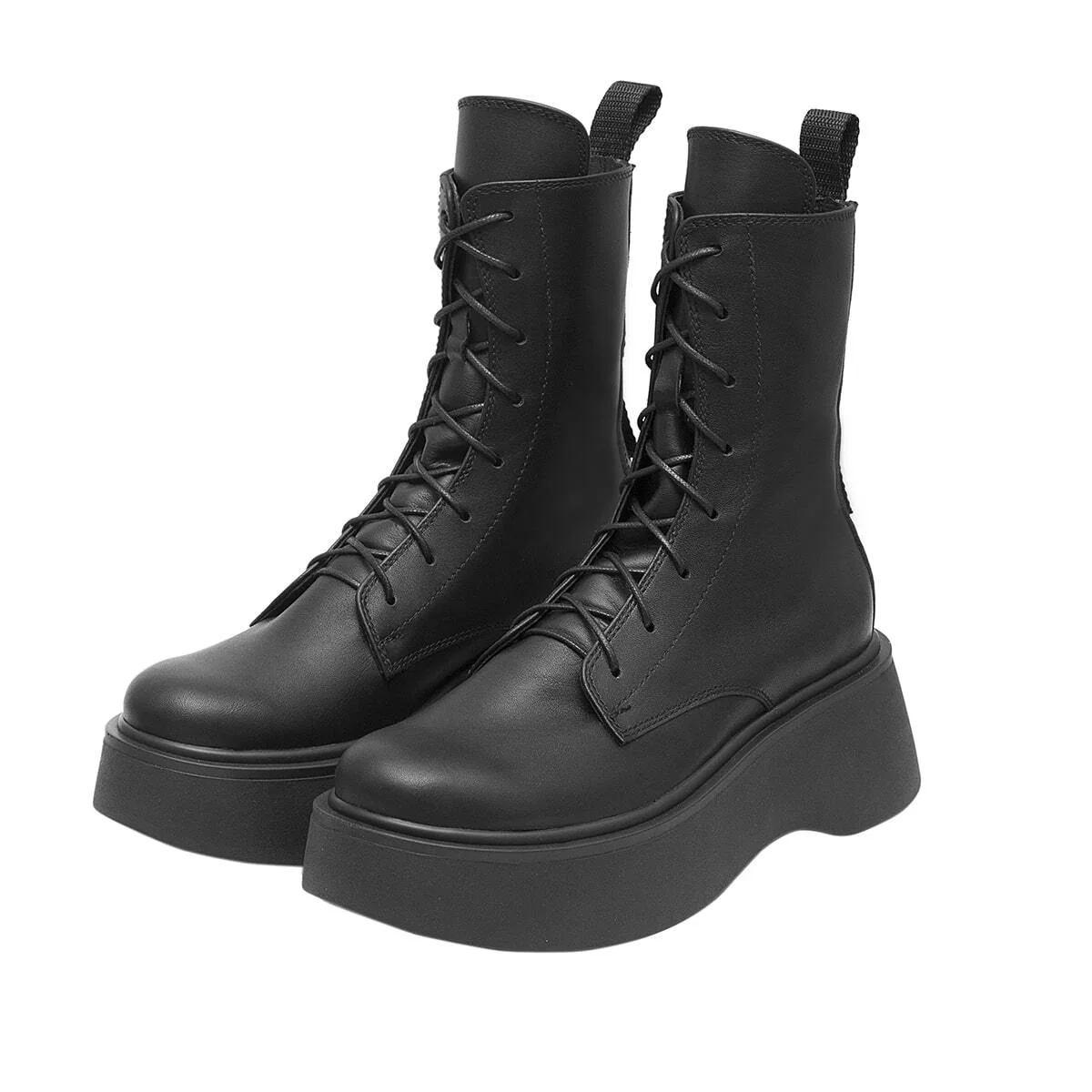 Высокие кожаные ботинки на шнуровке. Декоративная лента сзади. Рельефная подошва из легкого износостойкого материала PU.