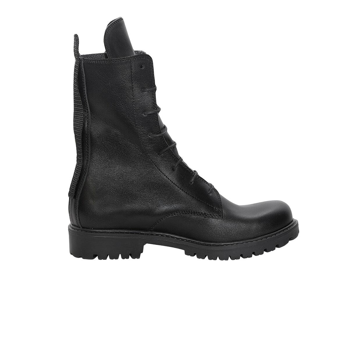 Высокие кожаные ботинки на шнуровке. С высоким язычком. С декоративной лентой сзади. Рельефная подошва из легкого износостойкого материала ТЭП. Низкий каблук.