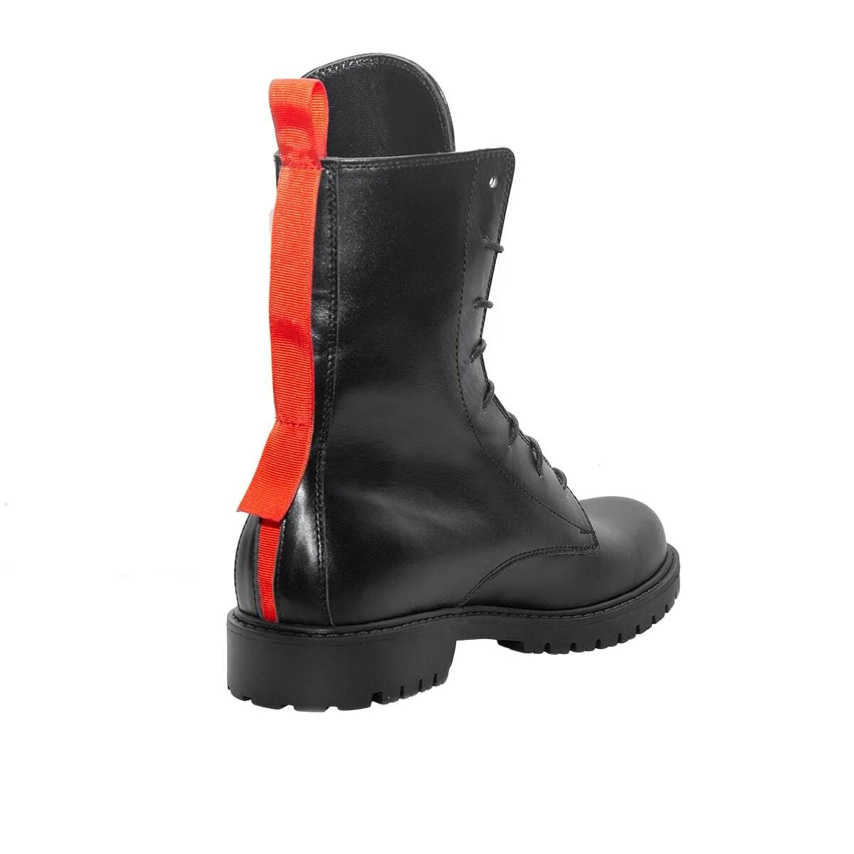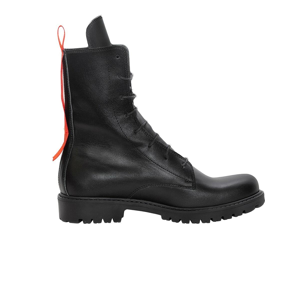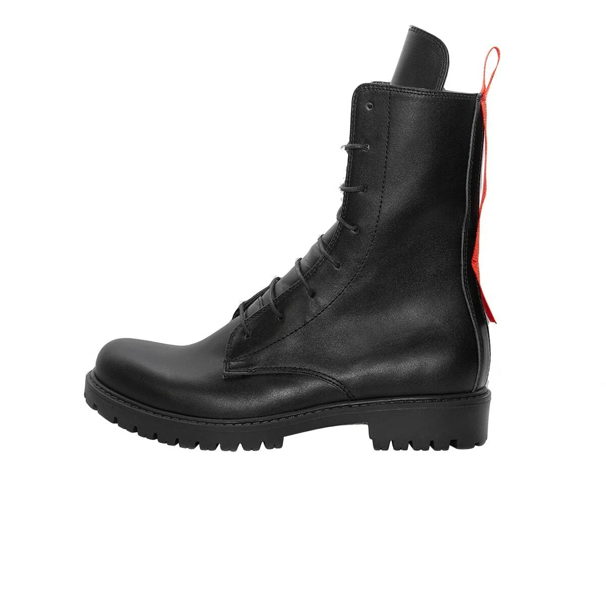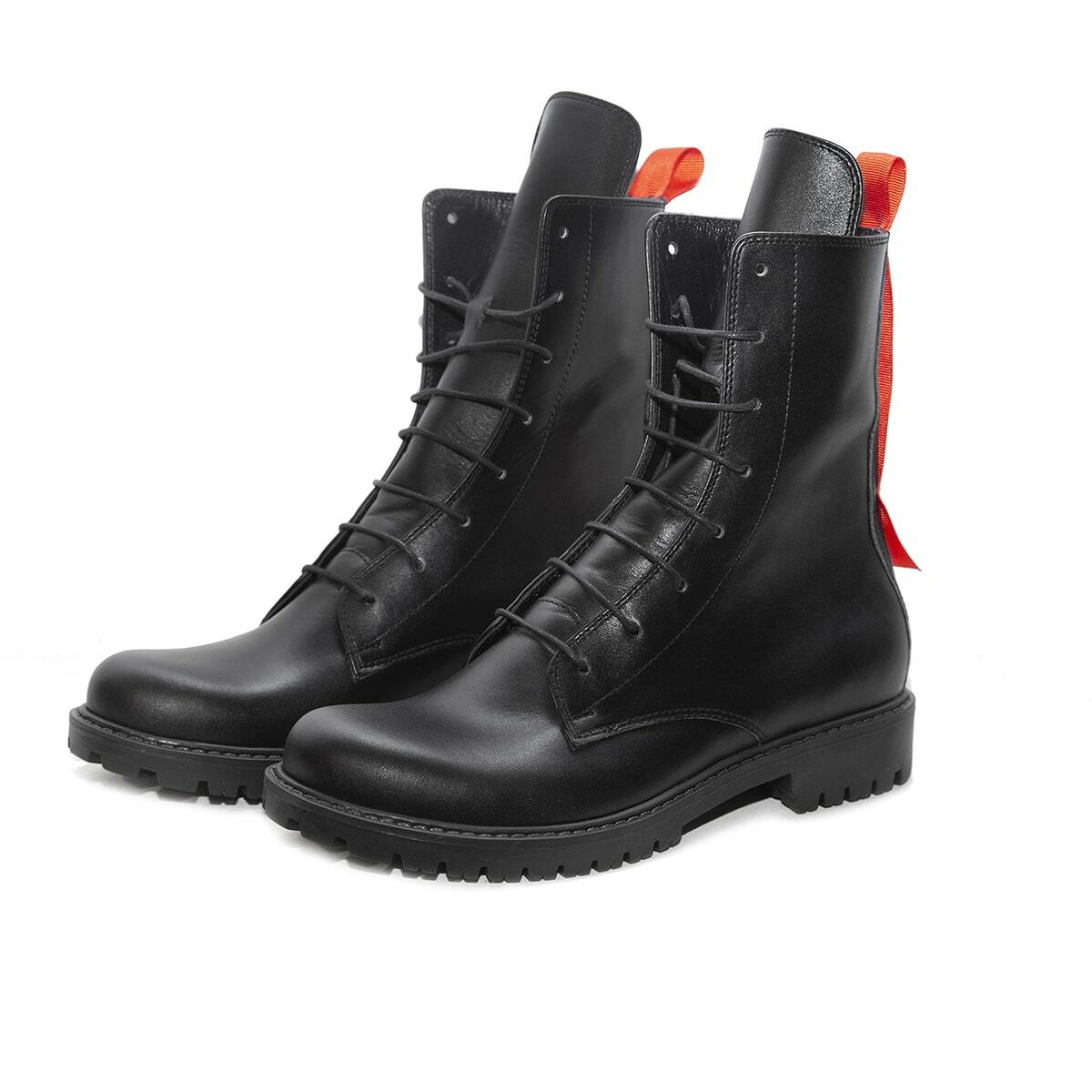 Высокие кожаные ботинки на шнуровке. С высоким язычком. С декоративной лентой сзади. Рельефная подошва из легкого износостойкого материала ТЭП. Низкий каблук.