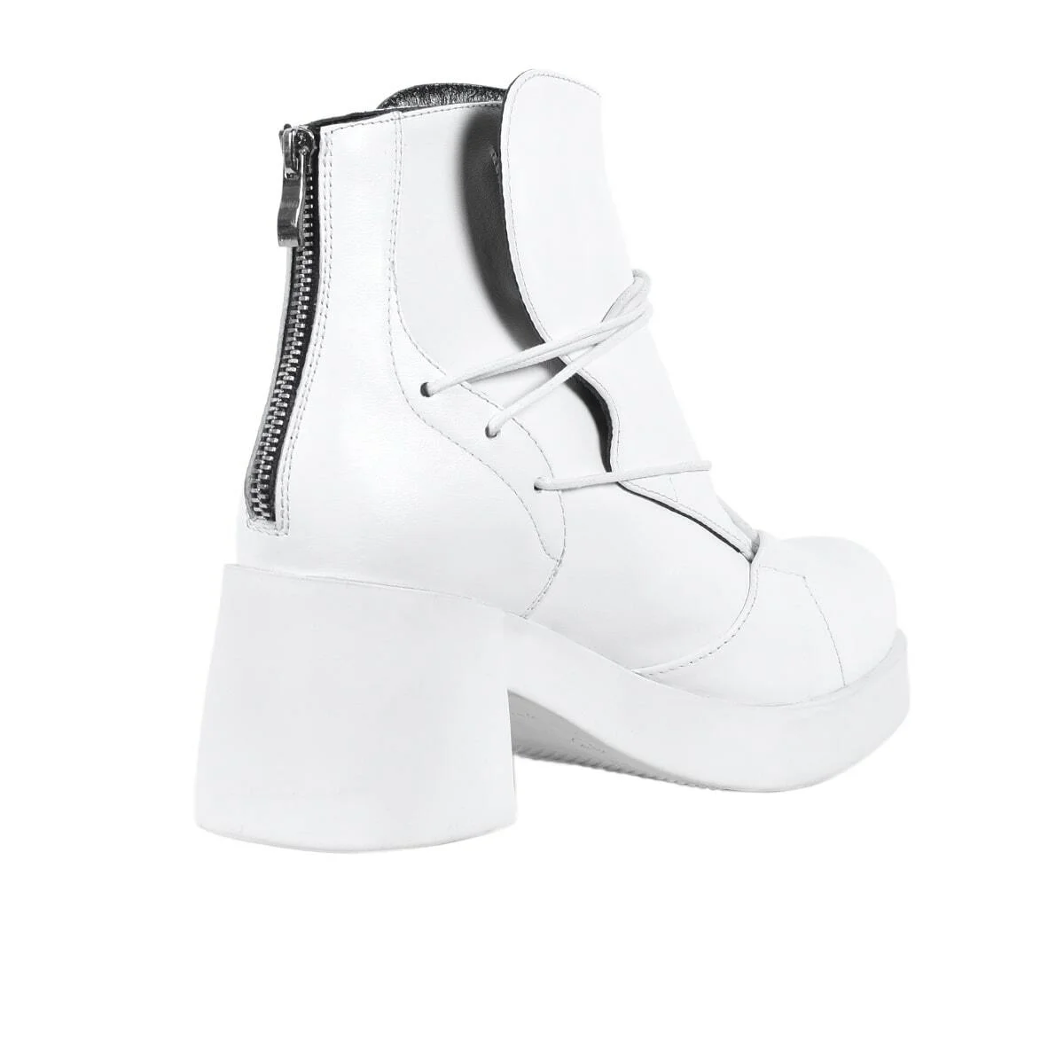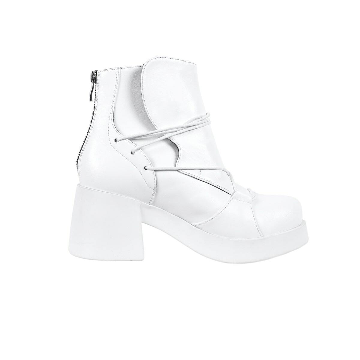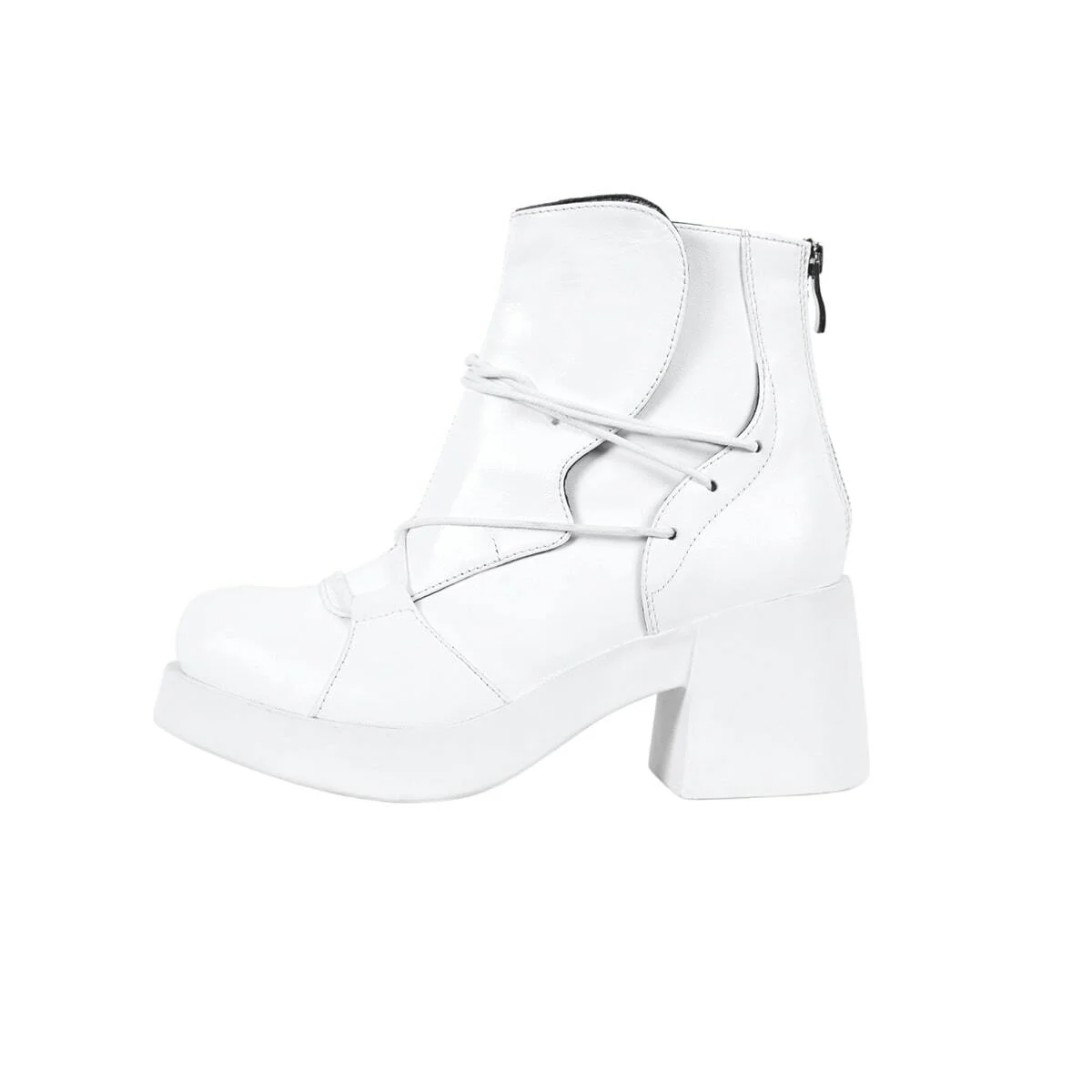 Кожаные ботинки с функциональной молнией сзади. Декорированы кожаными деталями и шнурками поверх. Приподнятый нос. Подошва из легкого износостойкого материала PU. Квадратный каблук.