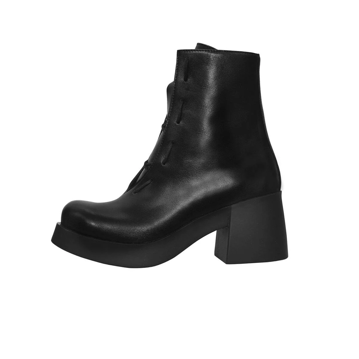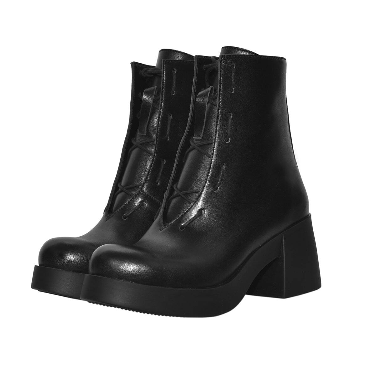 Высокие кожаные ботинки на шнуровке. Приподнятый нос. Подошва из легкого износостойкого материала PU. Квадратный каблук.