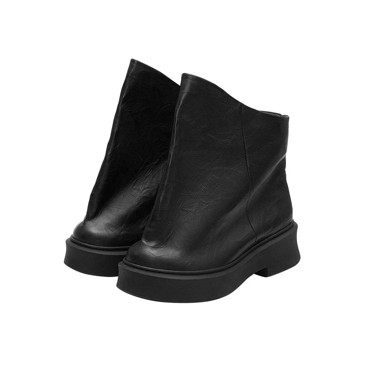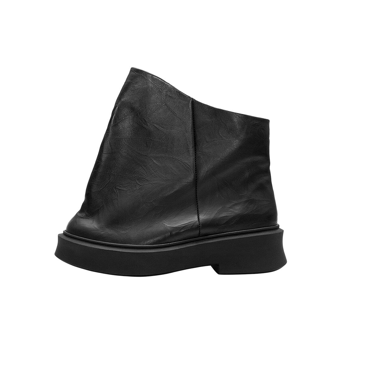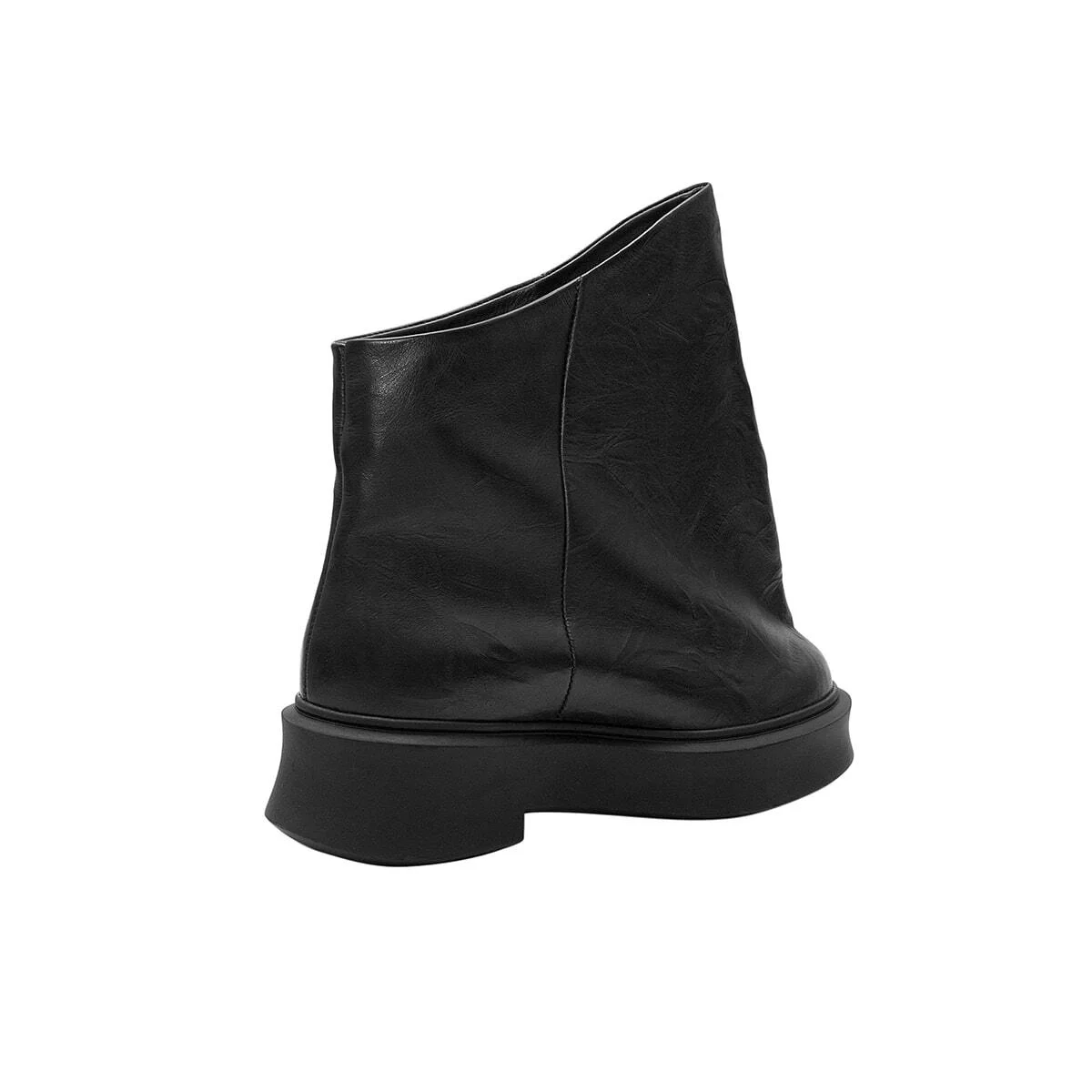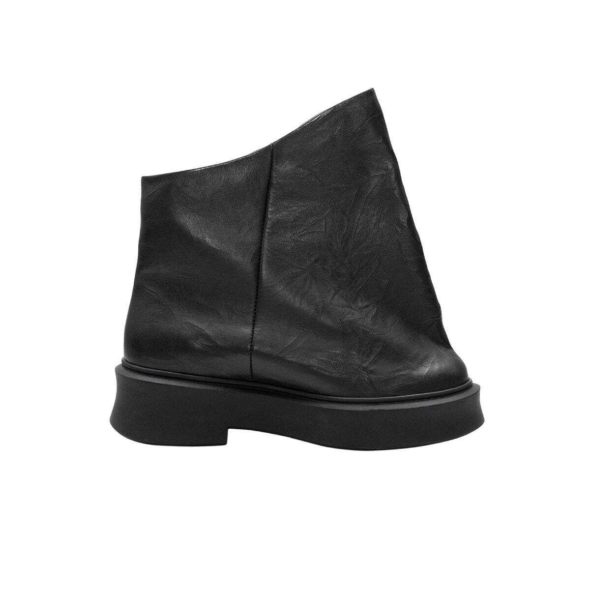 Остроносые асимметричные кожаные ботинки без шнурков. Жатая кожа. Широкое голенище. Подошва EVA, низкий каблук.