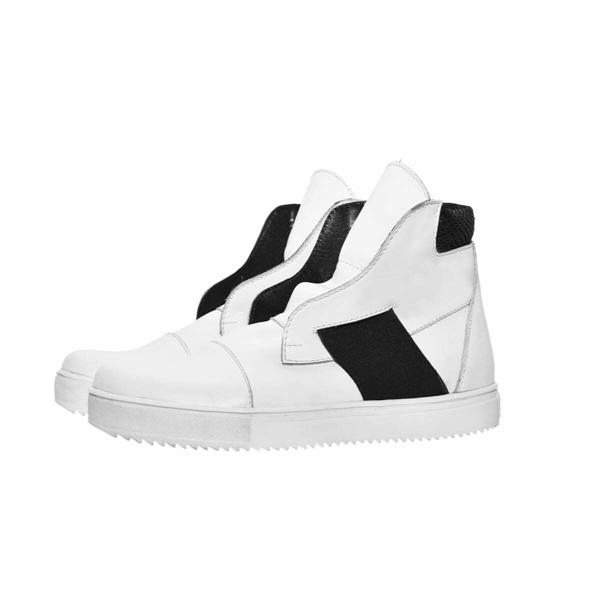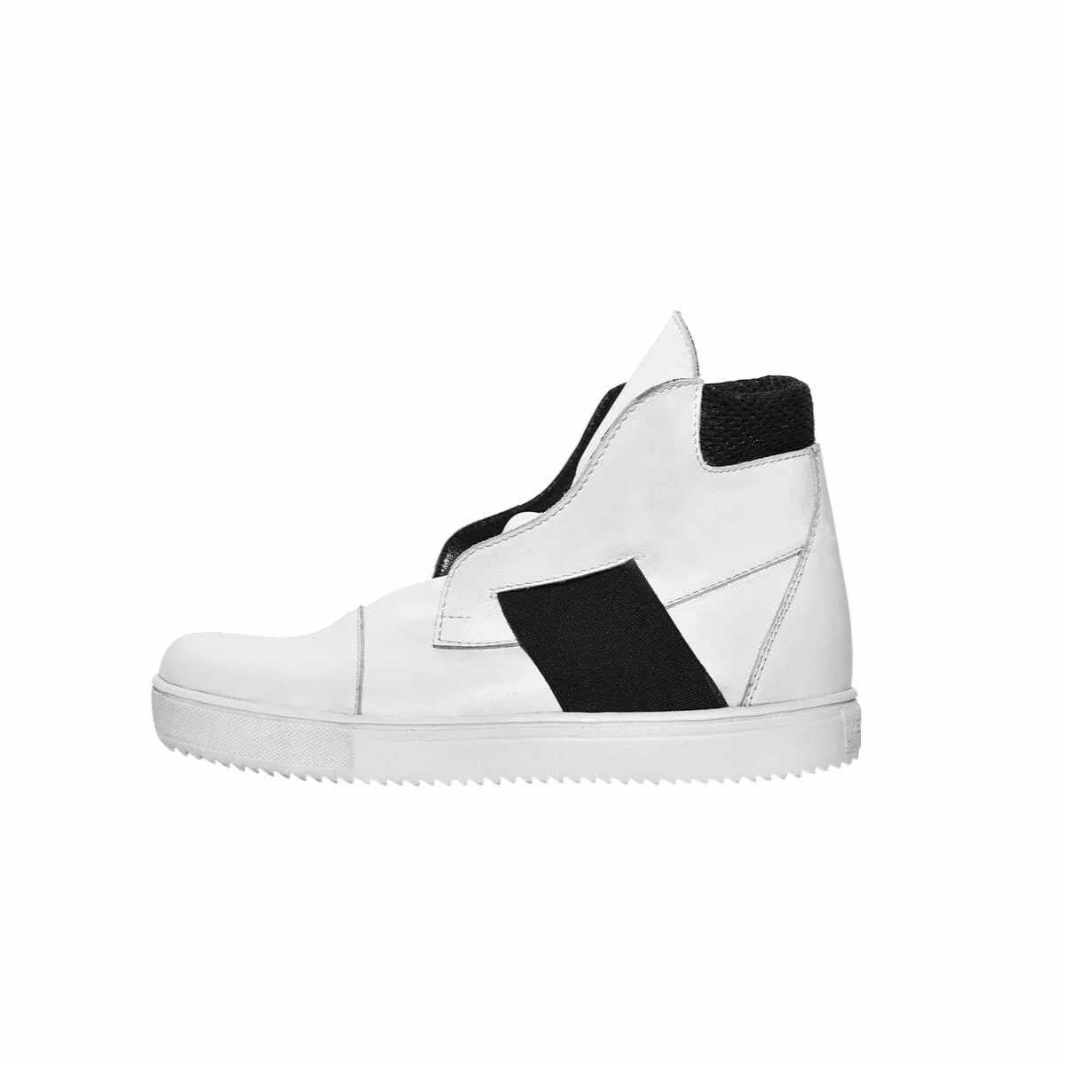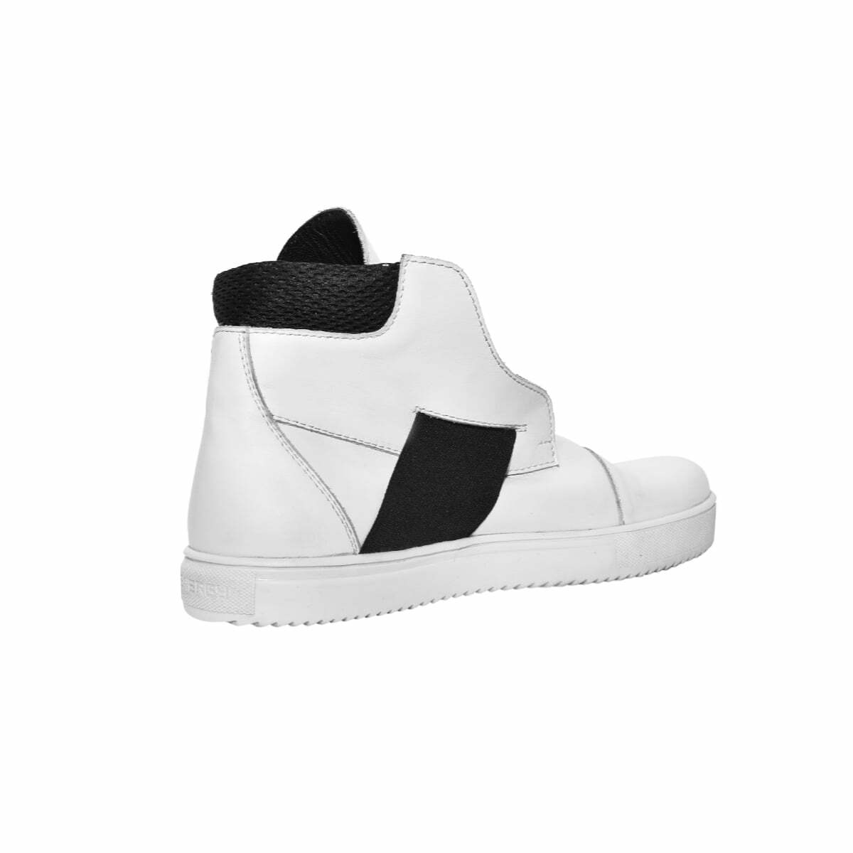 Высокие кожаные кеды без шнурков. С мягкой деталью на заднике. Эластичный ремешок по центру, под язычком. Подошва из легкой износостойкой резины ТЭП