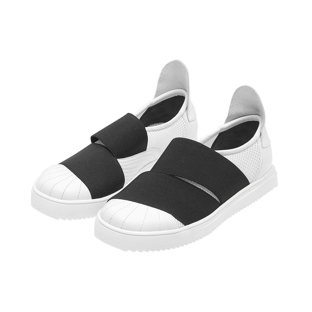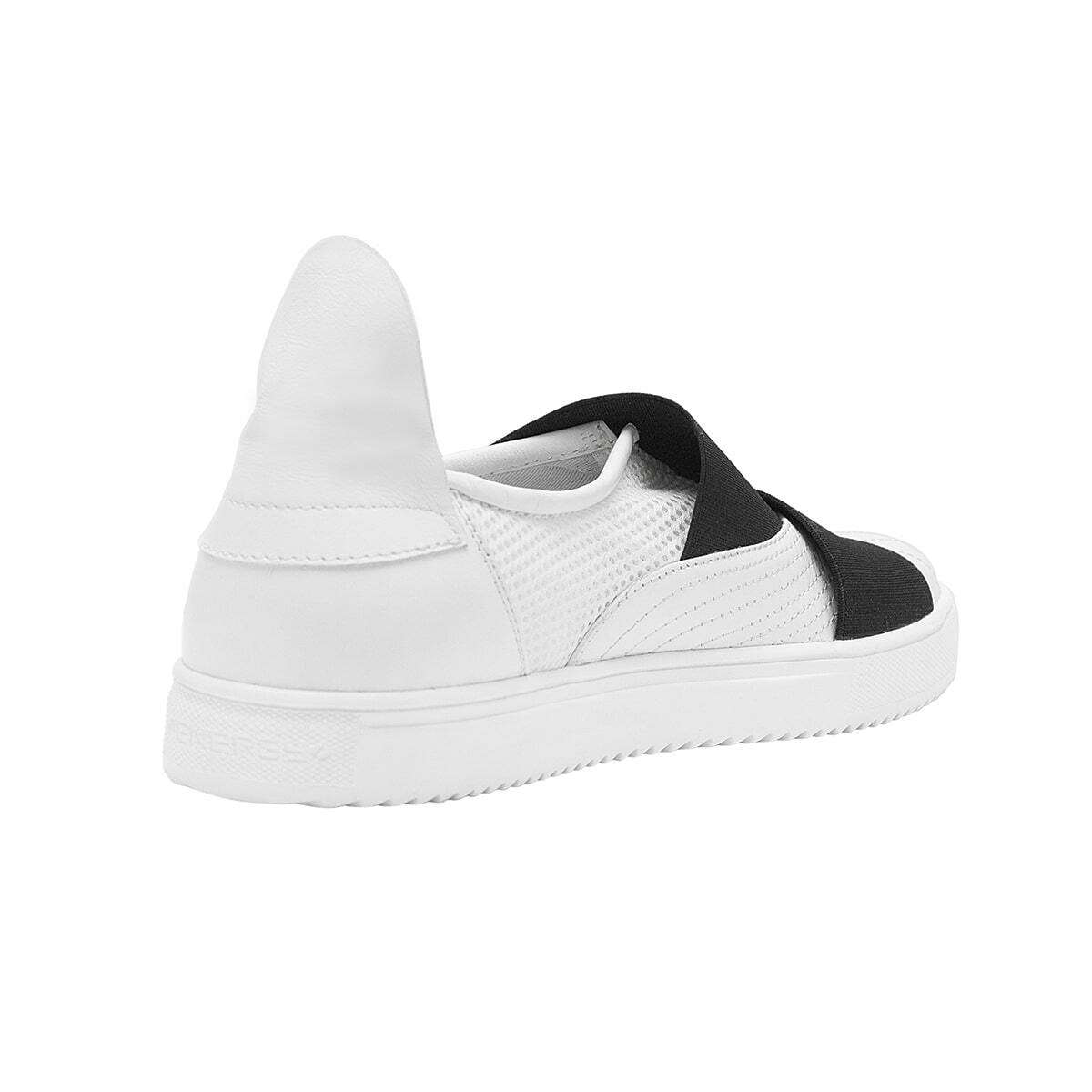 Кеды без шнурков с кожаным носком и задником. Декоративная строчка на носке и высокий язычок на заднике. Два эластичных ремешка поверх сетки. Подошва из легкой износостойкой резины ТЭП.