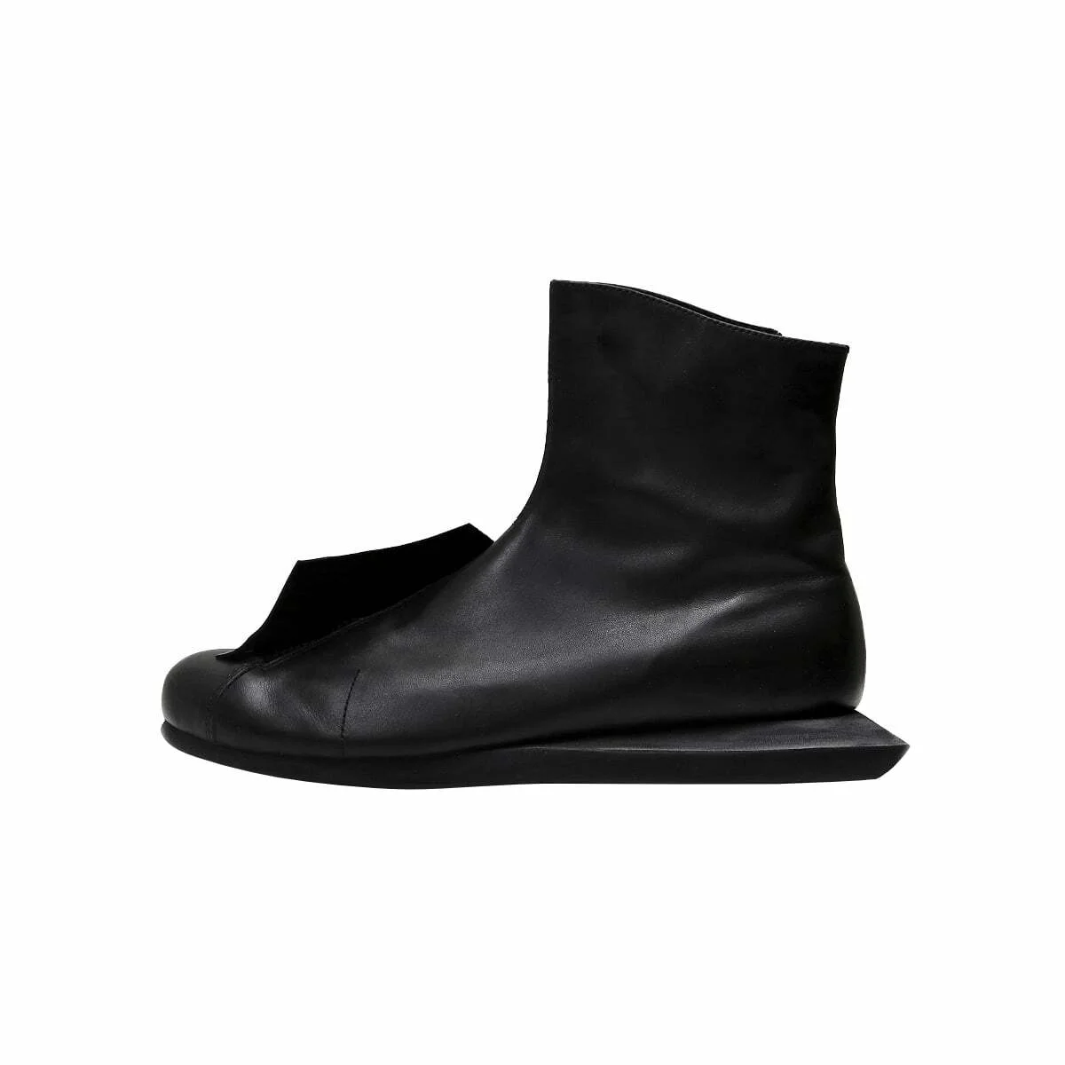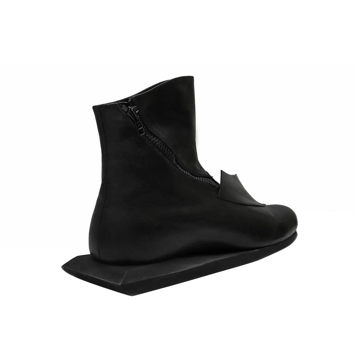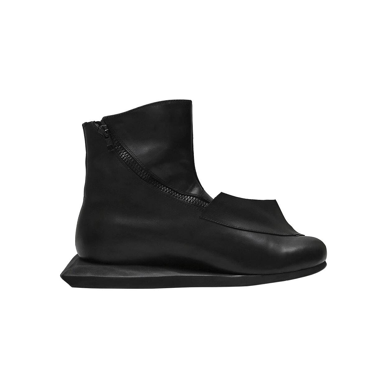 Кожаные ботинки с острым носом. Скошенный каблук, напечатанный с помощью 3-D принтера. Функциональная молния сзади.