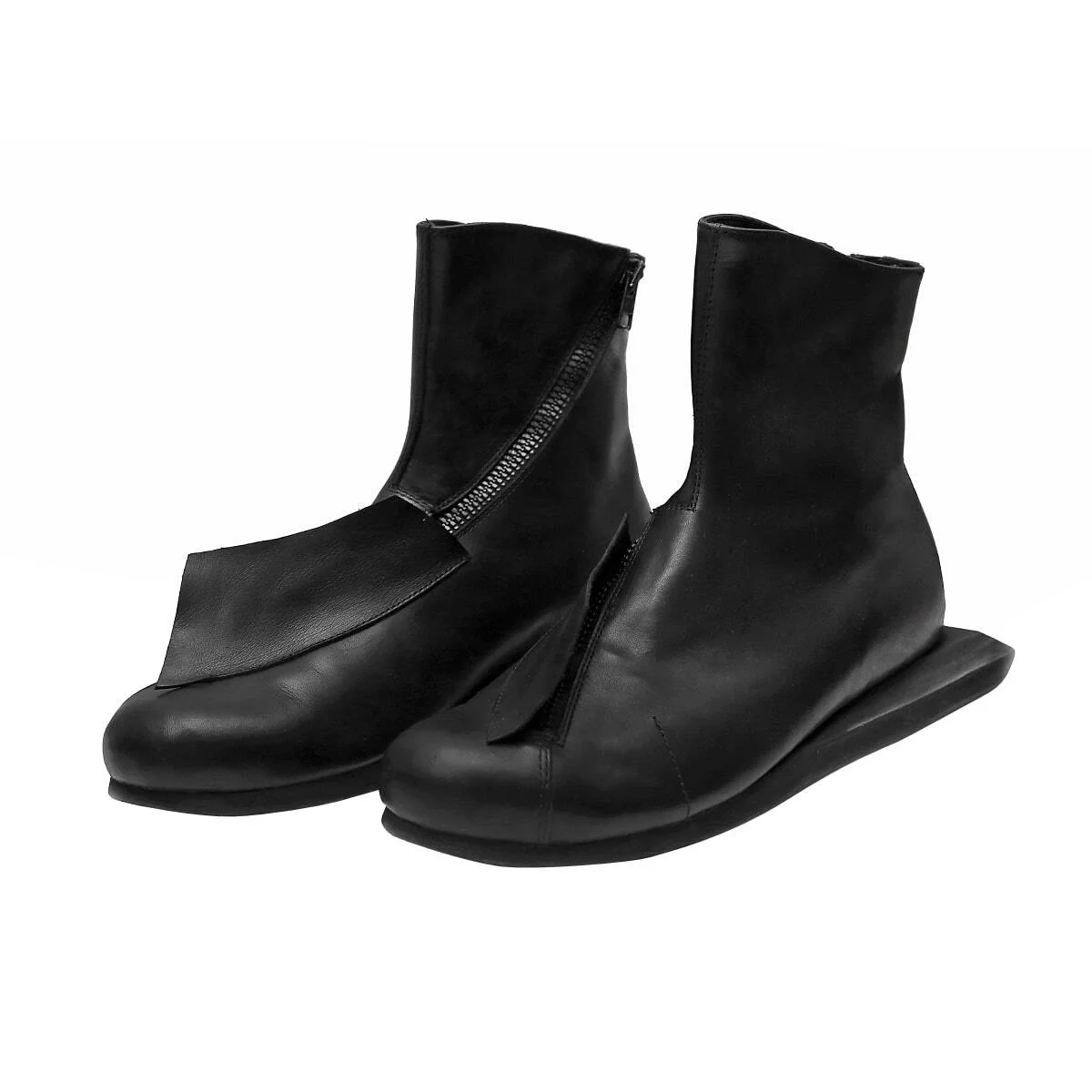 Высокие кожаные кеды с диагональной молнией и декоративным клапаном. Выступающая асимметричная подошва из легкого износостойкого материала Eva.