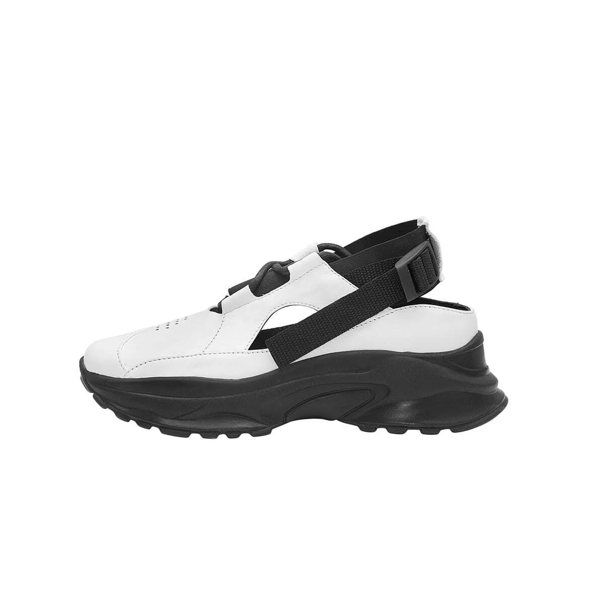 Кожаные сандалии с низкой пяткой, на резинке. Стропа и регулируемая застежка сзади. Перфорация на носу, функциональные шнурки. Подошва из легкого износостойкого материала PU.