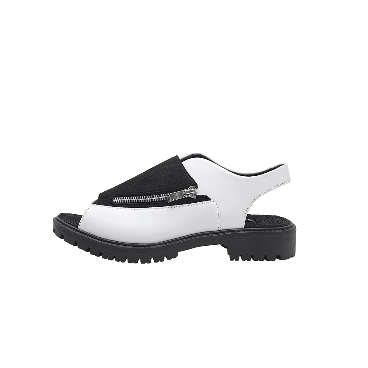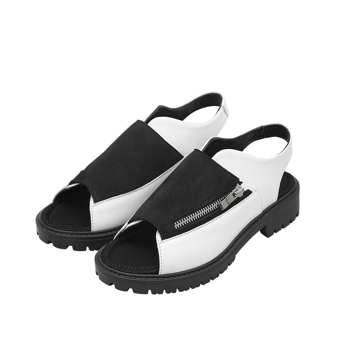 Кожаные сандалии с открытым носом, декорированы замшевой деталью на функциональной молнии спереди. Рельефная подошва из легкой износостойкой резины ТЭП, низкий каблук.
