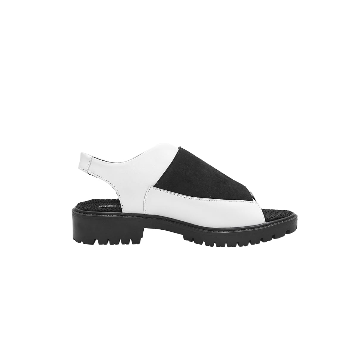 Кожаные сандалии с низкой пяткой, на резинке. Стропа и регулируемая застежка сзади. Перфорация на носу, функциональные шнурки. Подошва из легкого износостойкого материала PU.