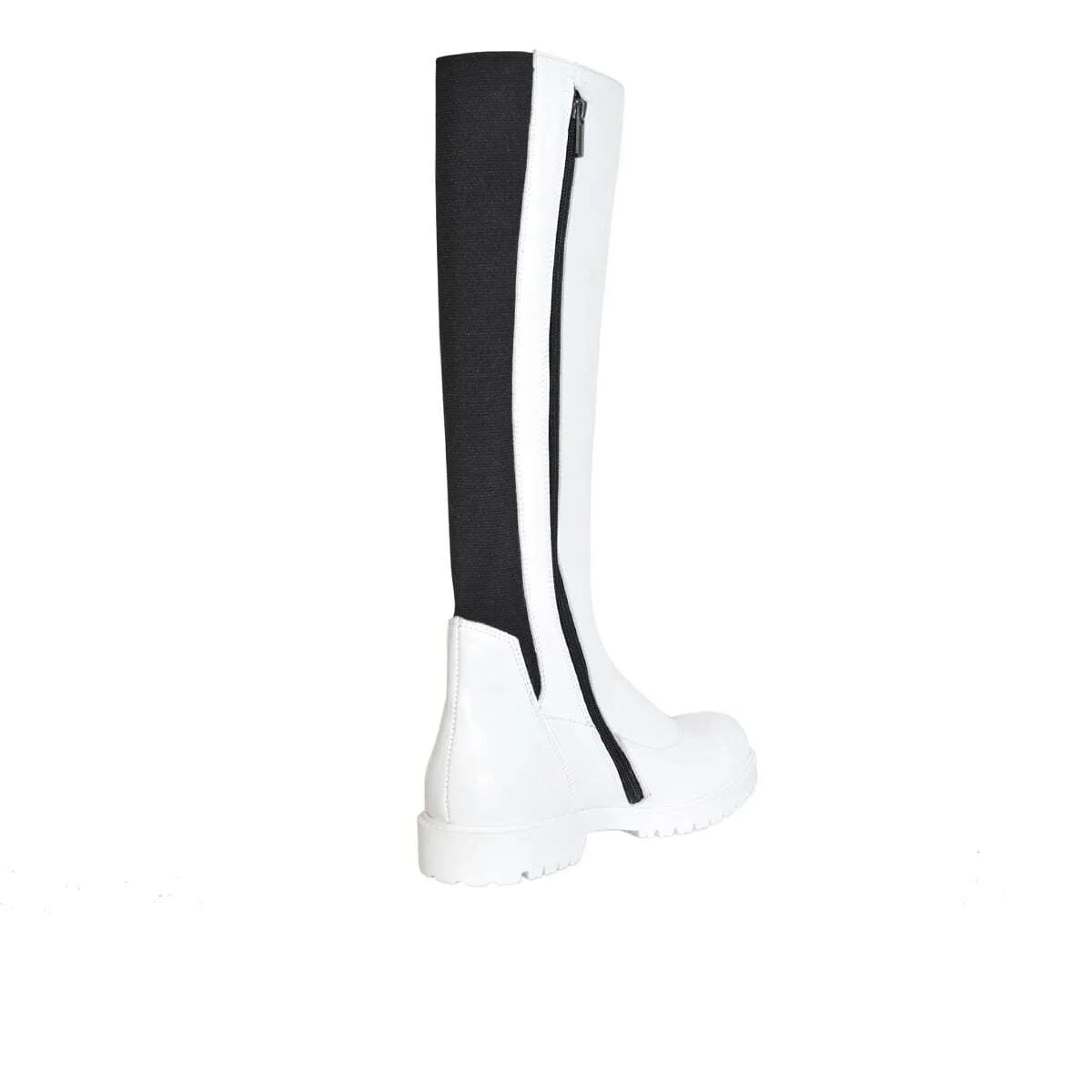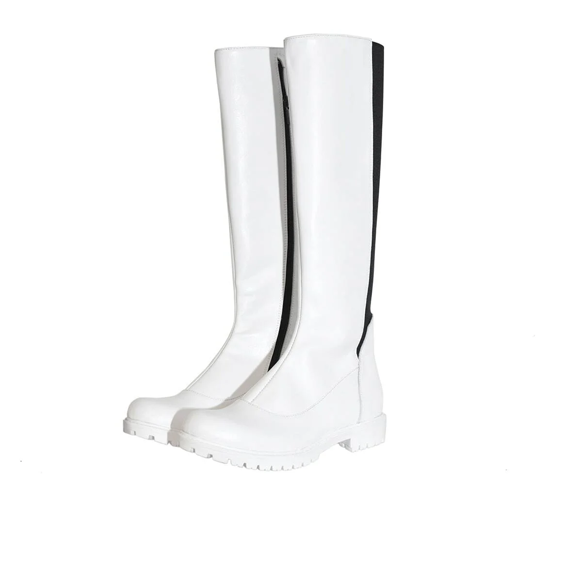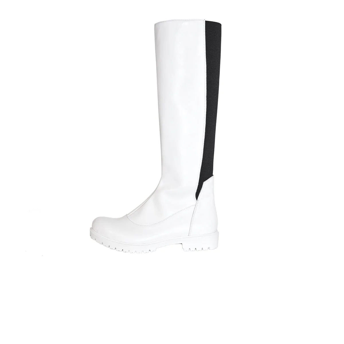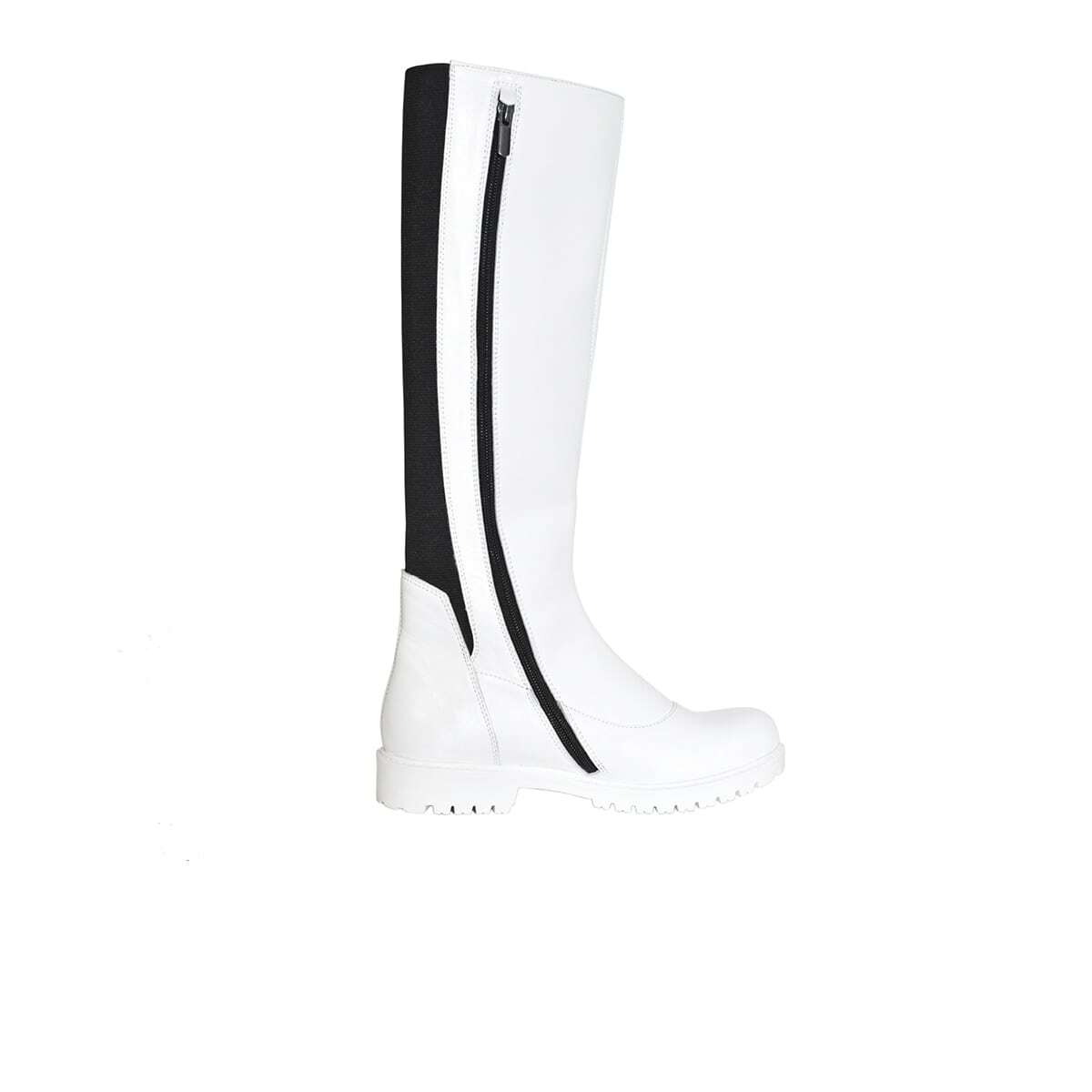 Высокие кожаные сапоги с широким голенищем и эластичной резинкой в области икр. Боковая скрытая молния. Рельефная подошва из легкого износостойкого материала PU.