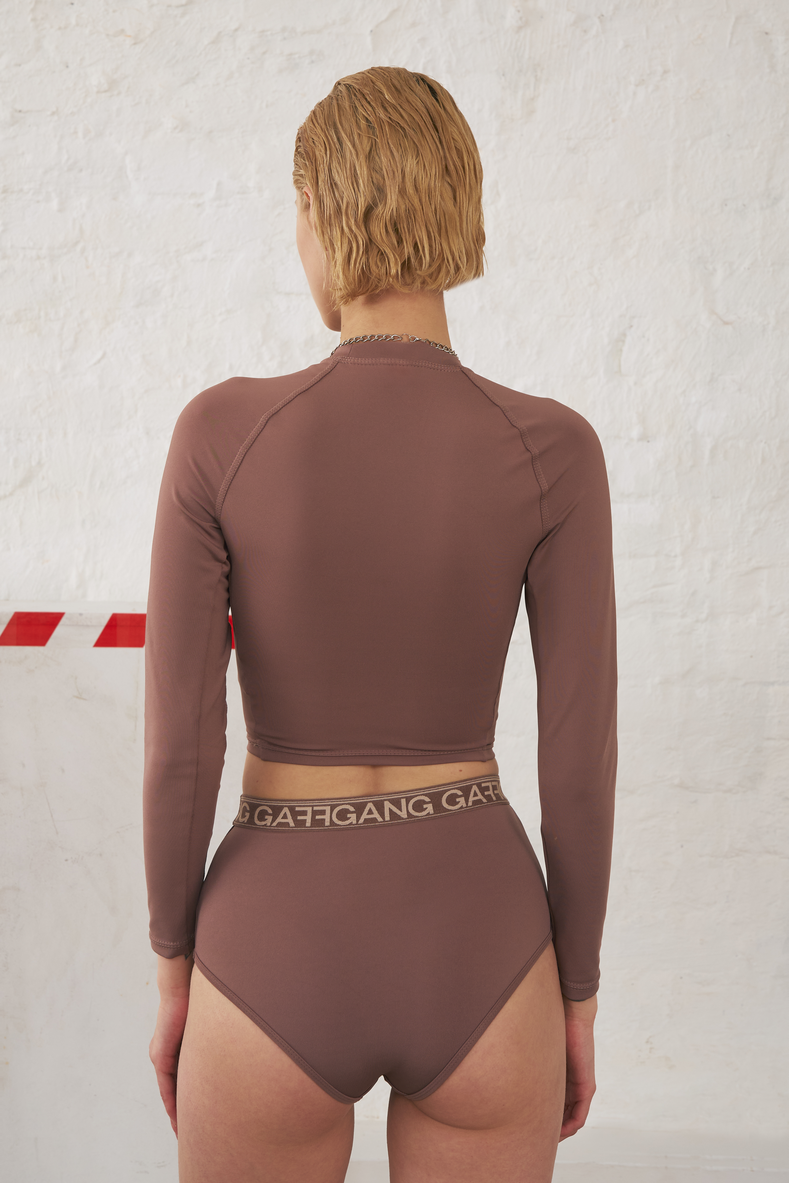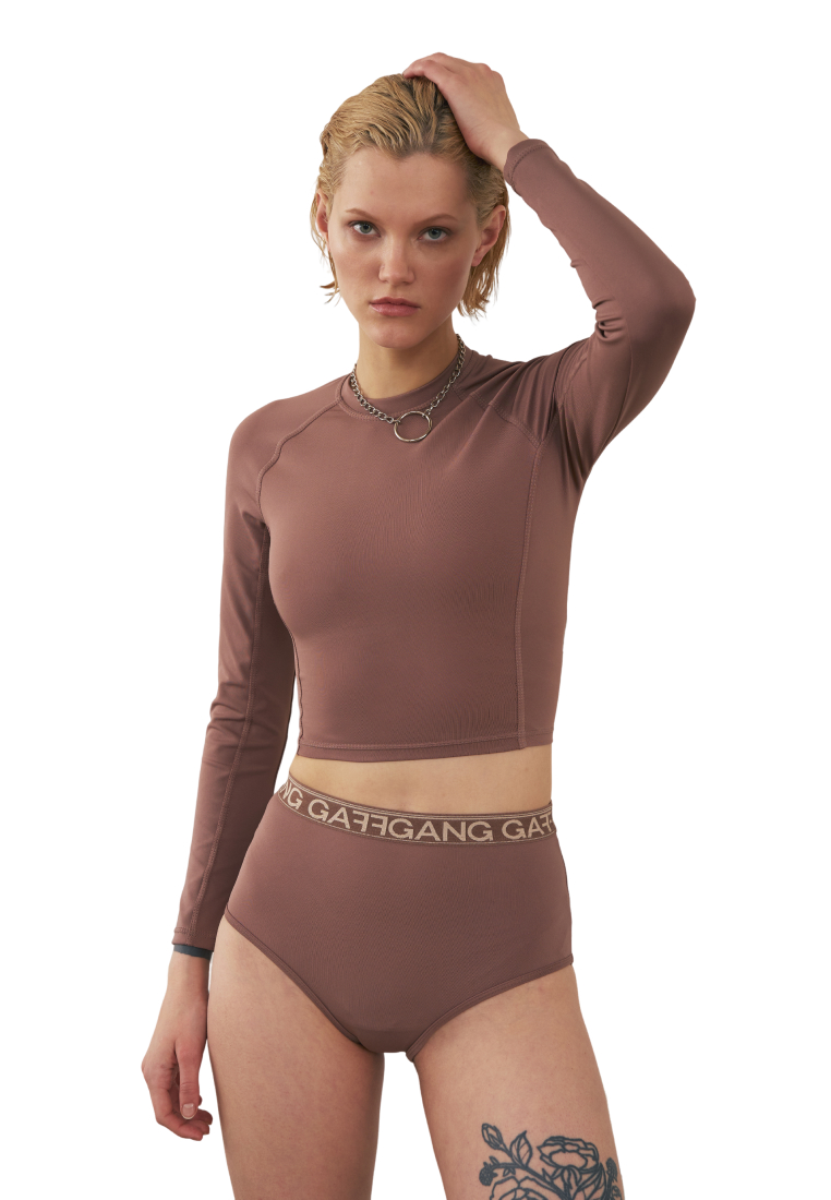 Рашгард выполнен из бифлекса в окрасе какао. Укороченный и облегающий. Идеален для любых тренировок, прогулок, для многослойных образов.