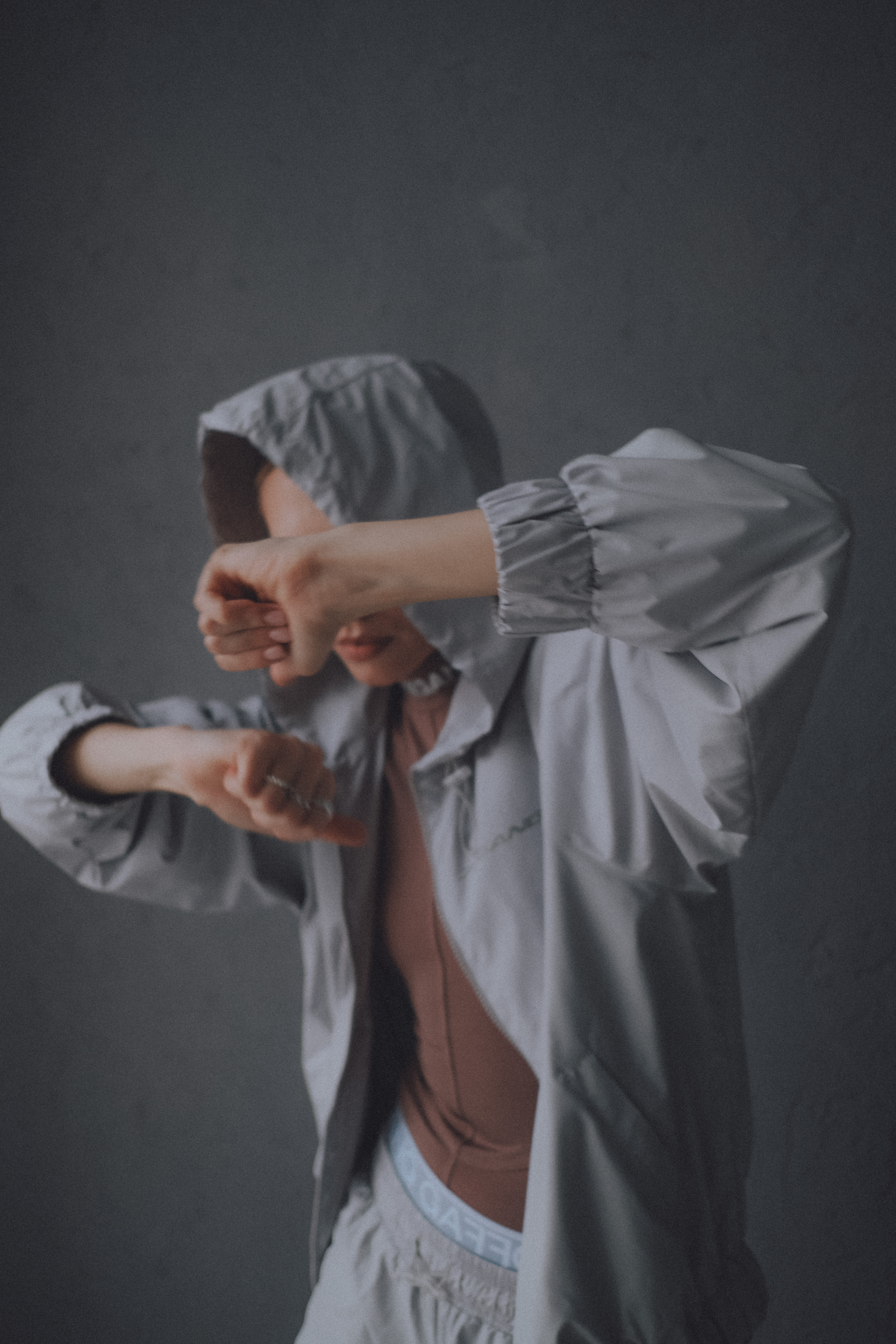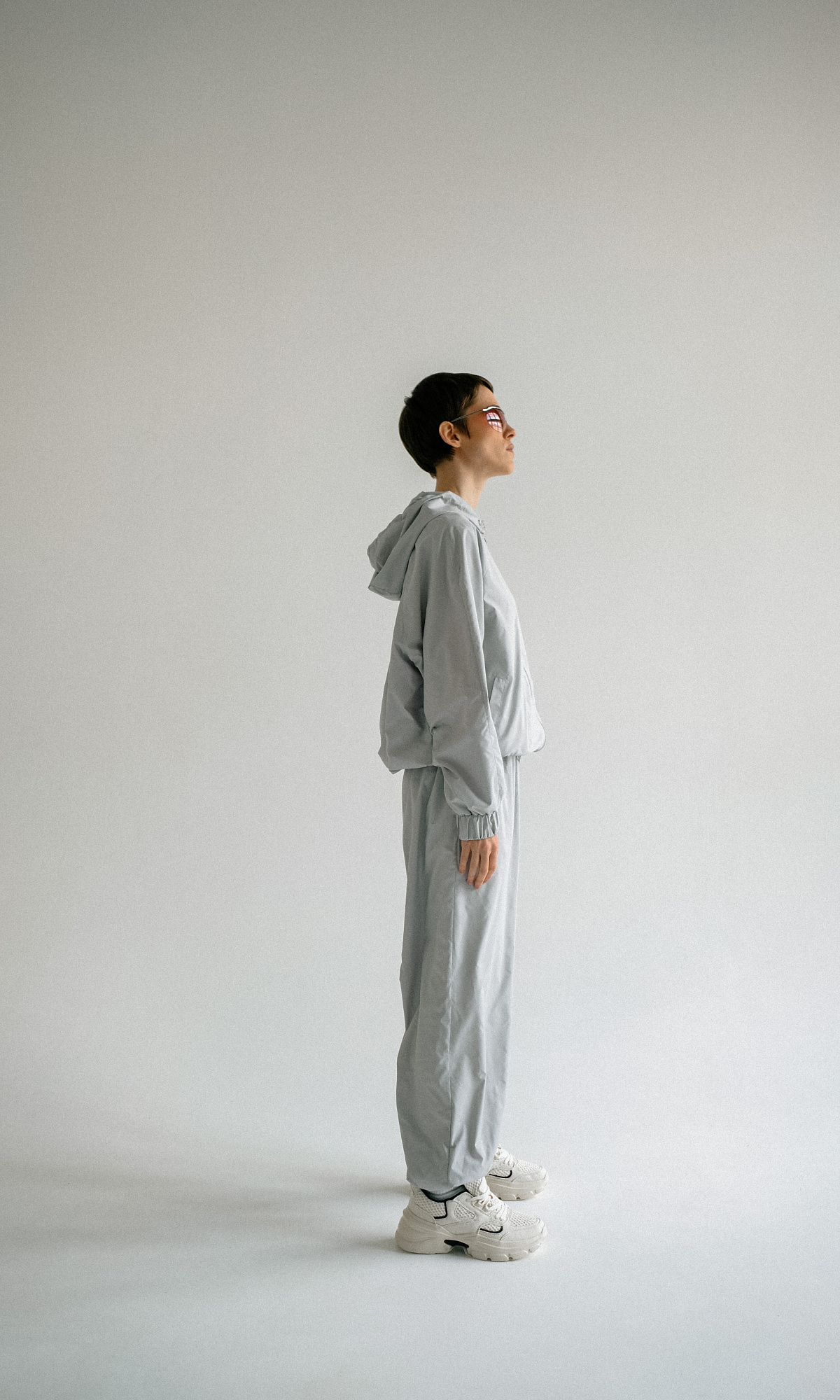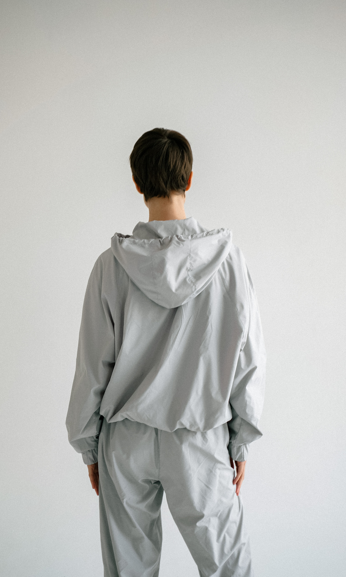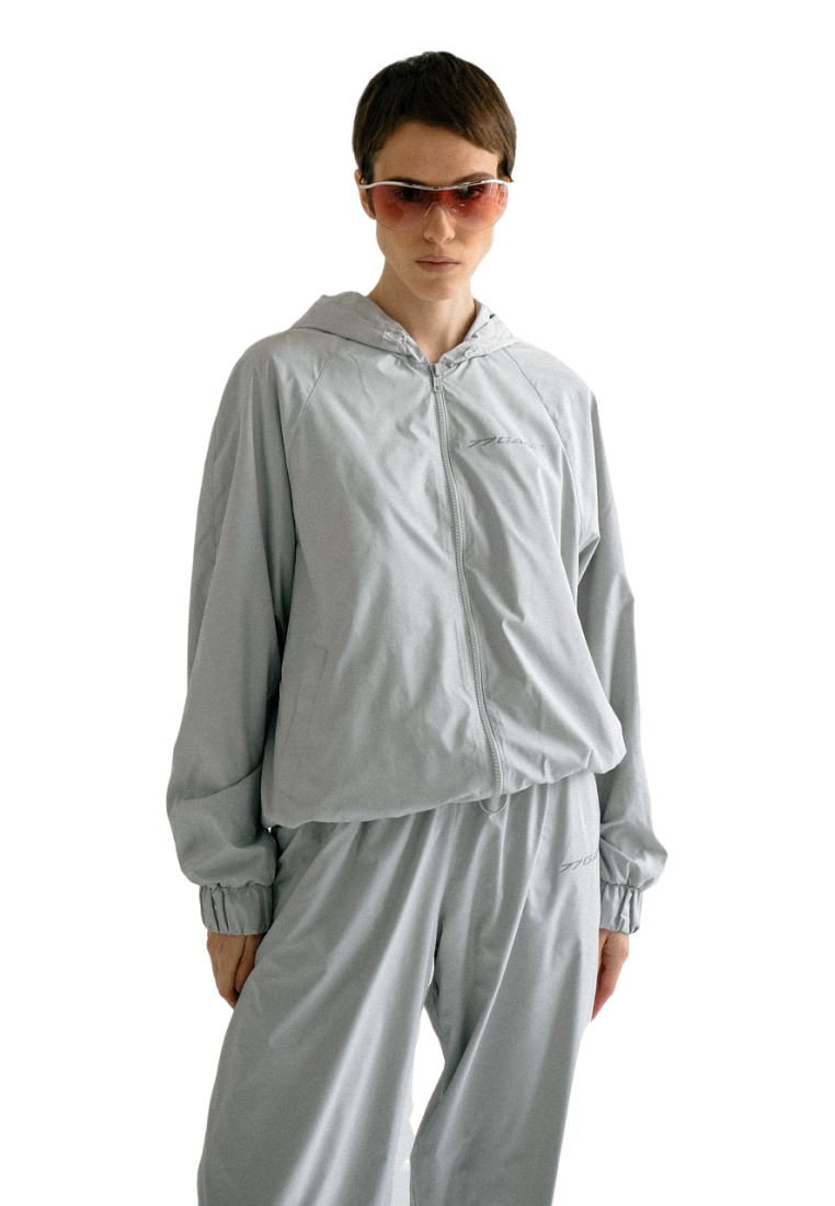 Женский костюм из плащевой ткани в окрасе матовый альбинос. Ветровка свободного кроя. Пояс и манжеты на эластичной резинке. Брюки в спортивном стиле. Талия и по нижнему краю - на эластичной резинке. В боковых швах карманы на молнии. Пояс ветровки и брюк дополнен брендированной резинкой. Способ печати лого: термопленка.