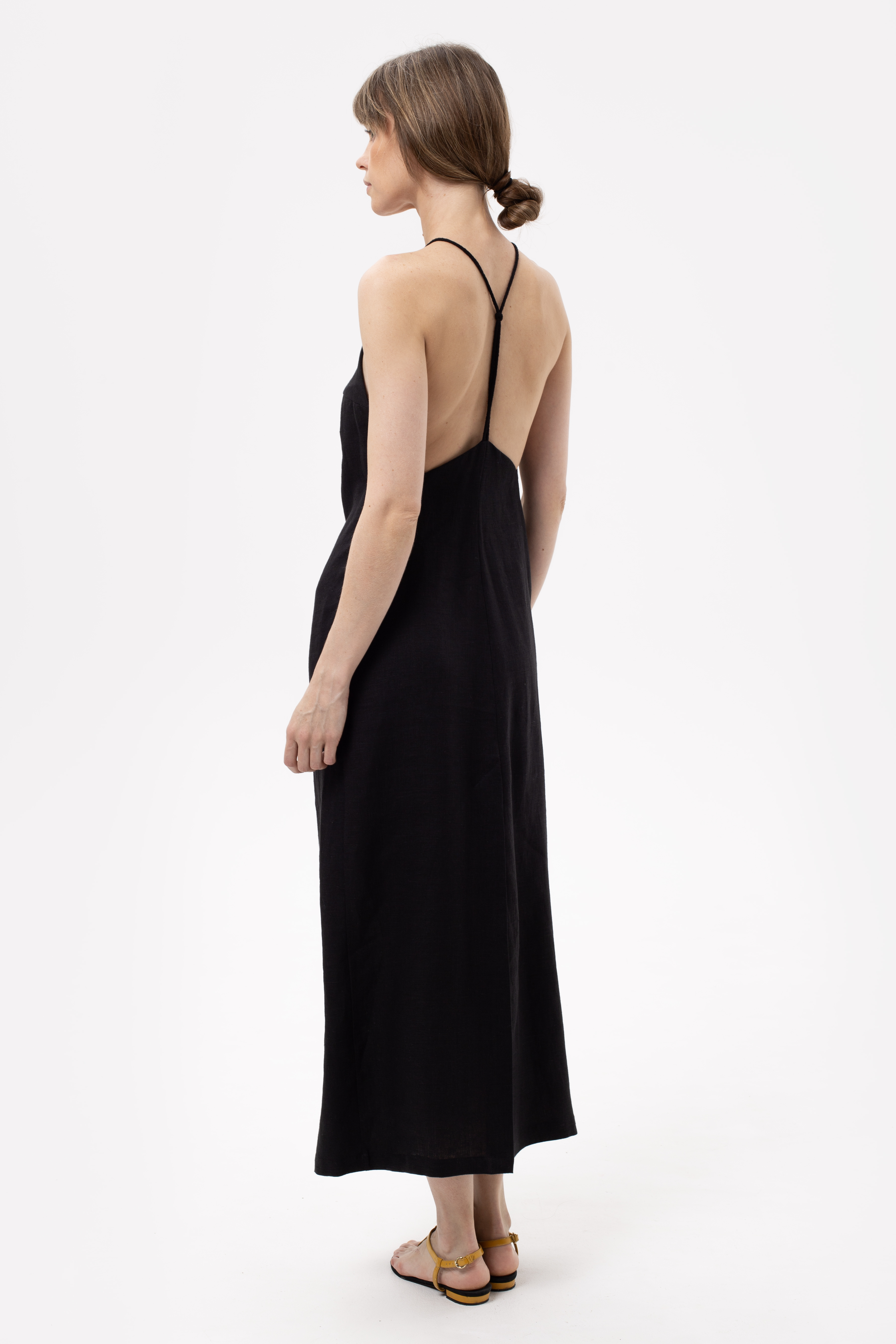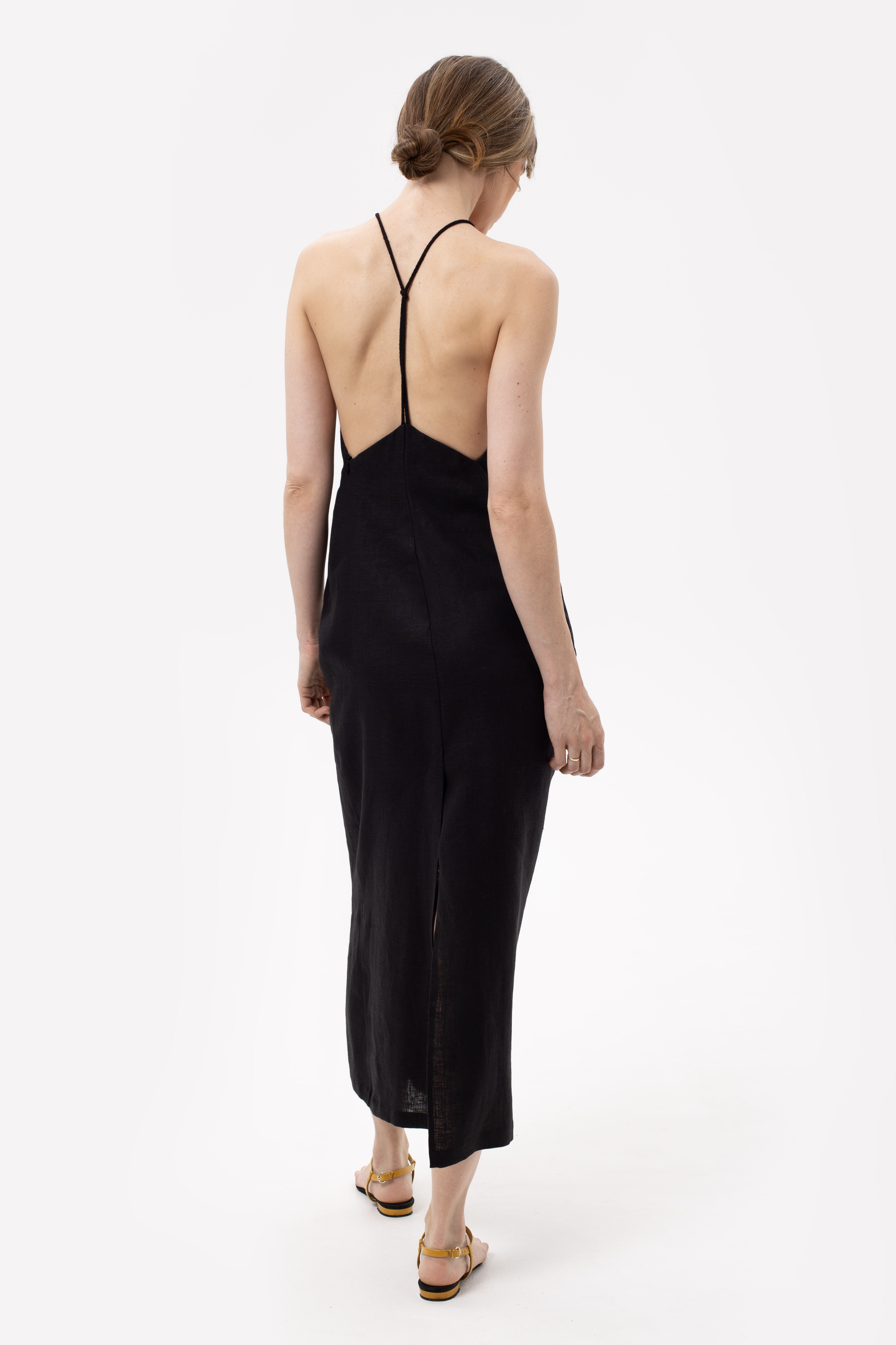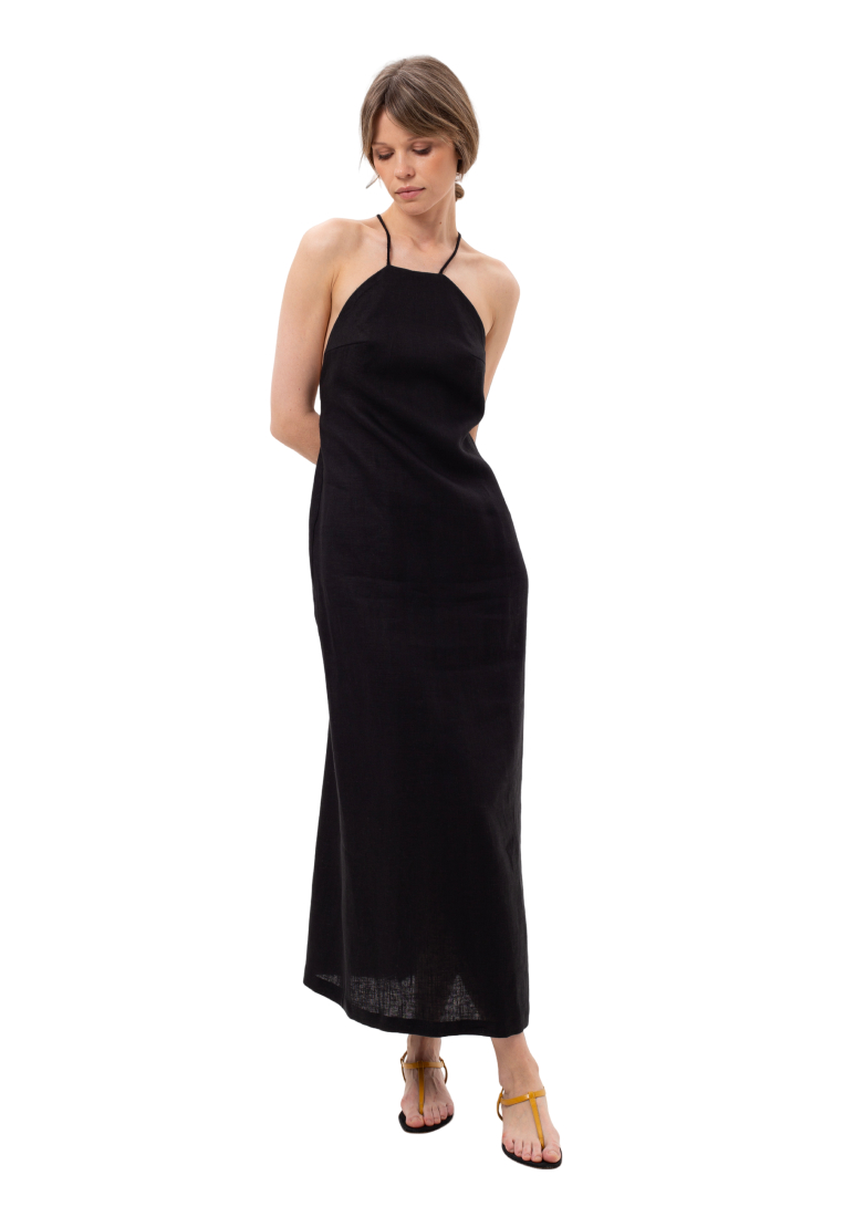 Льняное платье с открытой спиной, которое создано для того, чтобы Вы чувствовали себя "на отдыхе", путешествуете ли Вы на яхте или вышли в ближайший магазин за вкуснейшим французским багетом. Изящное платье из тонкого и плотного льна для расслабленных летних образов с сандалиями и вьетнамками. Застежка на молнии в боковом шве спинки. Шлица на юбке сзади.