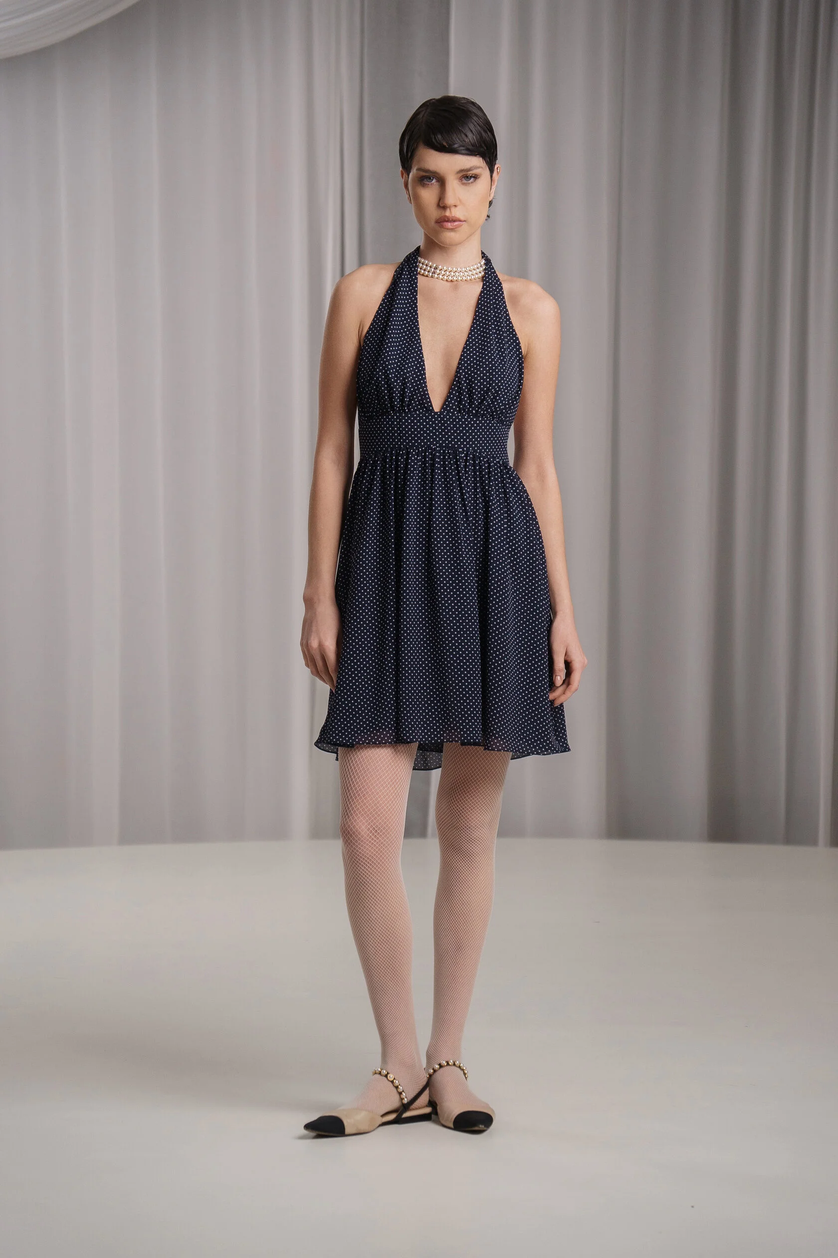 Платье в горошек с глубоким декольте "Audrey Dot" прекрасно передает дух стиля Одри Хепберн. Оно сочетает в себе элегантность и игривость, делая акцент на женственности и шарме. Это платье идеально подходит для особых случаев, когда вы хотите произвести незабываемое впечатление.