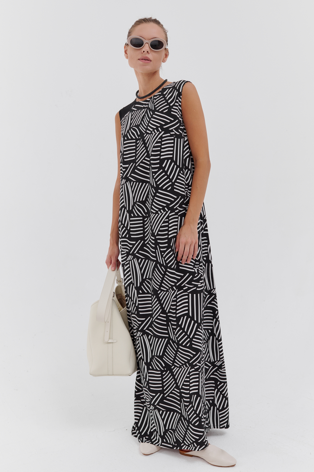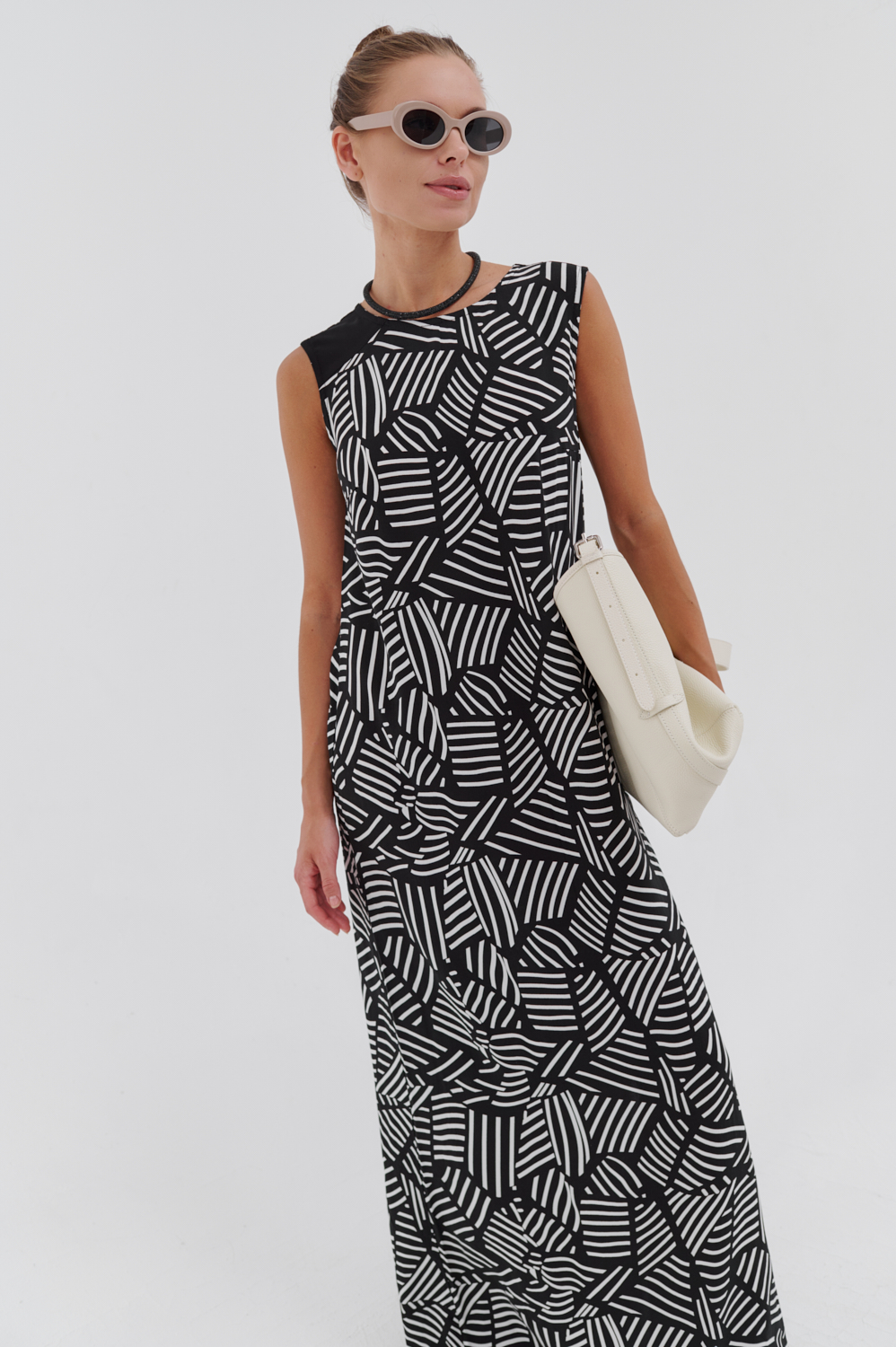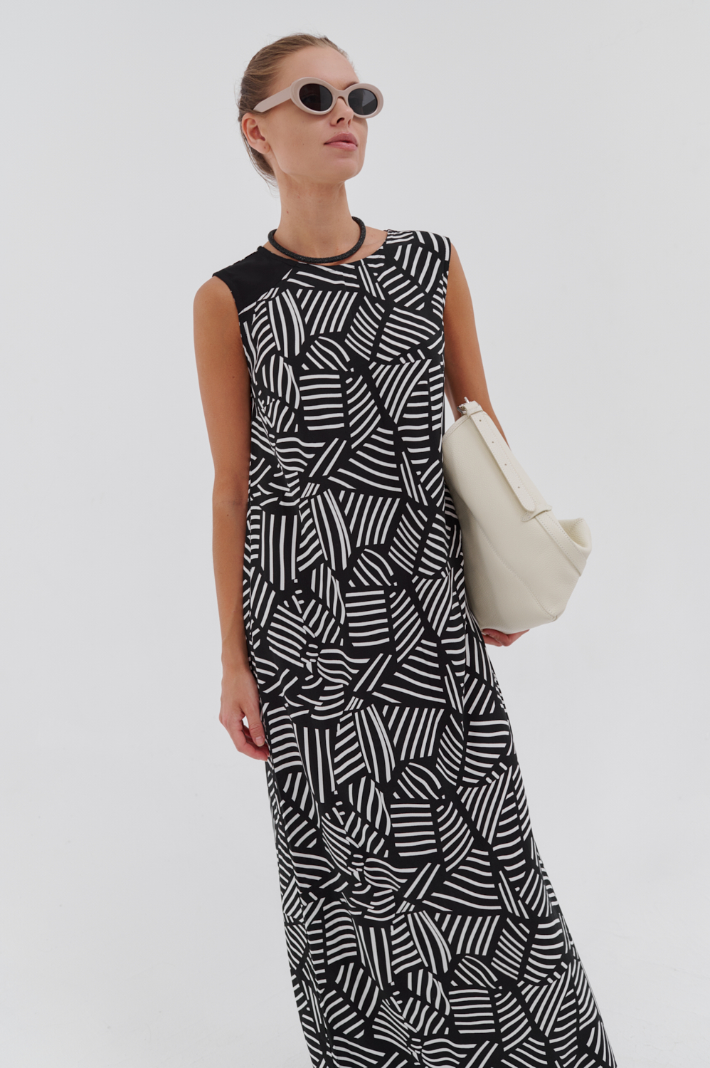 Эффектное платье Барселона в черном цвете с белой абстракцией — воплощение современной элегантности. Модель макси-длины с выразительным принтом из коллекции «Песок и камень» создает художественный акцент в образе. Идеально для вечерних выходов, арт-мероприятий или особых случаев, где важны стиль и индивидуальность.