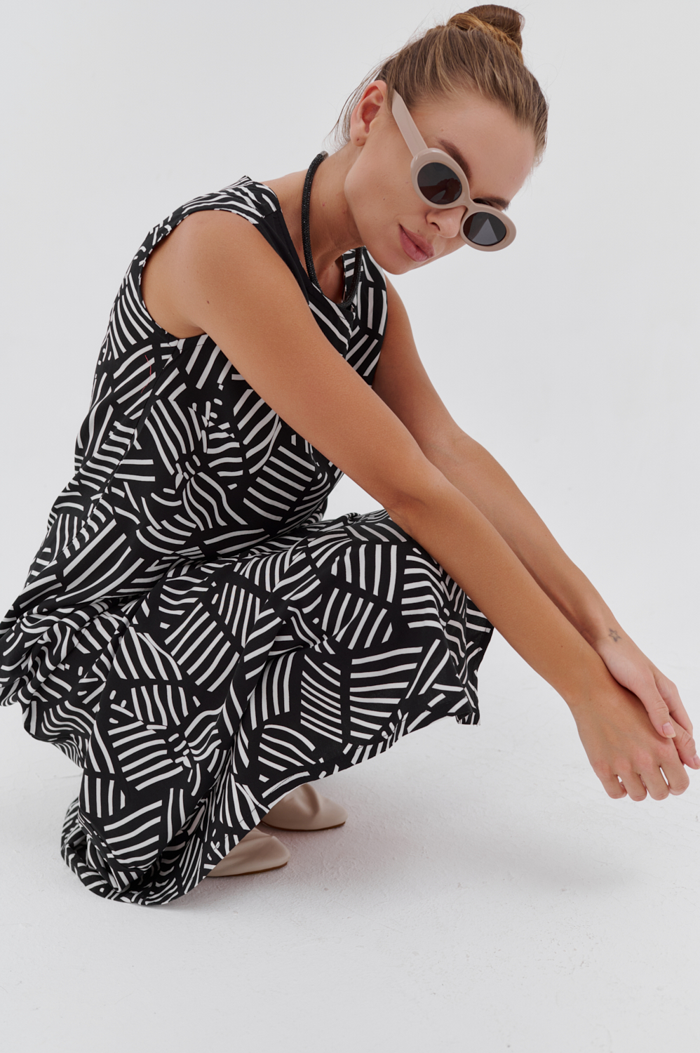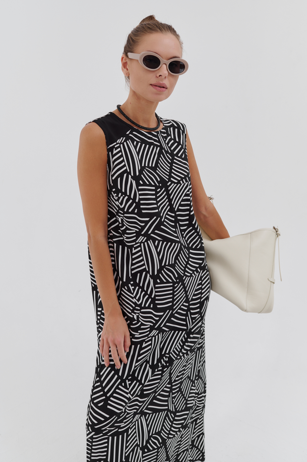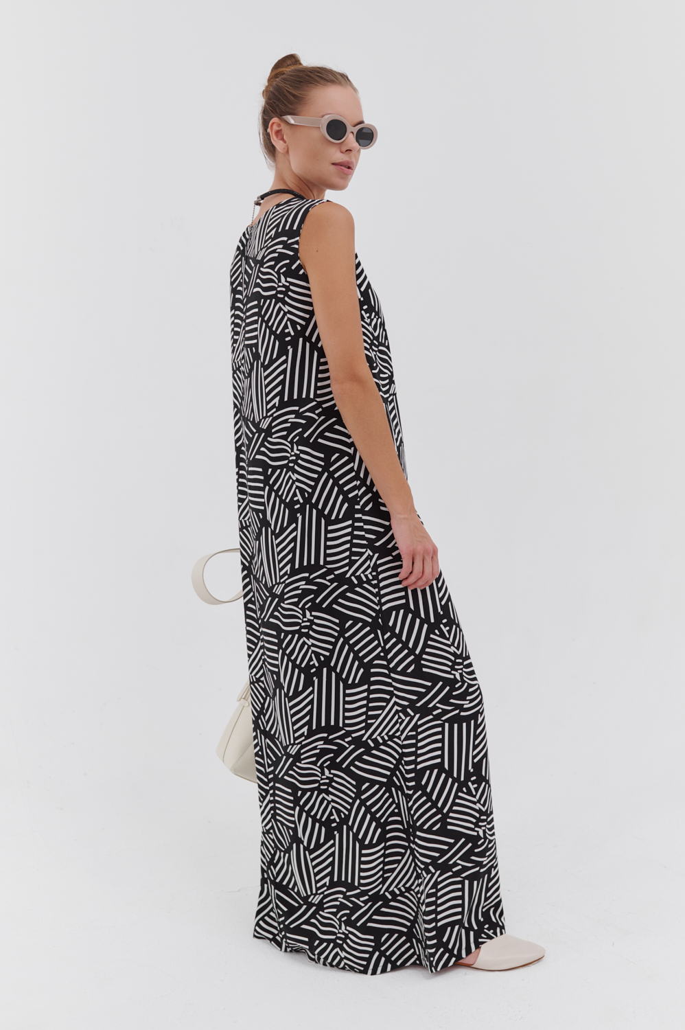 Эффектное платье Барселона в черном цвете с белой абстракцией — воплощение современной элегантности. Модель макси-длины с выразительным принтом из коллекции «Песок и камень» создает художественный акцент в образе. Идеально для вечерних выходов, арт-мероприятий или особых случаев, где важны стиль и индивидуальность.