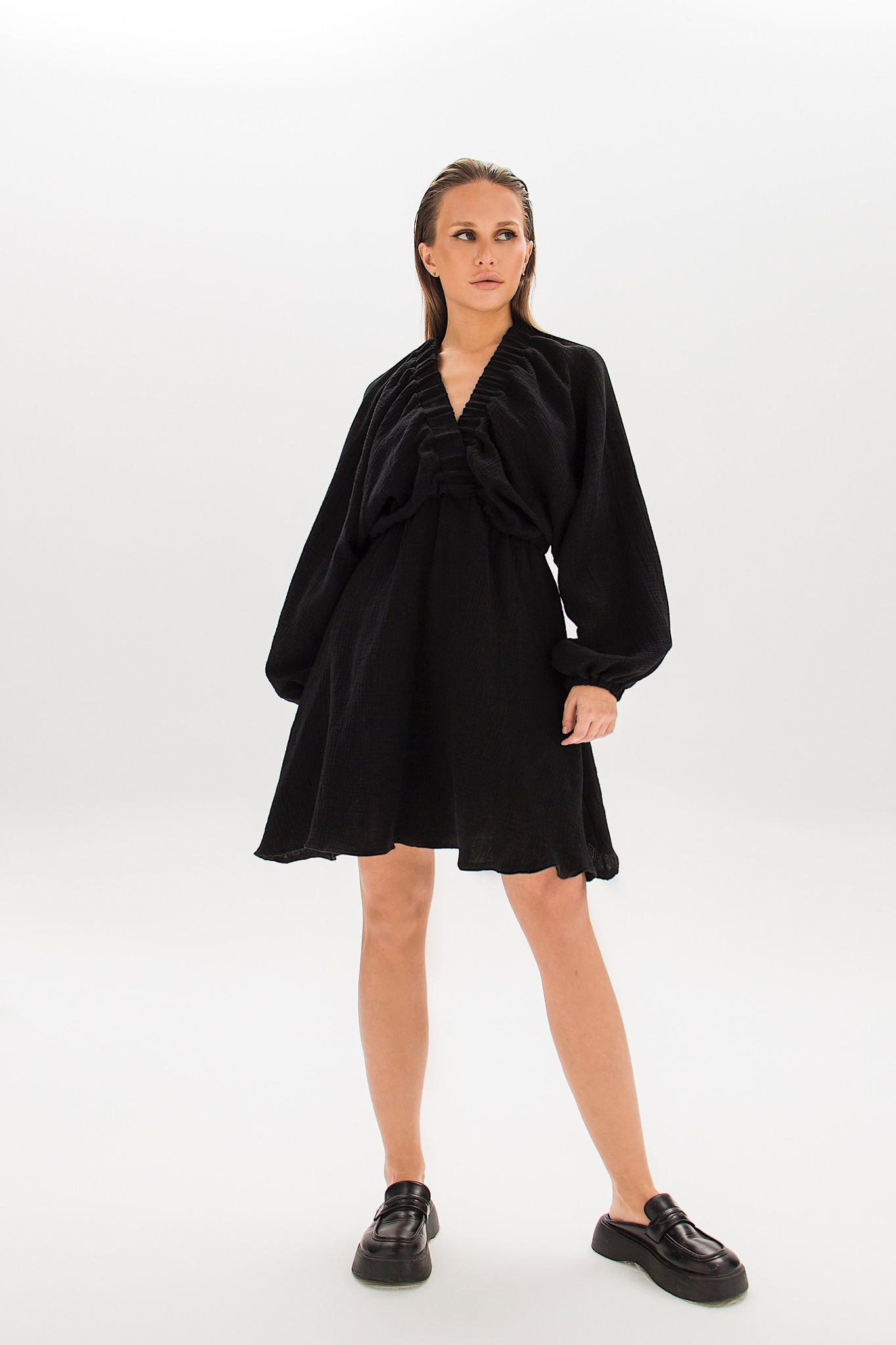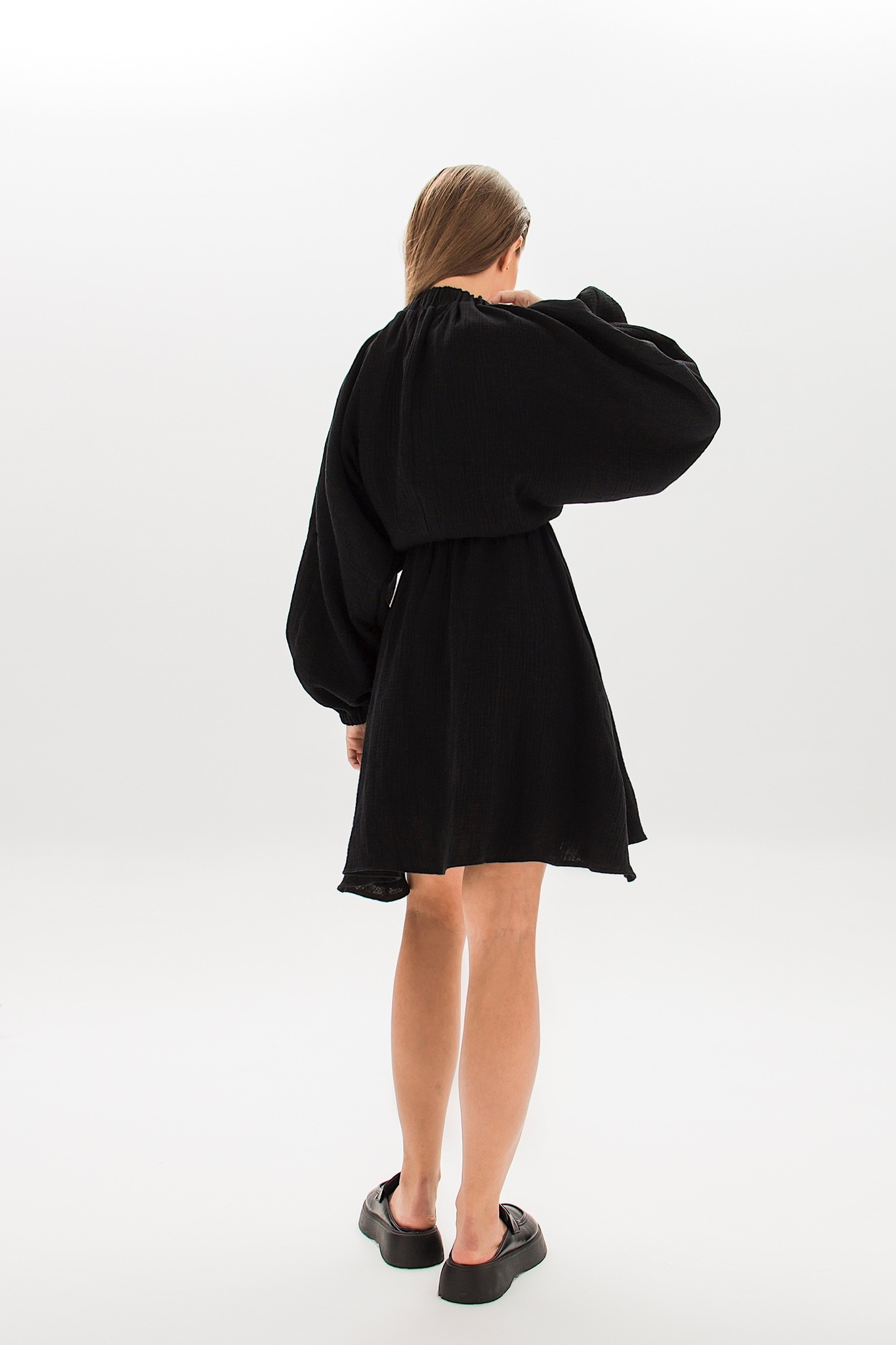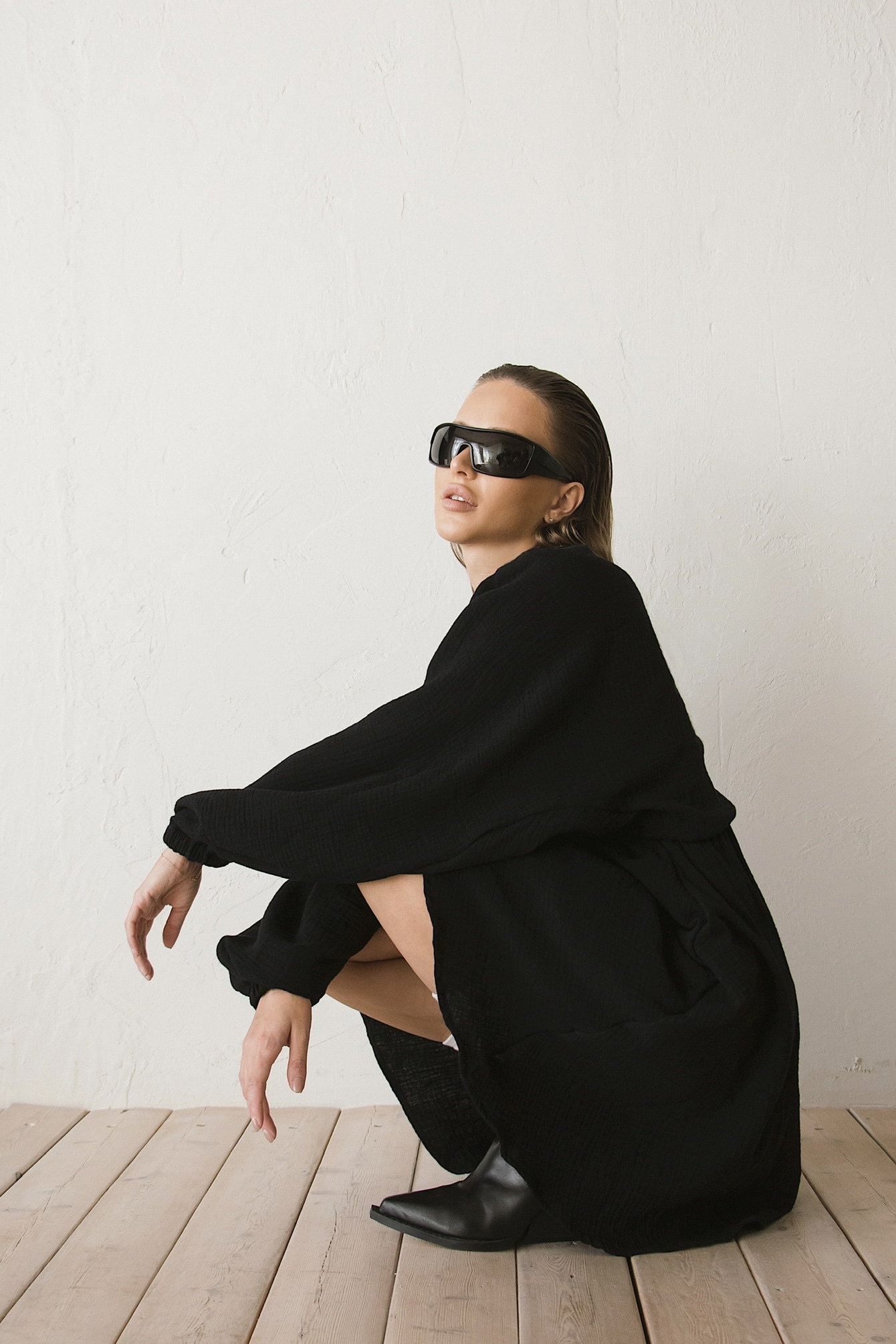 Платье украшено черными кисточками. Платье выполнено из более тонкого полотна и представлено в двух цветах: бежевый и графитовый. Рукава собраны на резинку. Стирать рекомендуется в мешке, чтобы не испортить декоративные элементы. Мешок представлен в упаковке. Размеры на модели: Графит - XS/S...