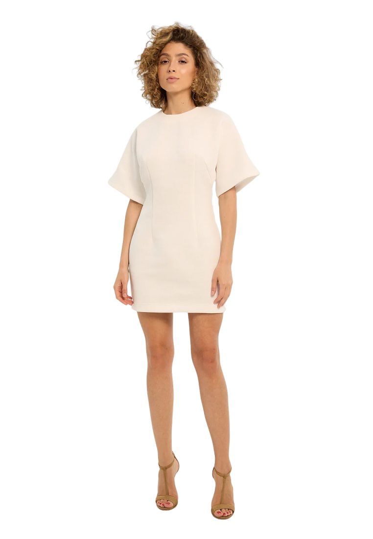 Платье с выраженным силуэтом песочные часы из формоустойчивого трикотажа. Вертикальные вытачки визуально вытягивают силуэт, а длина мини и короткий рукав делают акцент на женском изяществе.