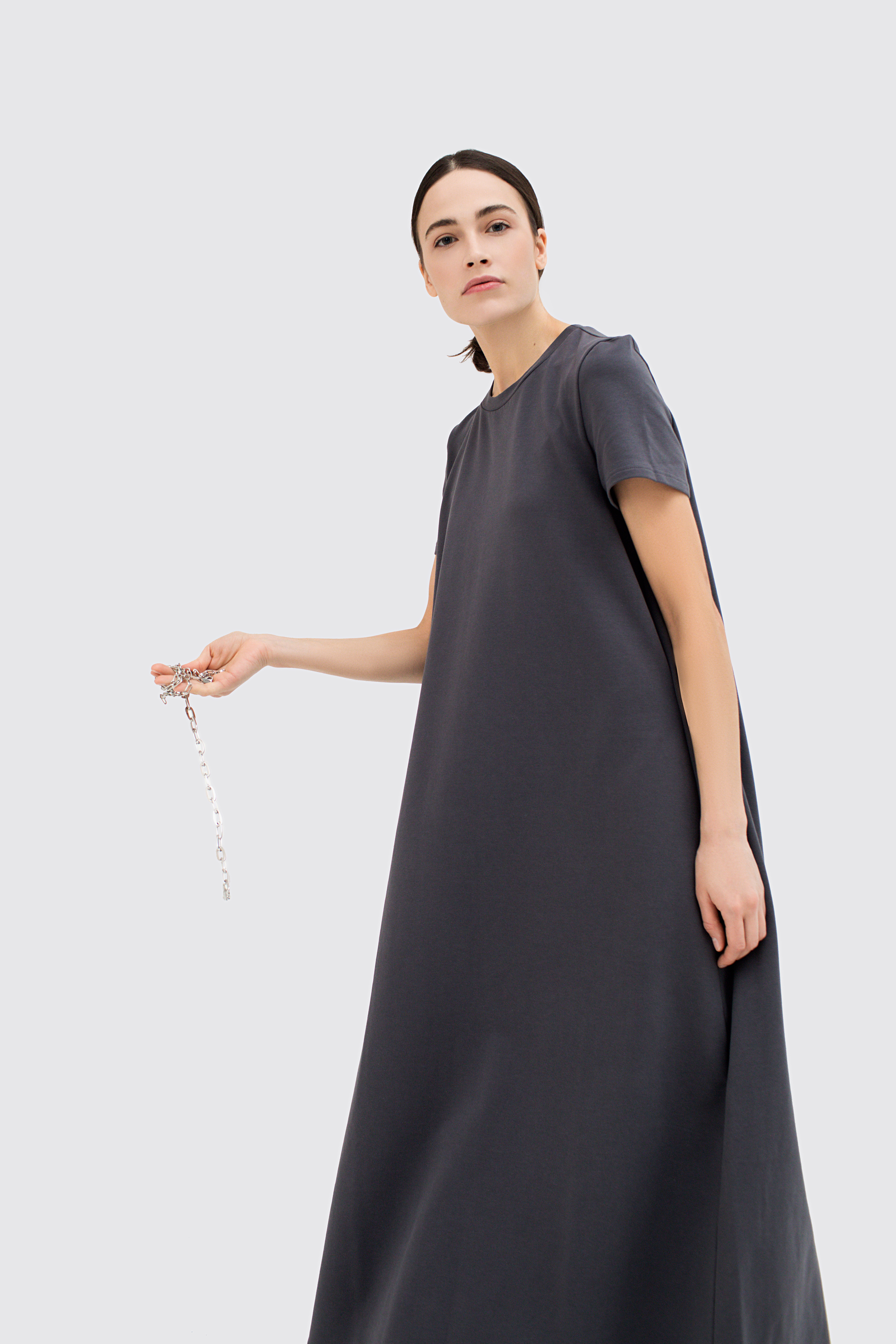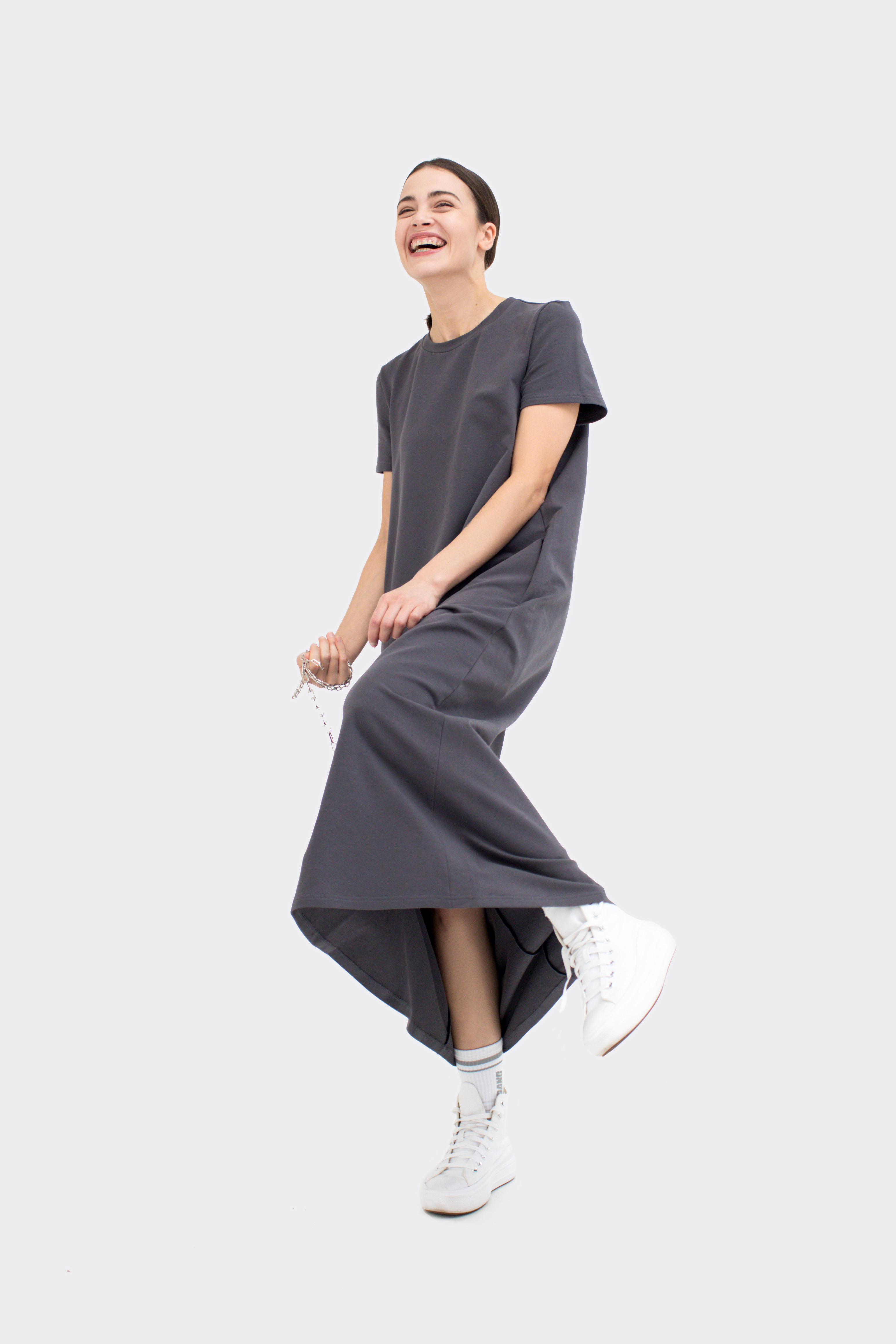Спортивное платье из футера двухнитки с футболочным верхом в графитовом окрасе. Параметры модели:Рост - 171 смРазмер: 44 (S)Уход:Важно соблюдать указанный температурный режим стирки и гладить с изнаночной стороны.
