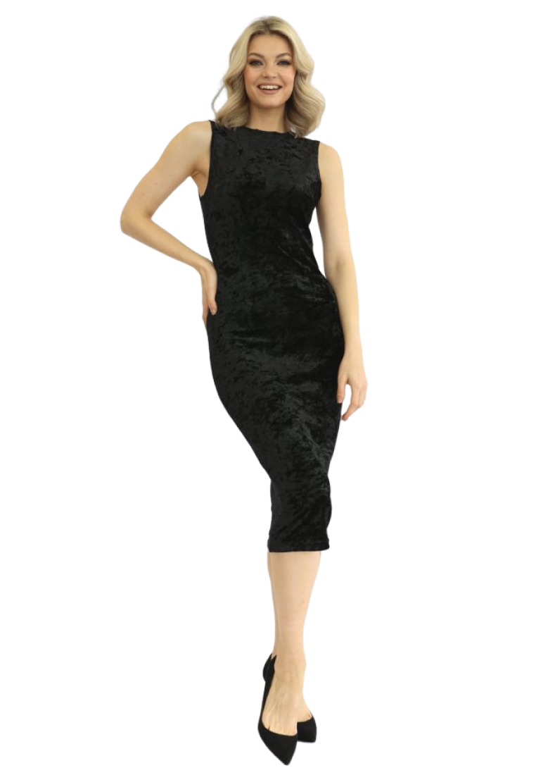 Платье-футляр без рукавов из бархата.Ткань: материал с мягким густым ворсом на лицевой стороне. Поверхность отличается легким блеском, меняет цвет в зависимости от угла освещения (хамелеон). Изнаночная сторона цветная. Полотно эластичное, при драпировке образует мягкие складки.