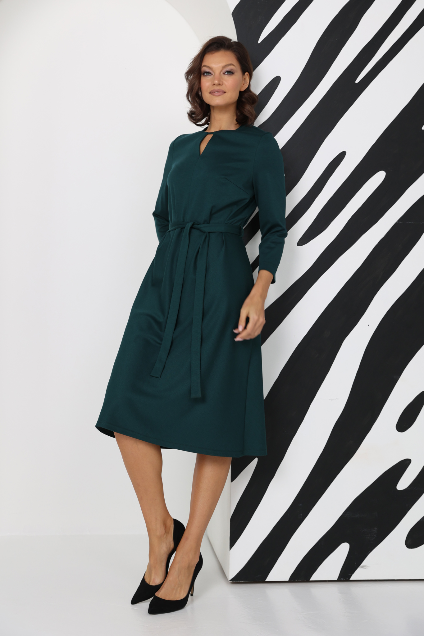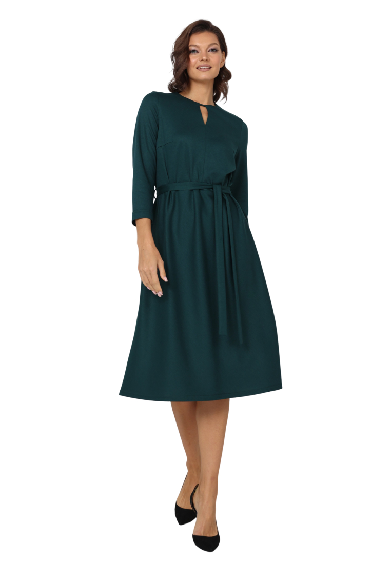 Платье миди отрезное по линии талии. Круглая горловина с вырезом-капелька. Втачной рукав 7/8. Пояс в комплекте.Ткань: трикотаж плательный Lacosta.