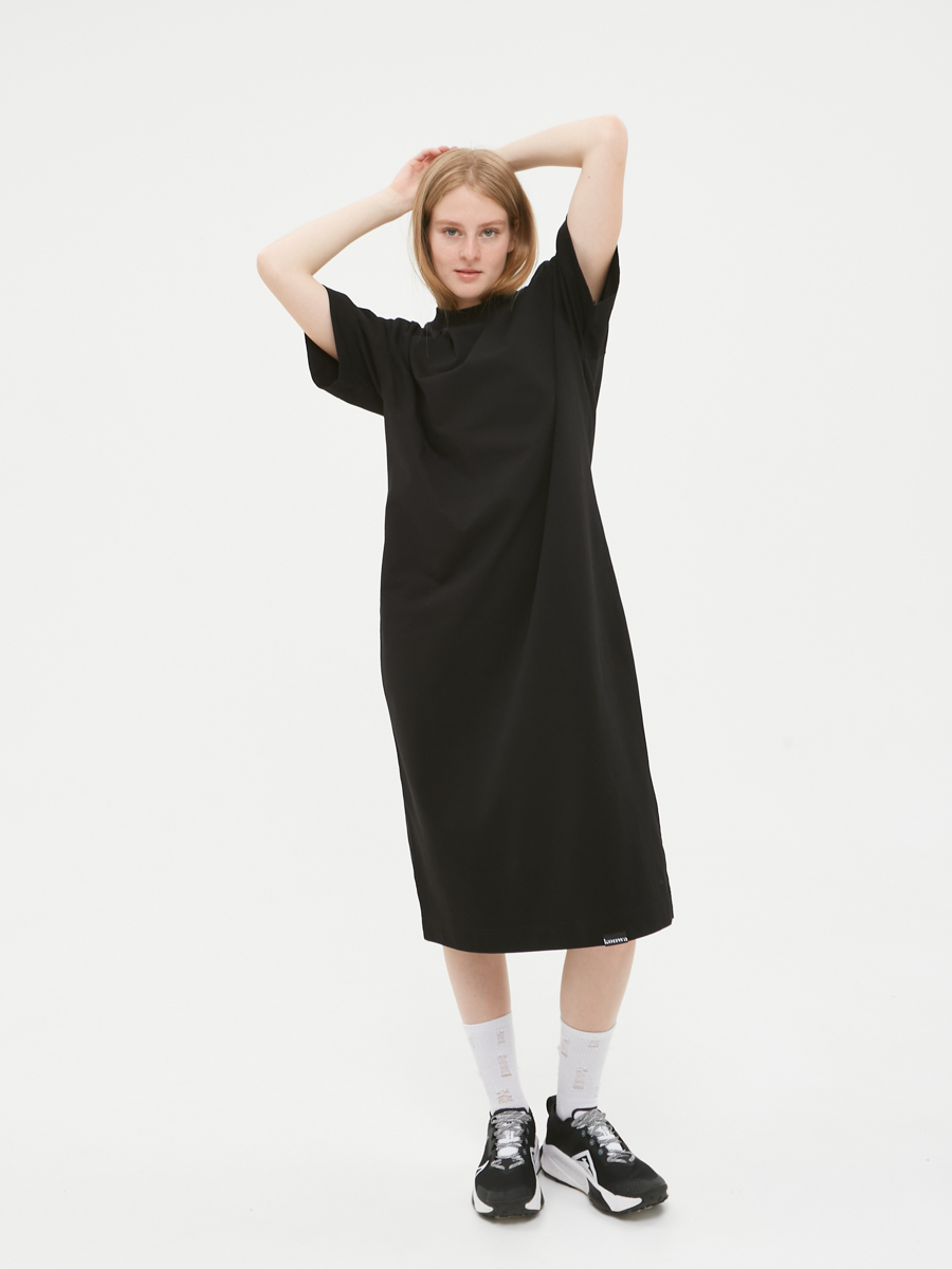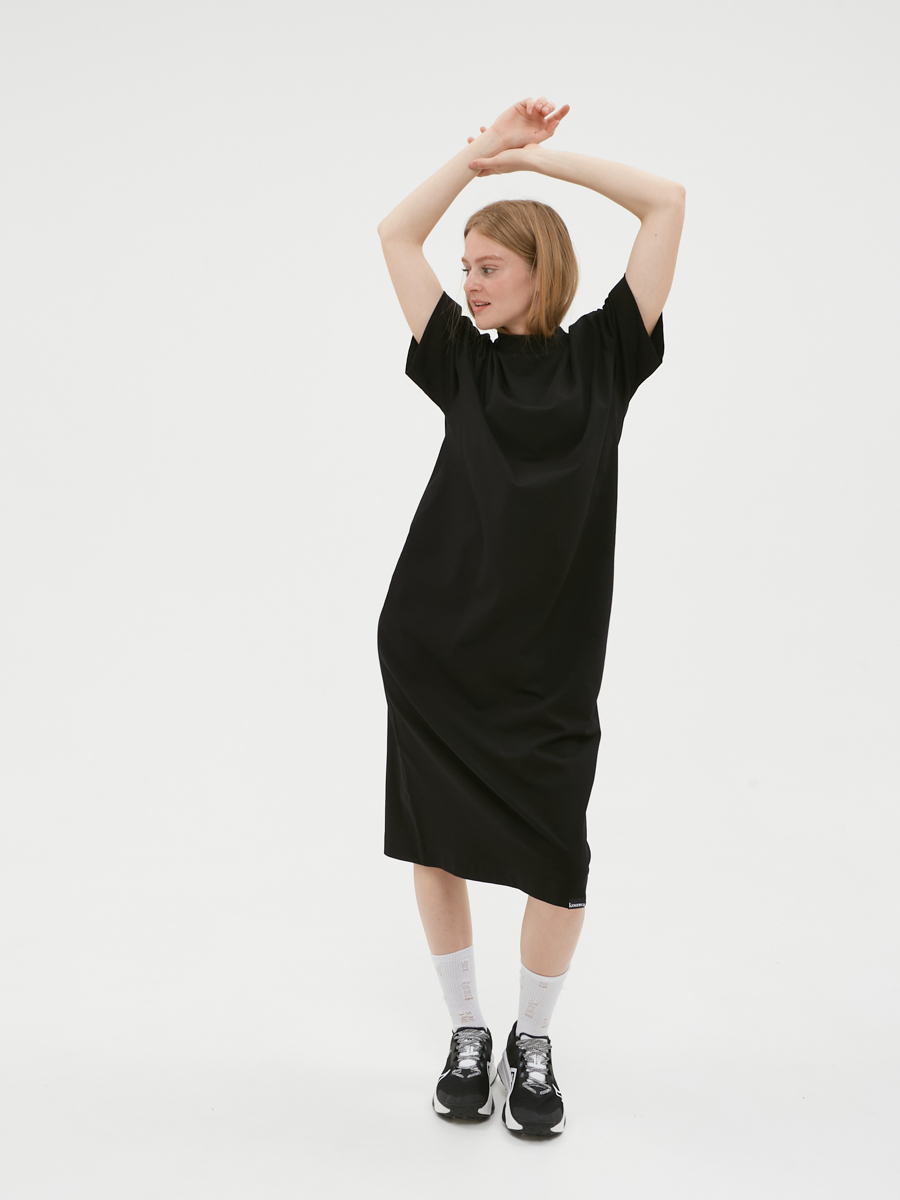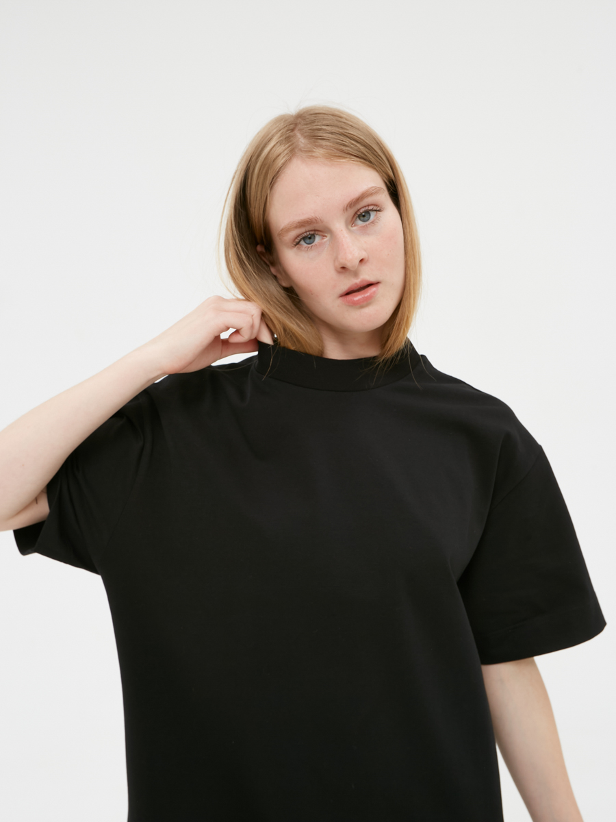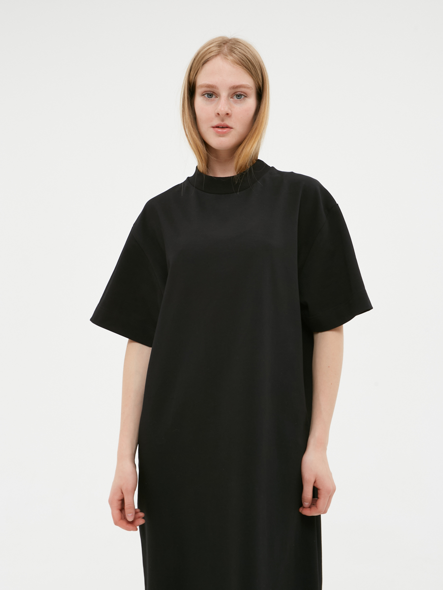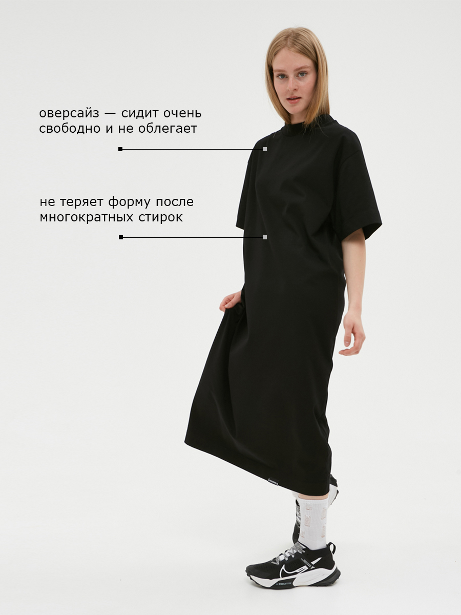 Платье (туника-футболка) минималистичное прямого силуэта, очень свободное, с короткими рукавами. Выполнено из плотной ткани.