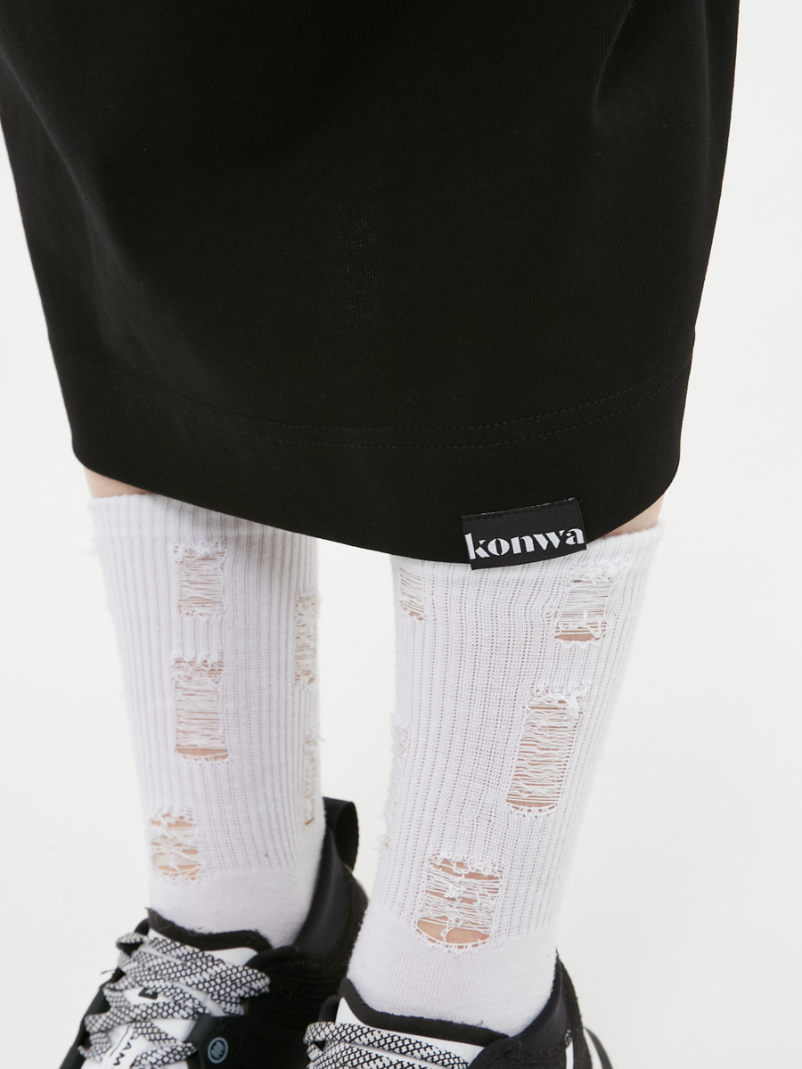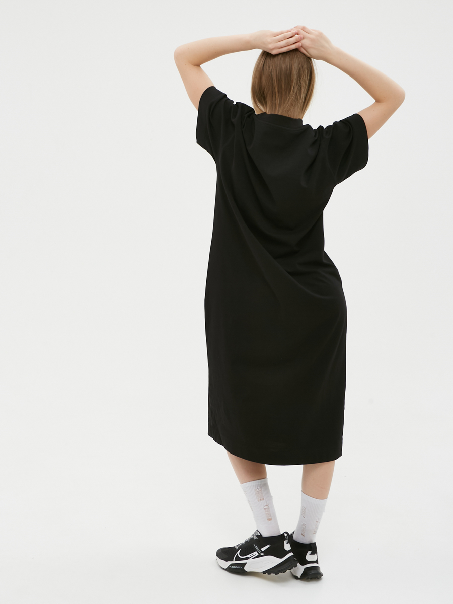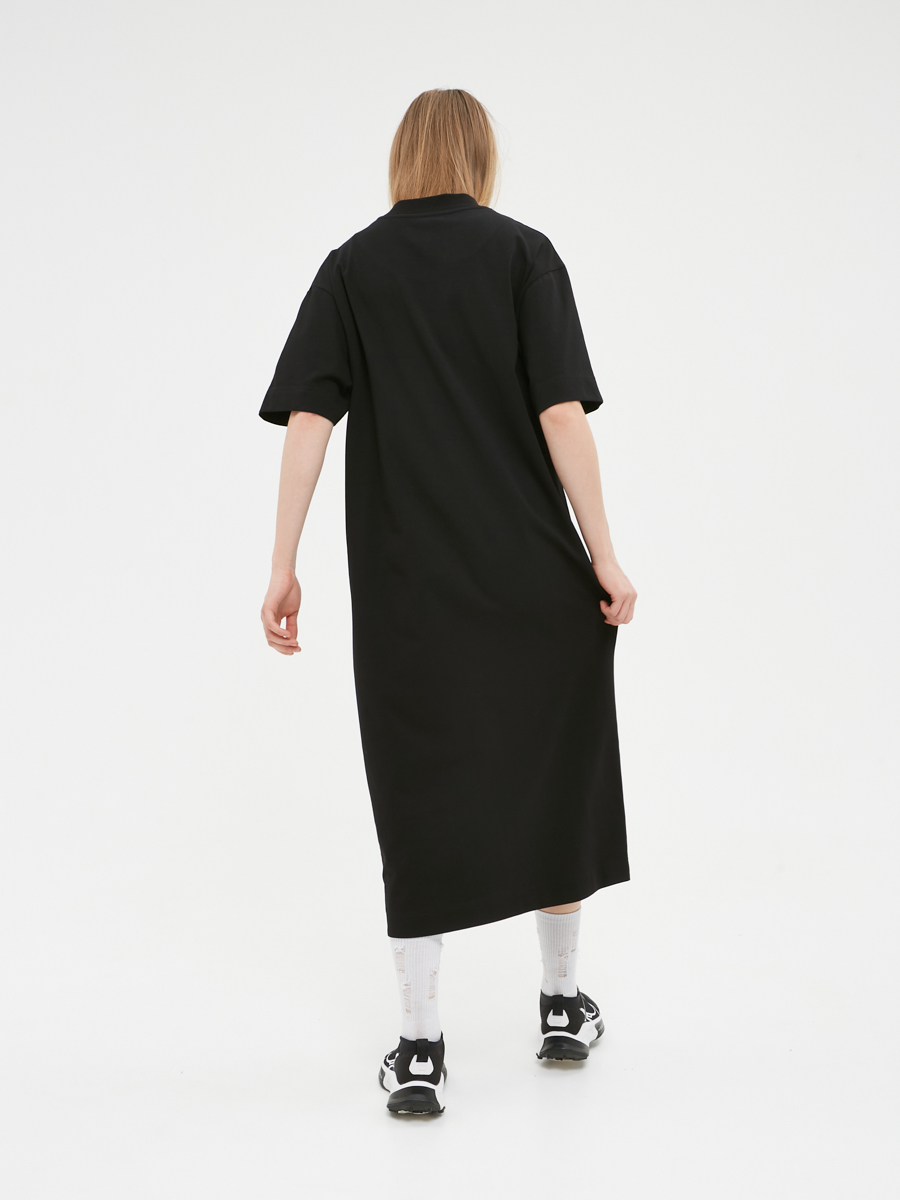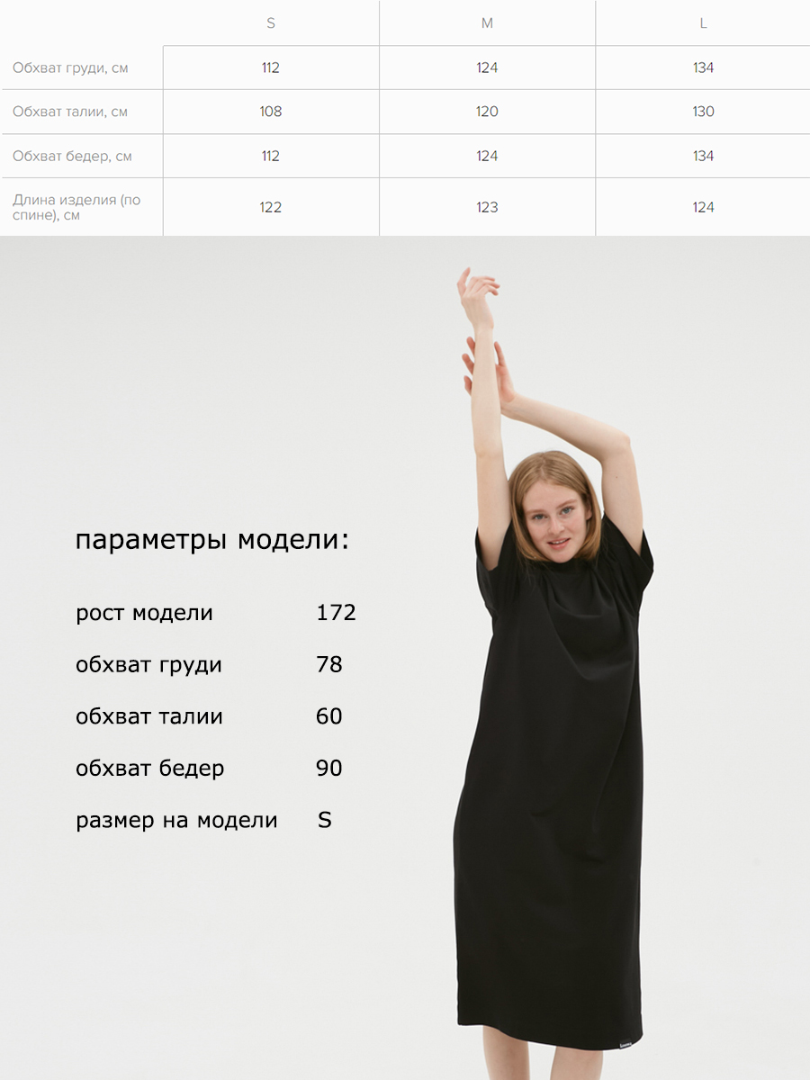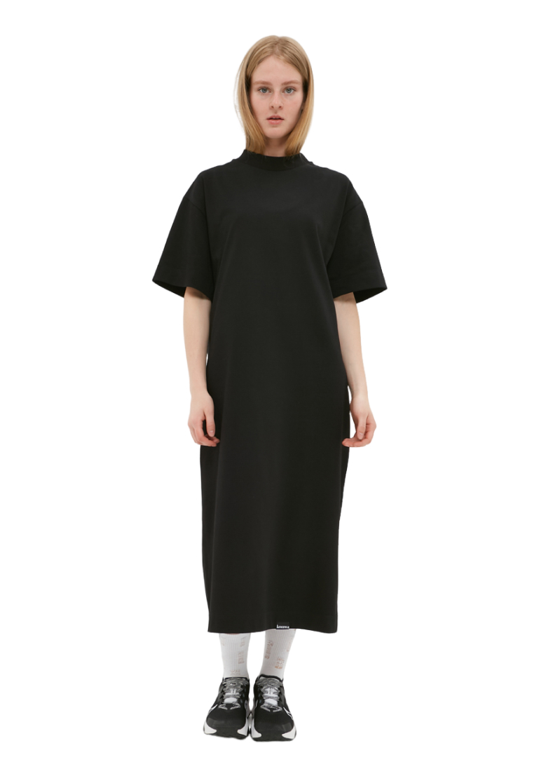 Платье (туника-футболка) минималистичное прямого силуэта, очень свободное, с короткими рукавами. Выполнено из плотной ткани.