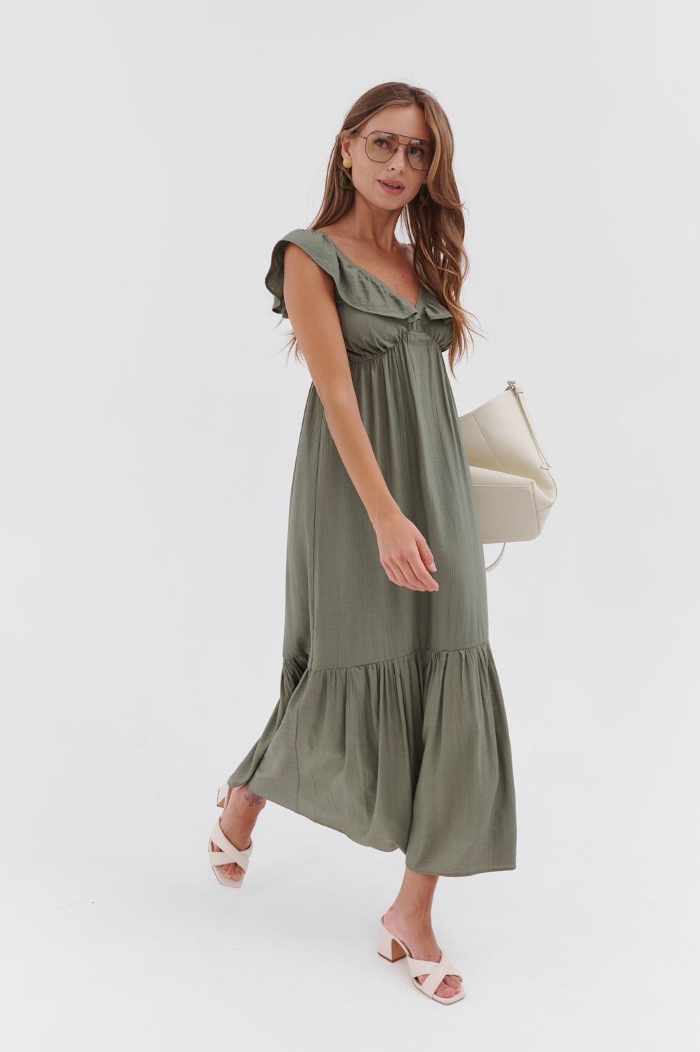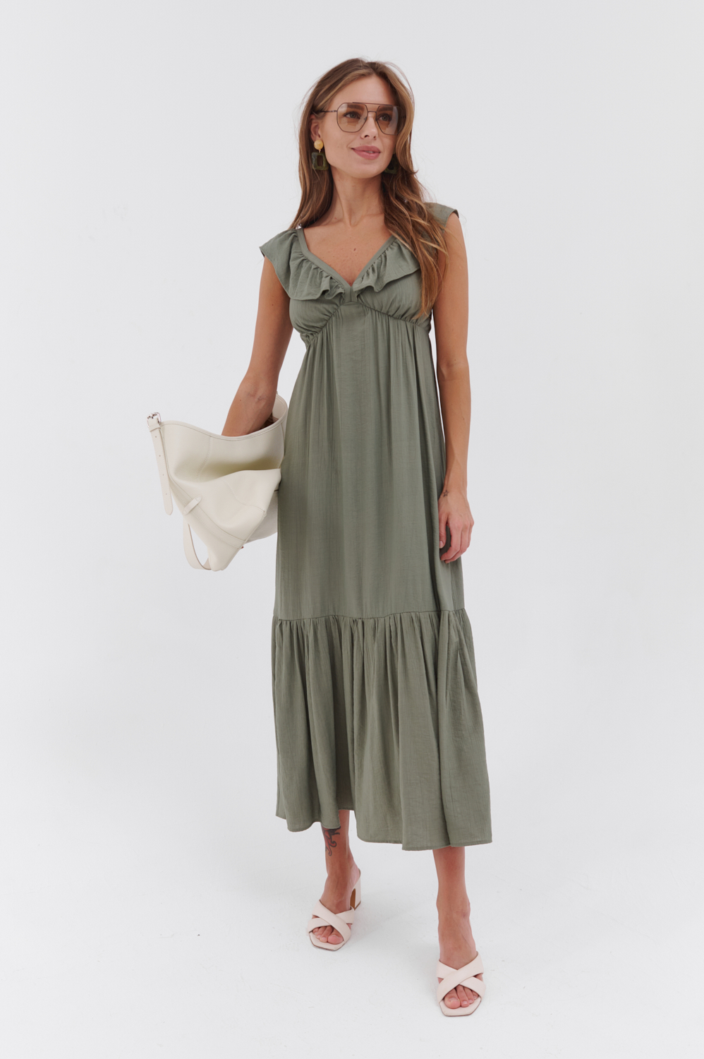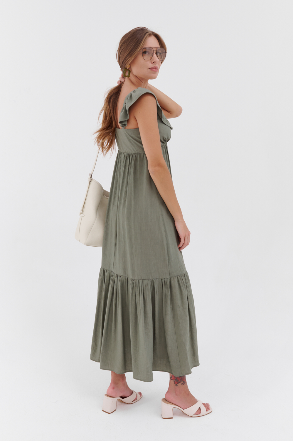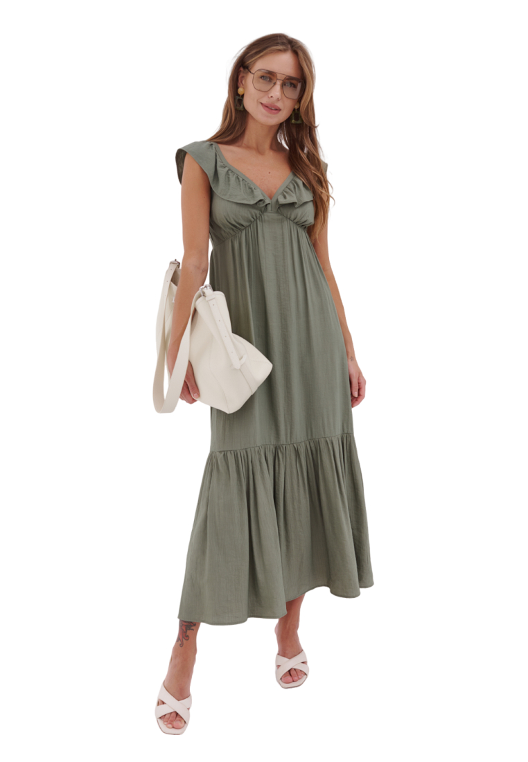 Роскошный оливковый сарафан Лузия в длине макси — идеальное сочетание элегантности и комфорта. Свободный силуэт и струящаяся ткань создают утончённый образ, подчёркивая женственность. Идеально подойдёт для летних прогулок, отдыха или особых мероприятий, даря ощущение лёгкости и стиля.
