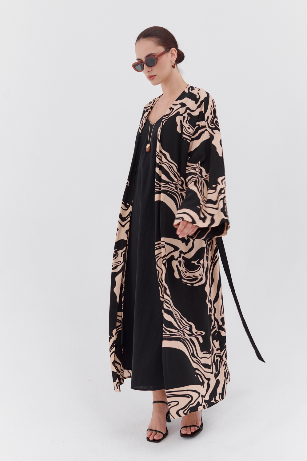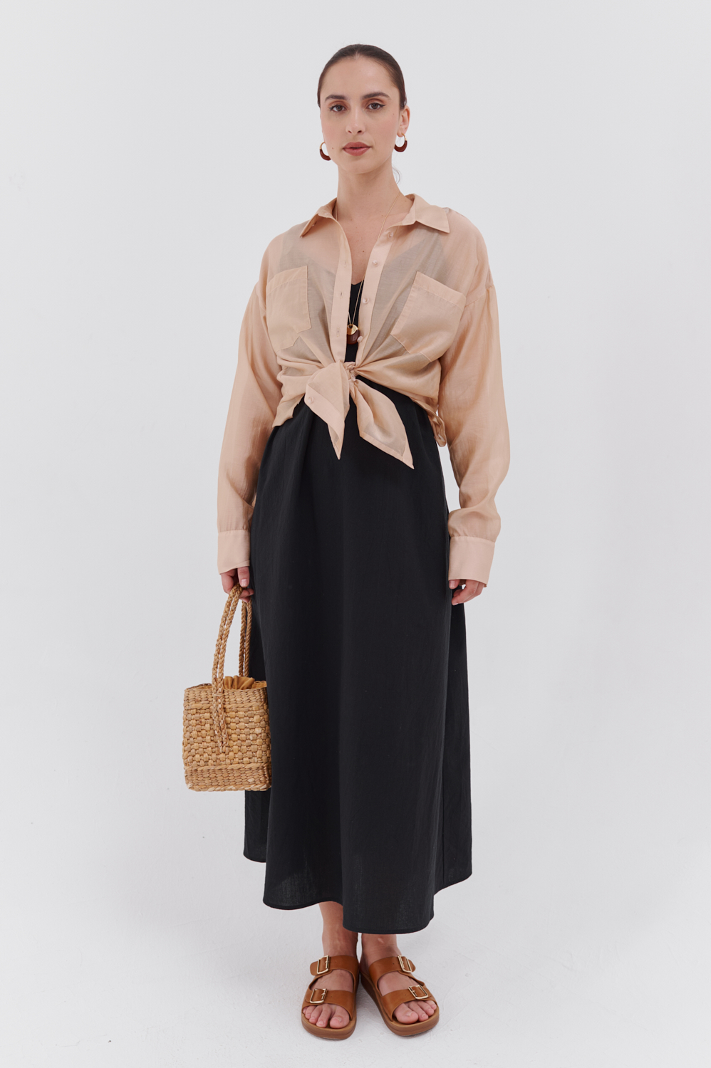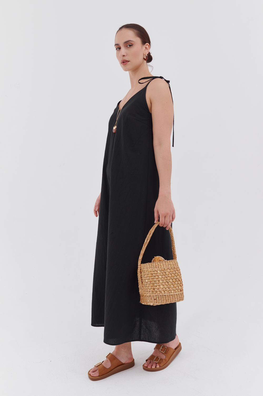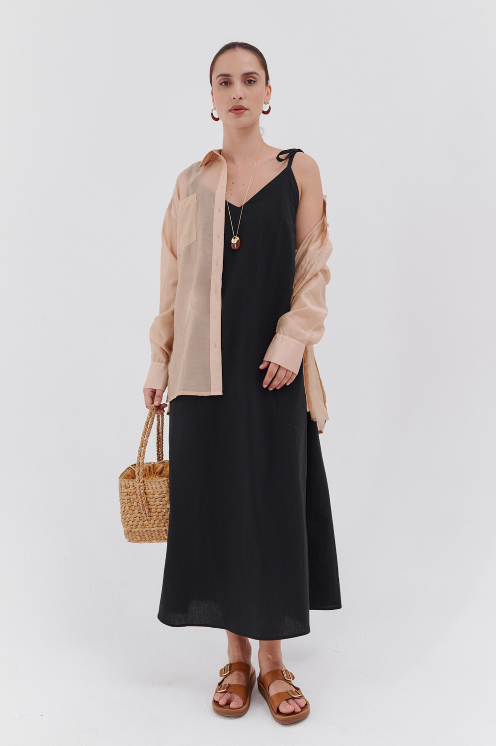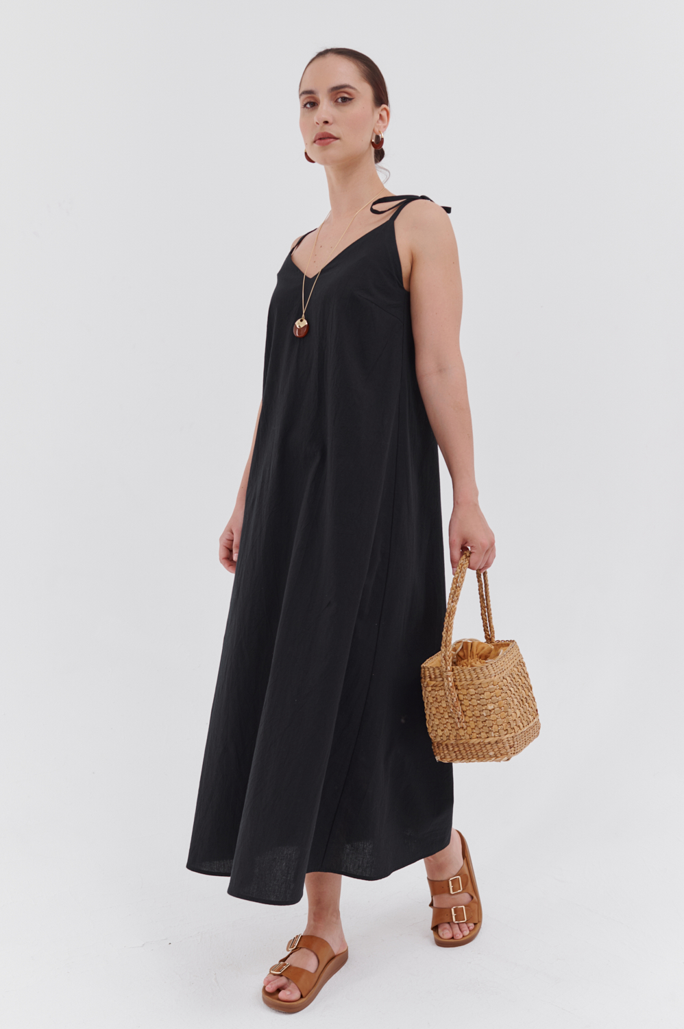 Стильный черный сарафан Майами с элегантными завязками — идеальное сочетание легкости и загадочности. Модель макси-длины из коллекции «Песок и камень» подчеркивает женственный силуэт, создавая эффектный образ для вечера или особого случая. Воздушный крой и романтичные детали делают этот сарафан must-have в летнем гардеробе.