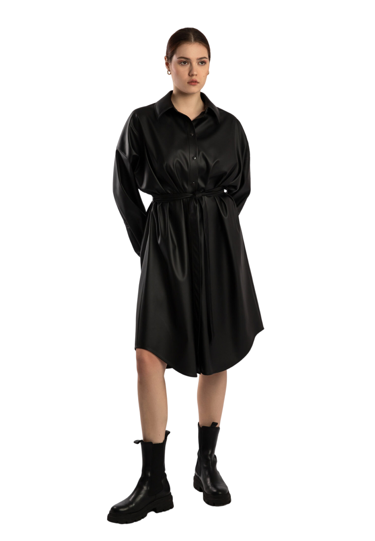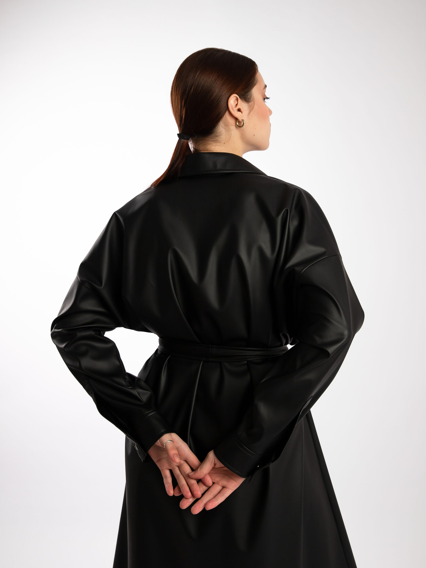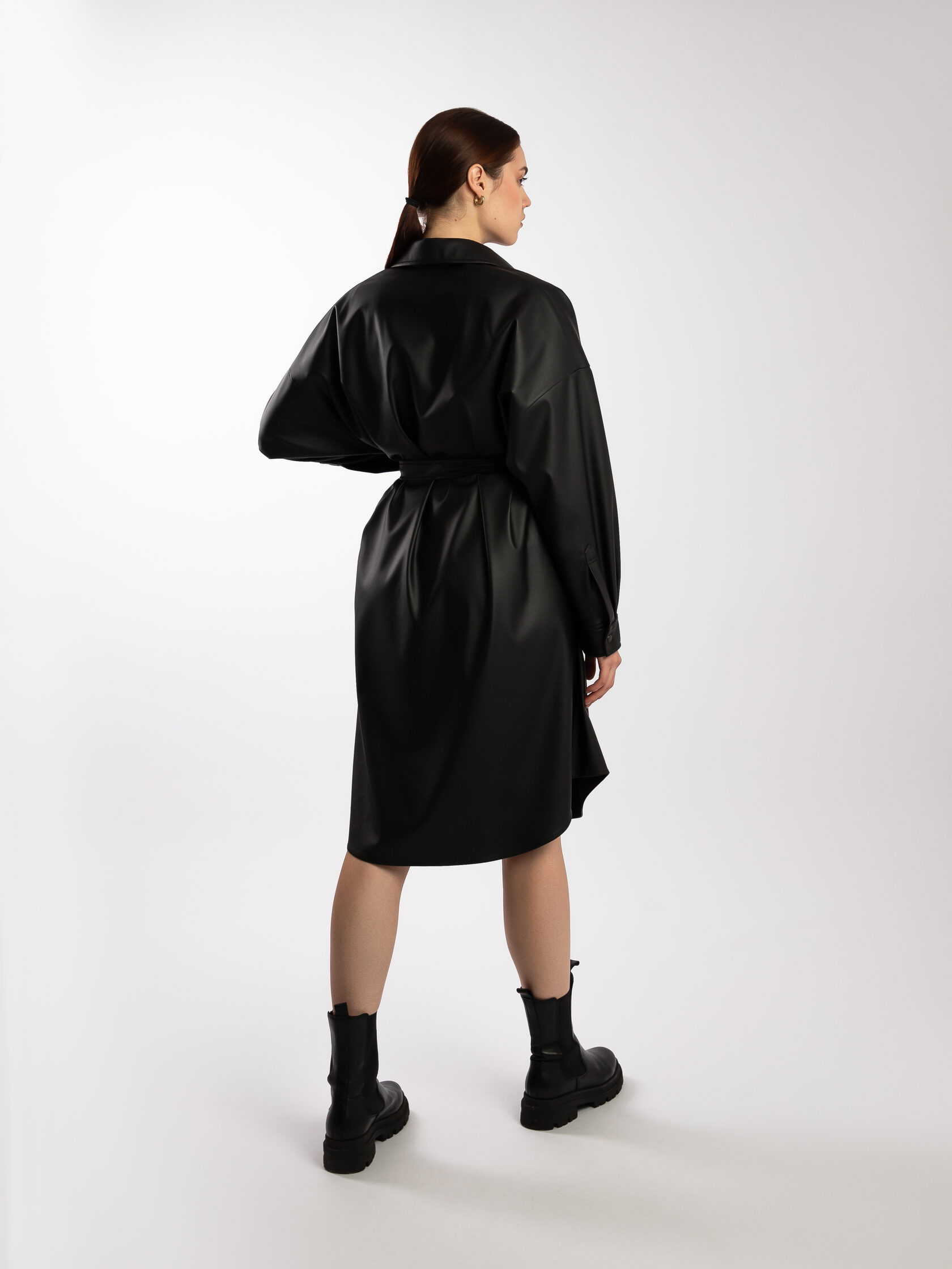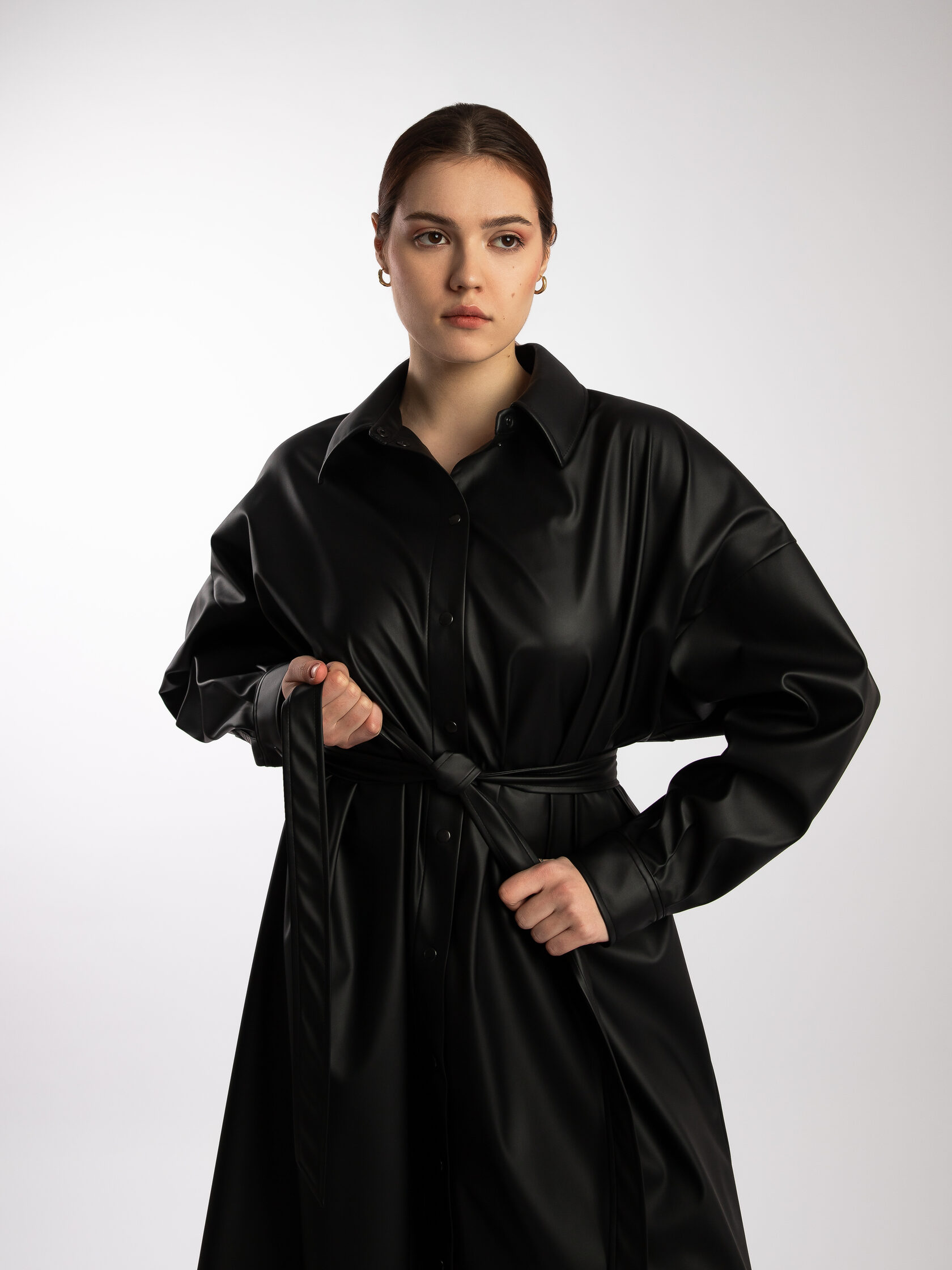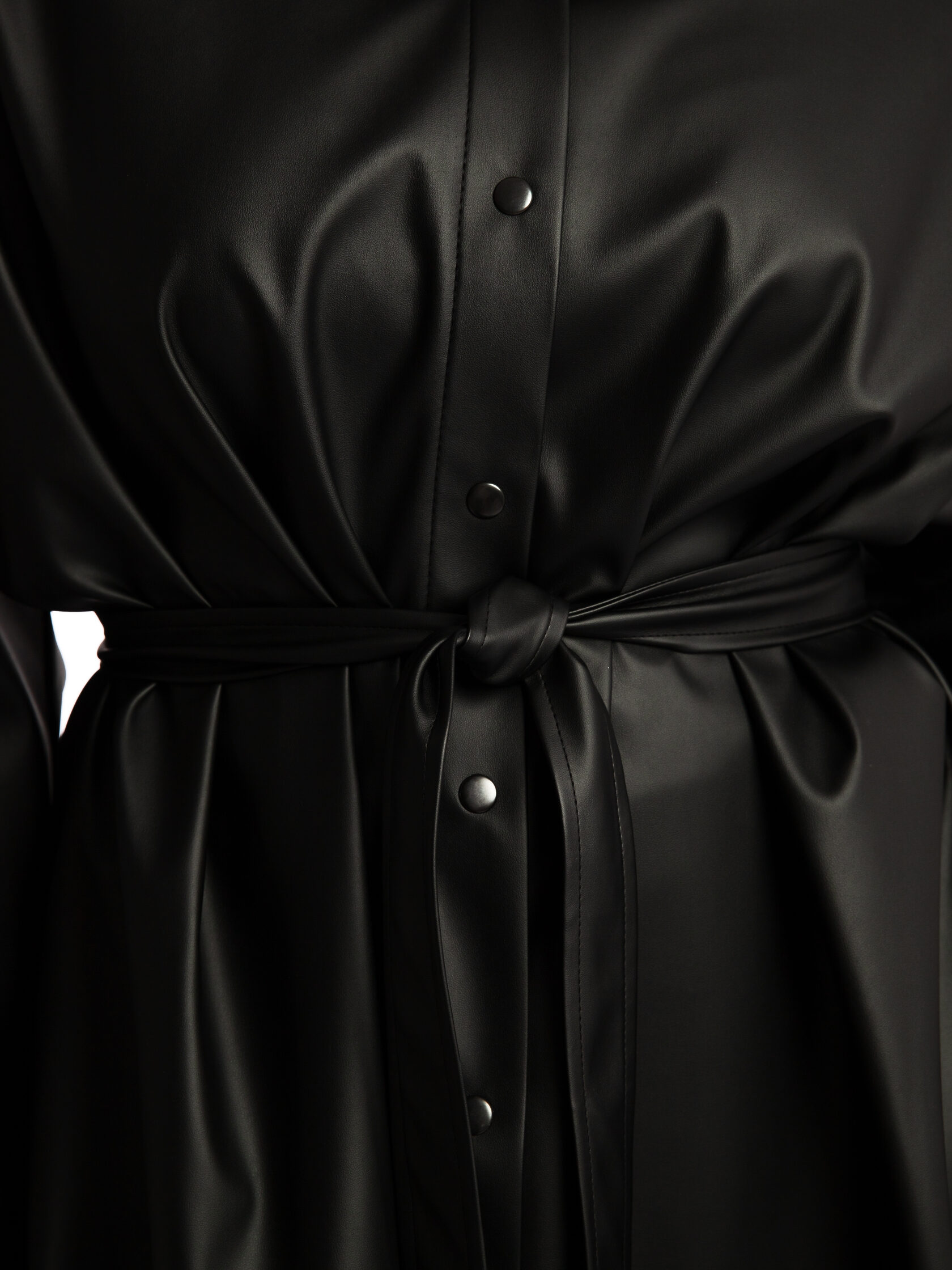 Платье-рубашка прямого оверсайз силуэта выполнена из высококачественной экокожи. Изделие застёгивается на металлические кнопки и завязывается на пояс. У такой модели есть множество вариаций для стилизации в повседневные образы. В зависимости от вашего настроения можно носить как платье или удлинённую рубашку. В тёплое время года - как плащ. Минималистично и акцентно впишется в базовый гардероб.