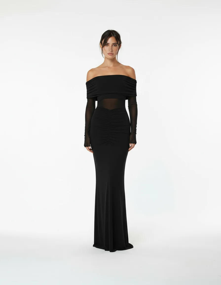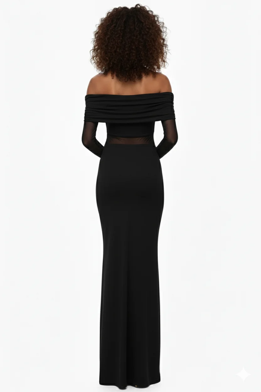 Платье макси с сеткой и открытыми плечами — изысканная модель, в которой сочетаются романтичность и современный стиль. Воздушная сетка создаёт лёгкий акцент на теле, а открытые плечи придают образу женственность и утончённость. Идеальный вариант для вечернего выхода, торжества или особого случая.