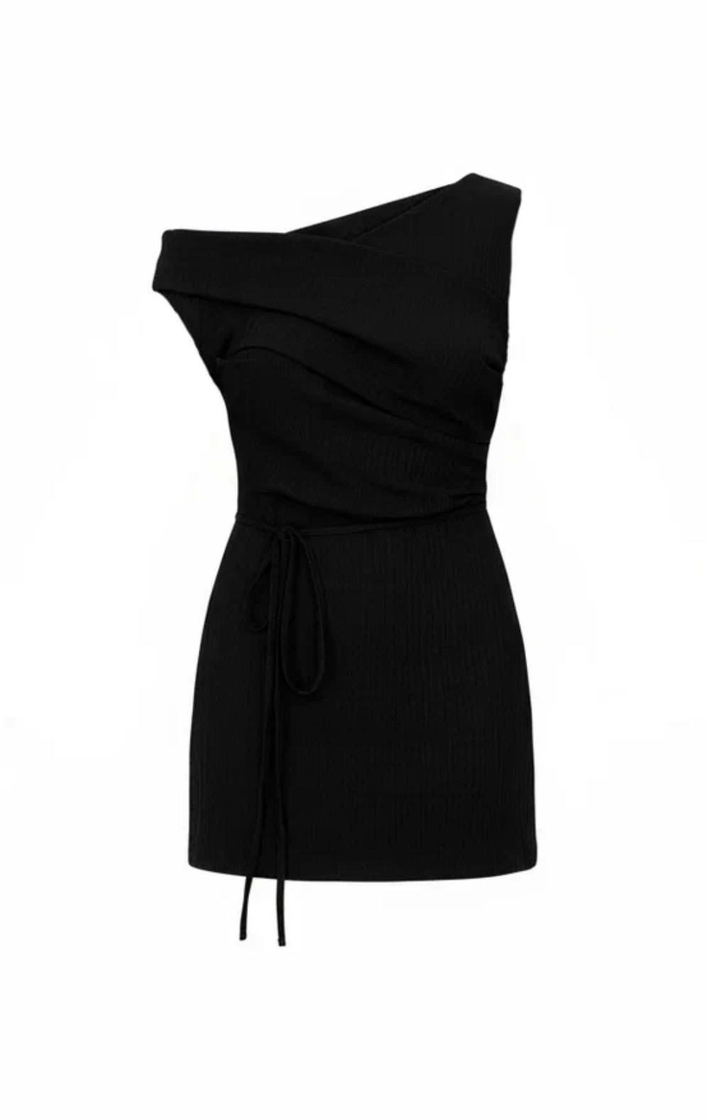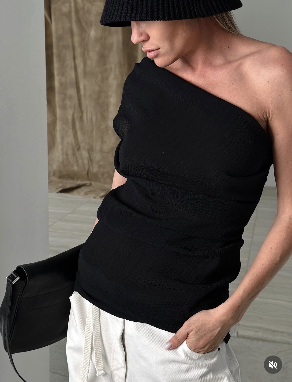 Удлиненный топ- платье на одно плечо с дропировкой и молнией.