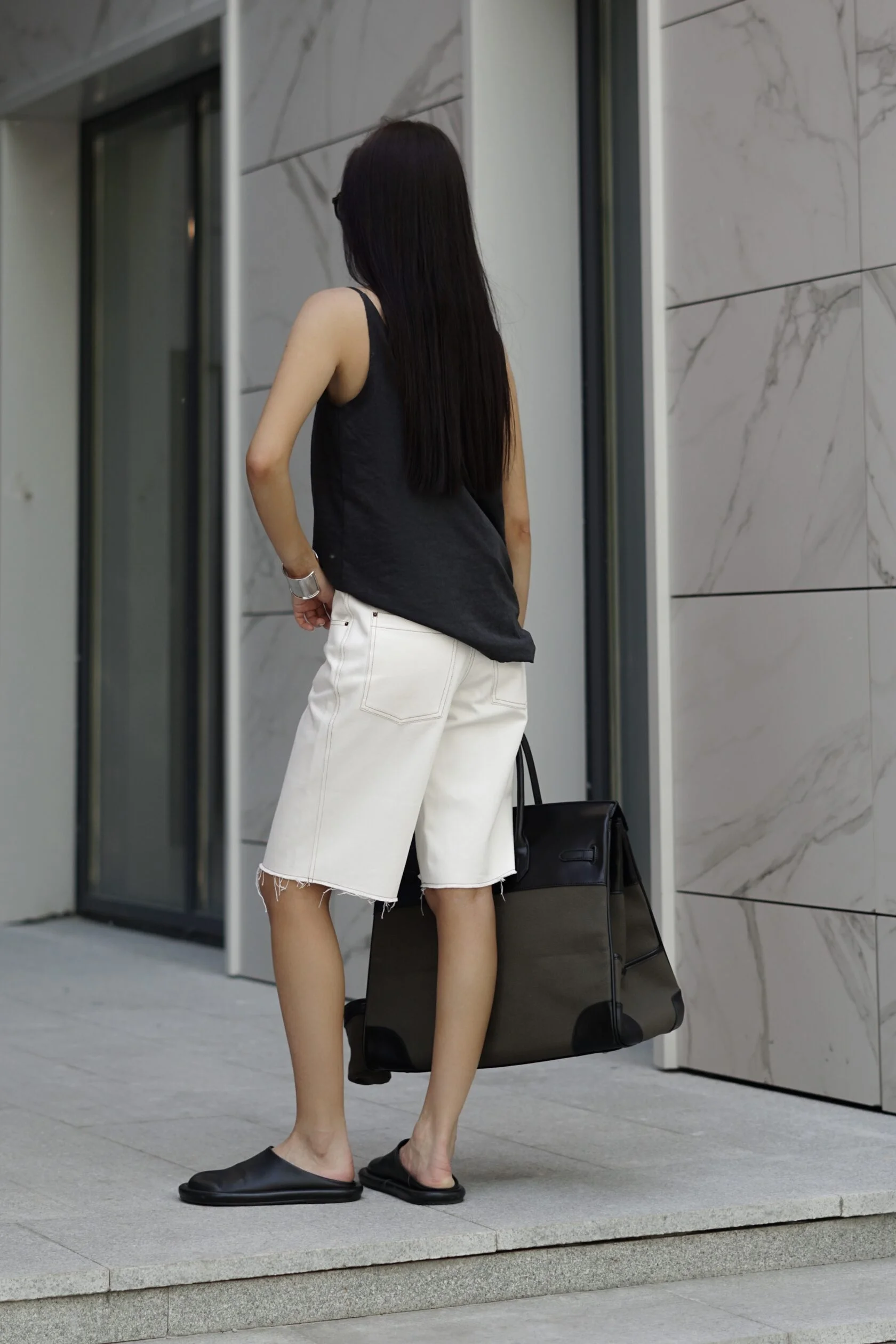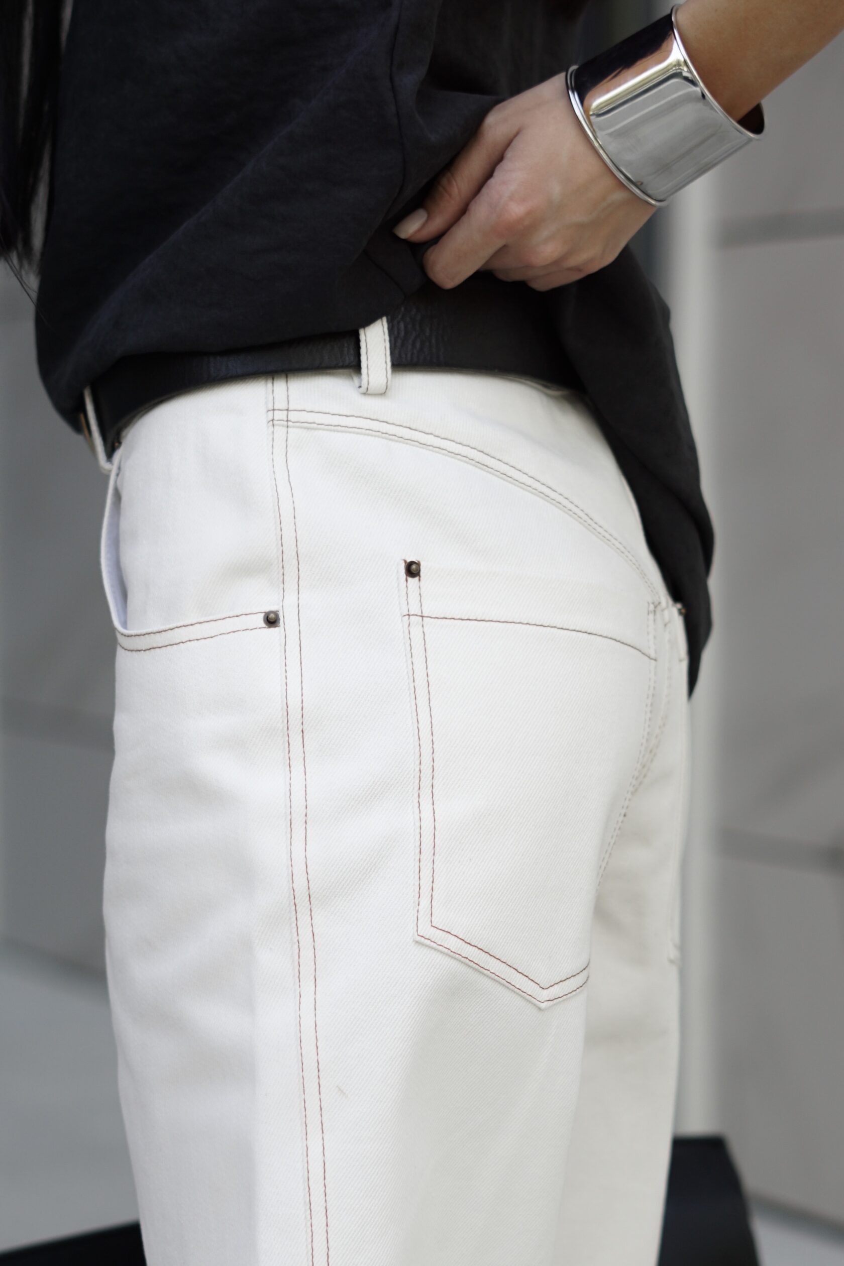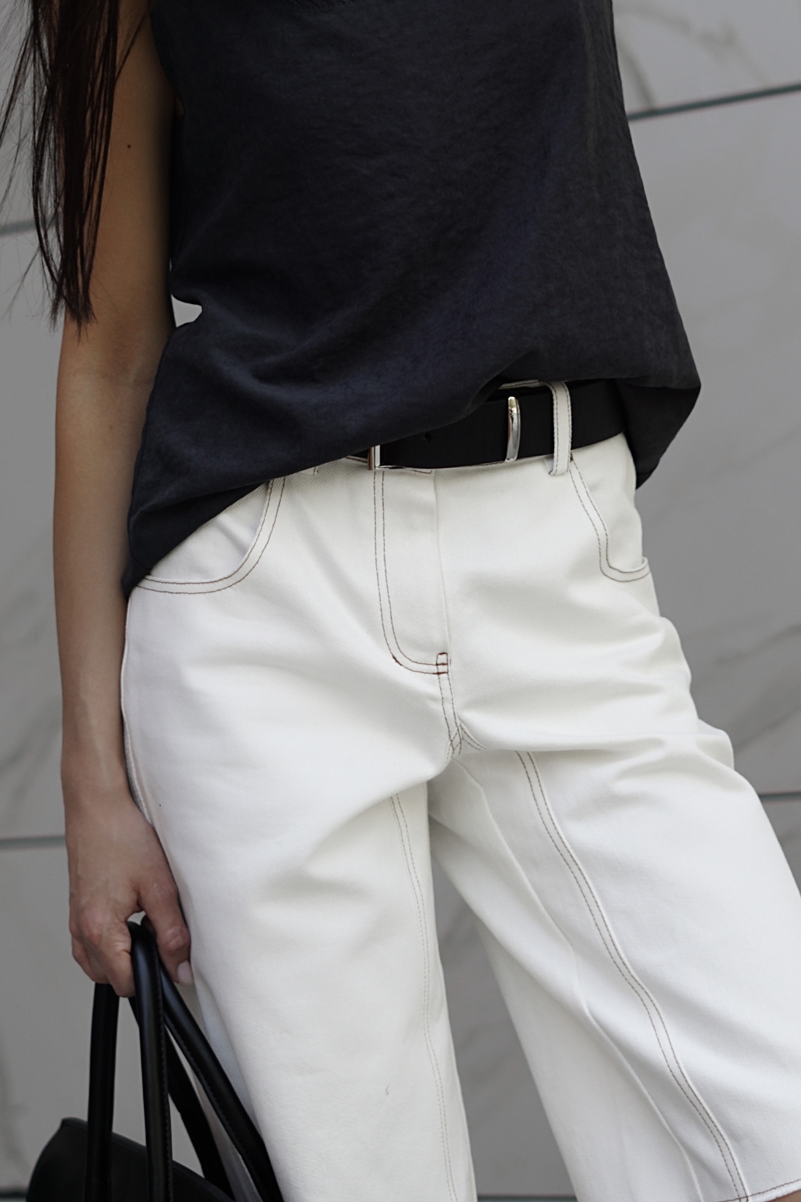 Шорты из плотного денима в оттенке Tofu с необработанным краем и контрастной отстрочкой. Универсальная модель, формирует правильные пропорции с помощью длины и моделирует силуэт благодаря высокой плотности денима.