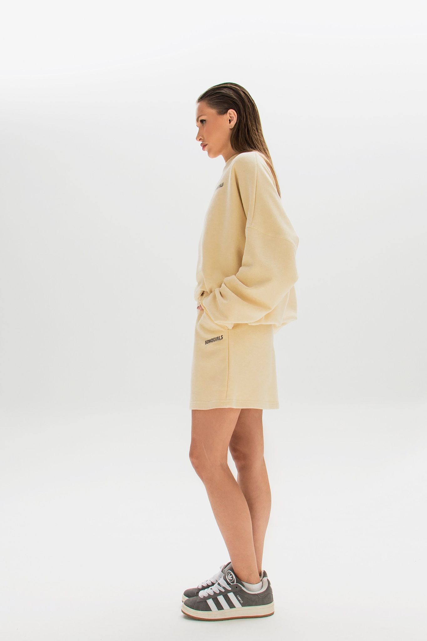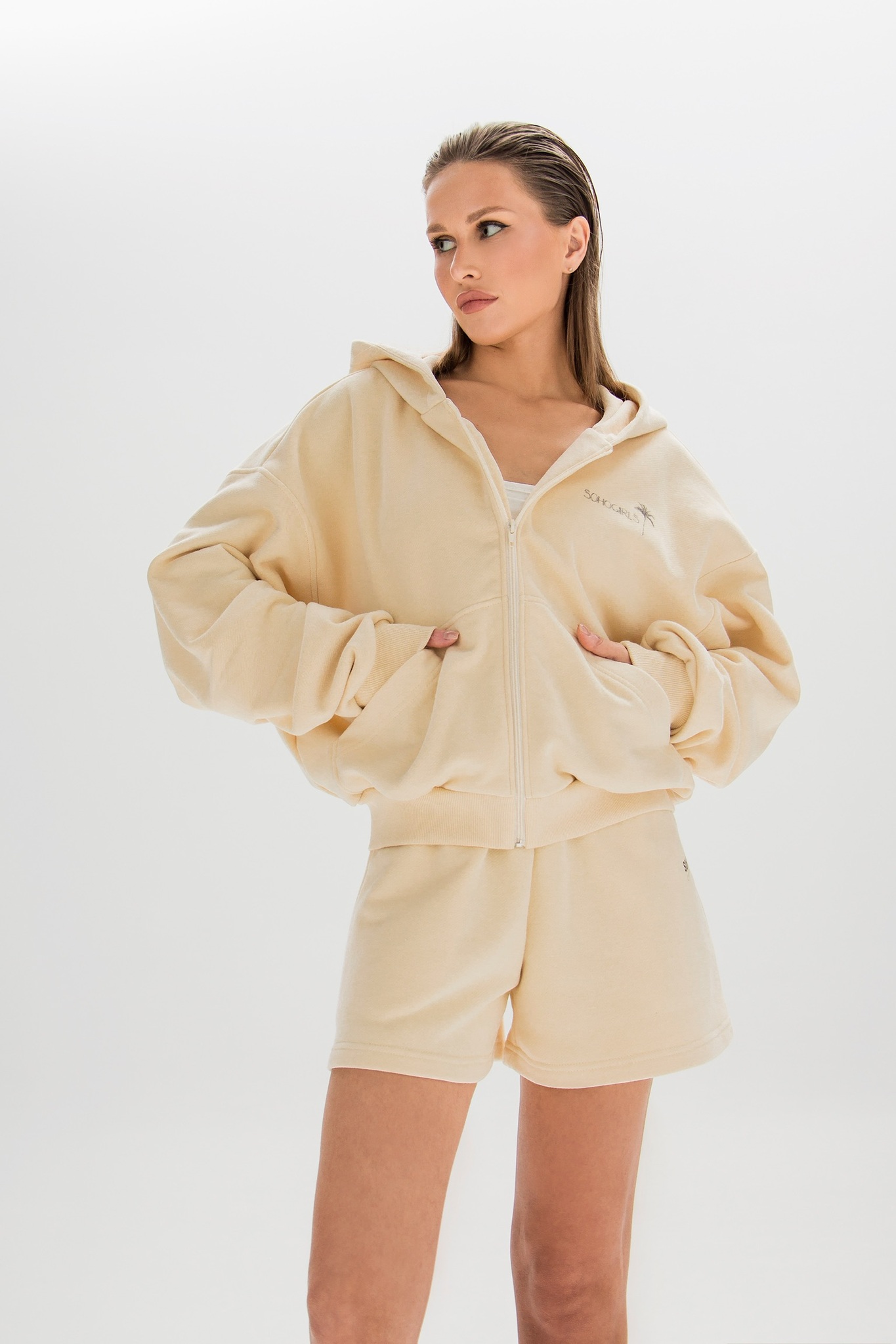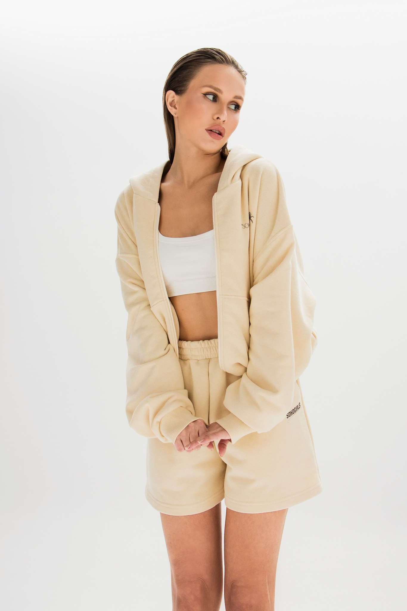 Шорты выполнены из мягкой приятной ткани с эффектом велюра и потайным шнурком на поясе. На шортах нанесен логотип около кармана.