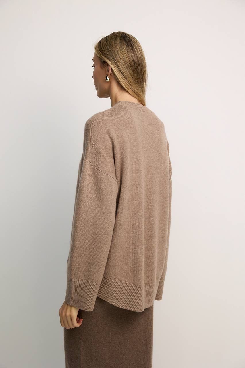 Джемпер с V-образным вырезом горловины, со спущенной линией плеча и английской резинкой по нижнему краю. Изделия изготавливаются на нашей фабрике в России. Процесс вязки происходит на японской плосковязальной машине Shima Seiki. Пряжа проходит обработку специальным гипоаллергенным воском, чтобы...