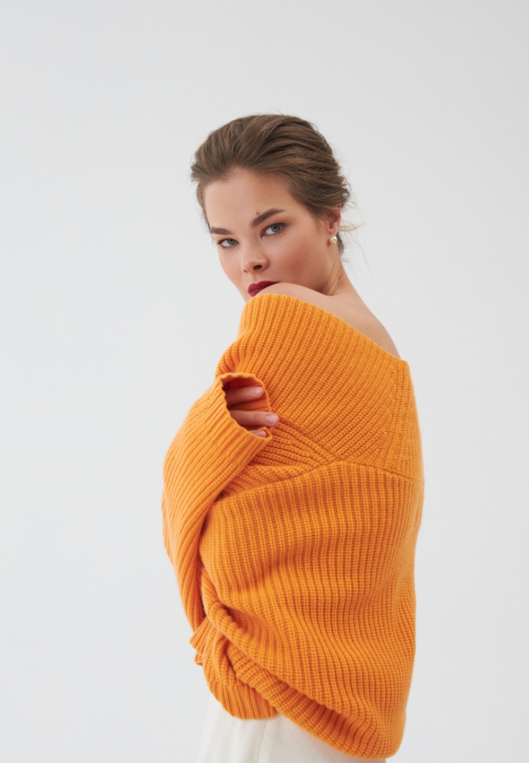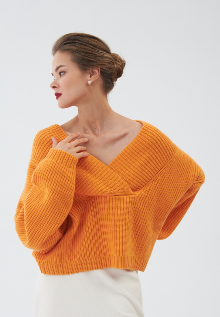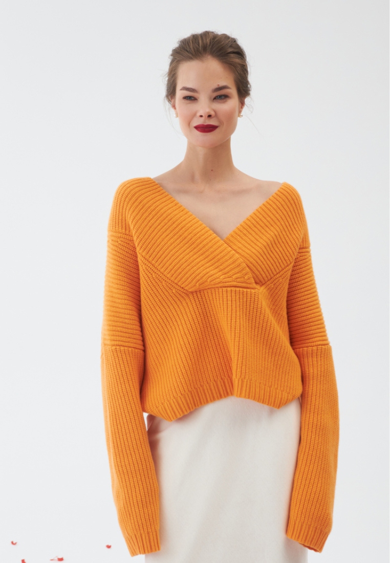 Данная модель свитера красиво спадает на плечи, создавая загадочный, мягкий образ.