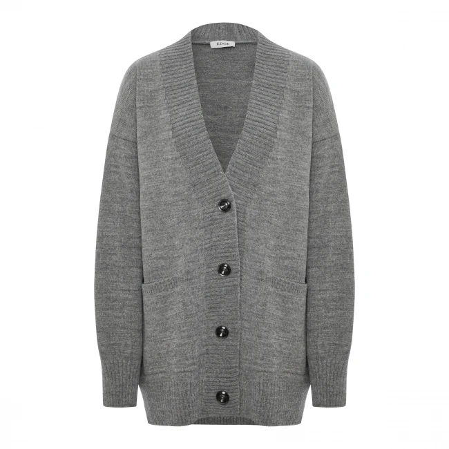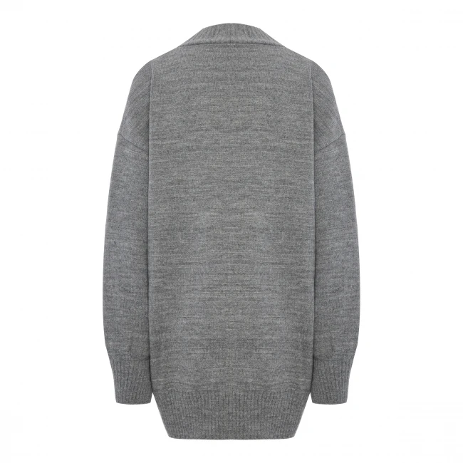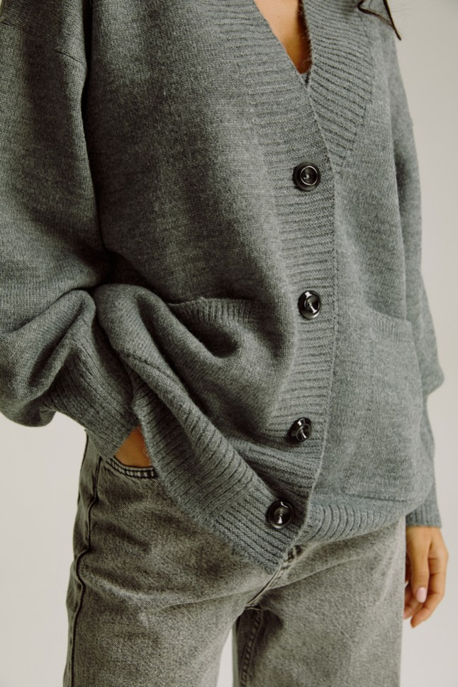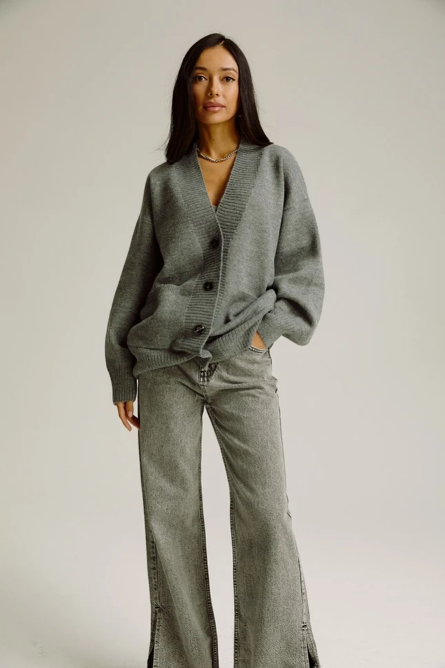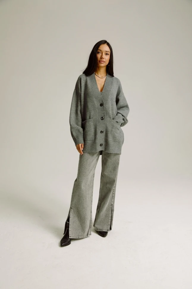 Мягкий и теплый шерстяной кардиган на пуговицах актуального свободного кроя красивого серого цвета. Отлично будет выглядеть с брюками или юбкой из кожи, джинсами, платьем прямого фасона.