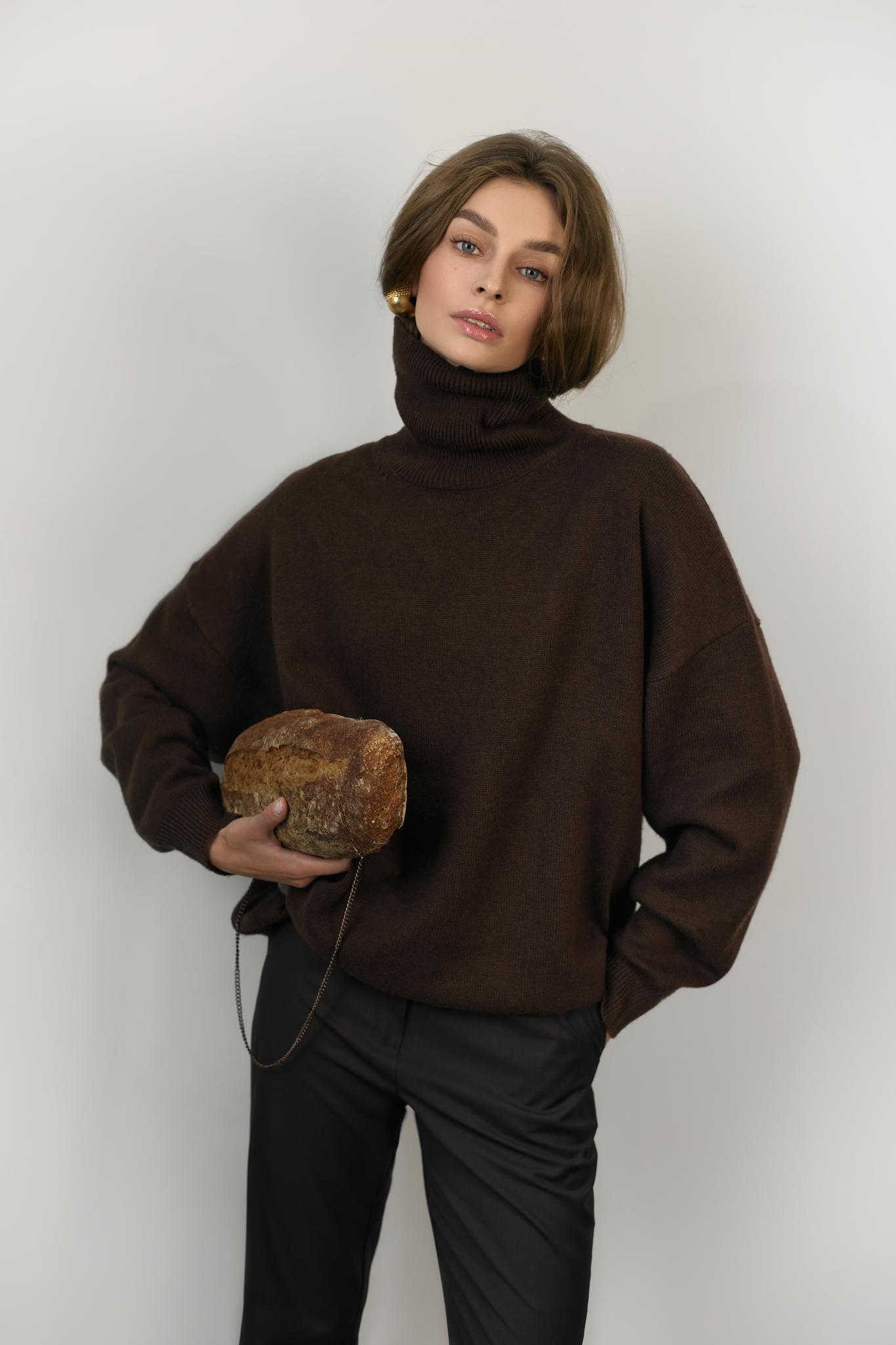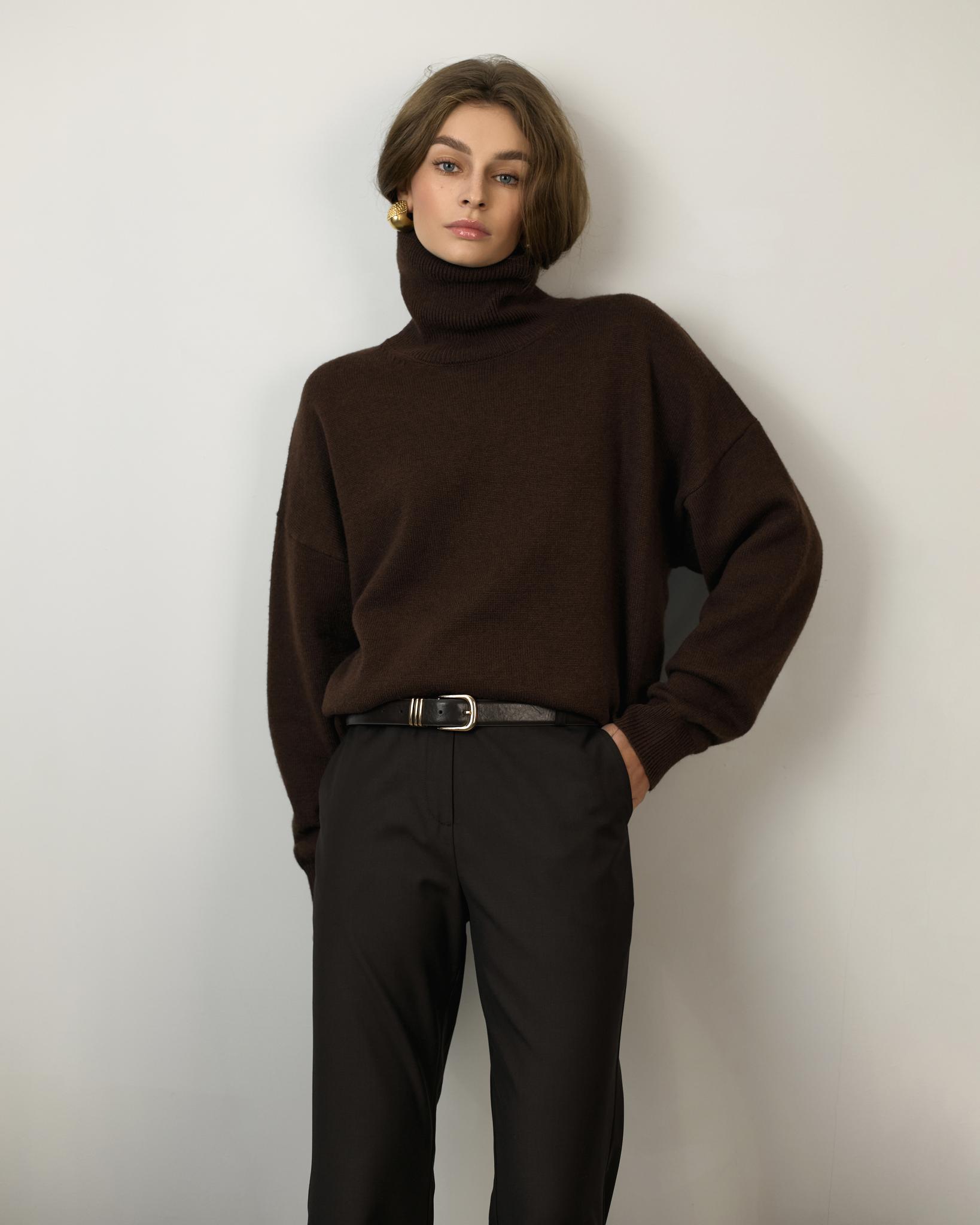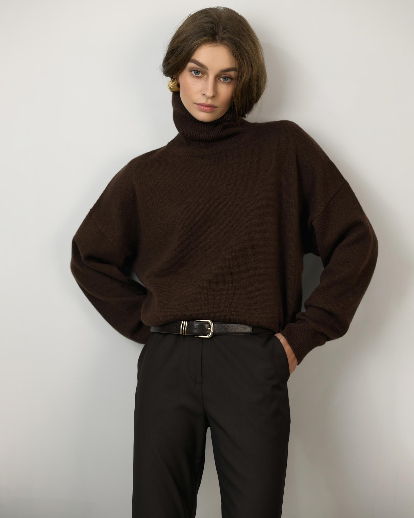 Базовый свитер с высоким воротом, длинным рукавом с манжетами и спущенной линией плеч.