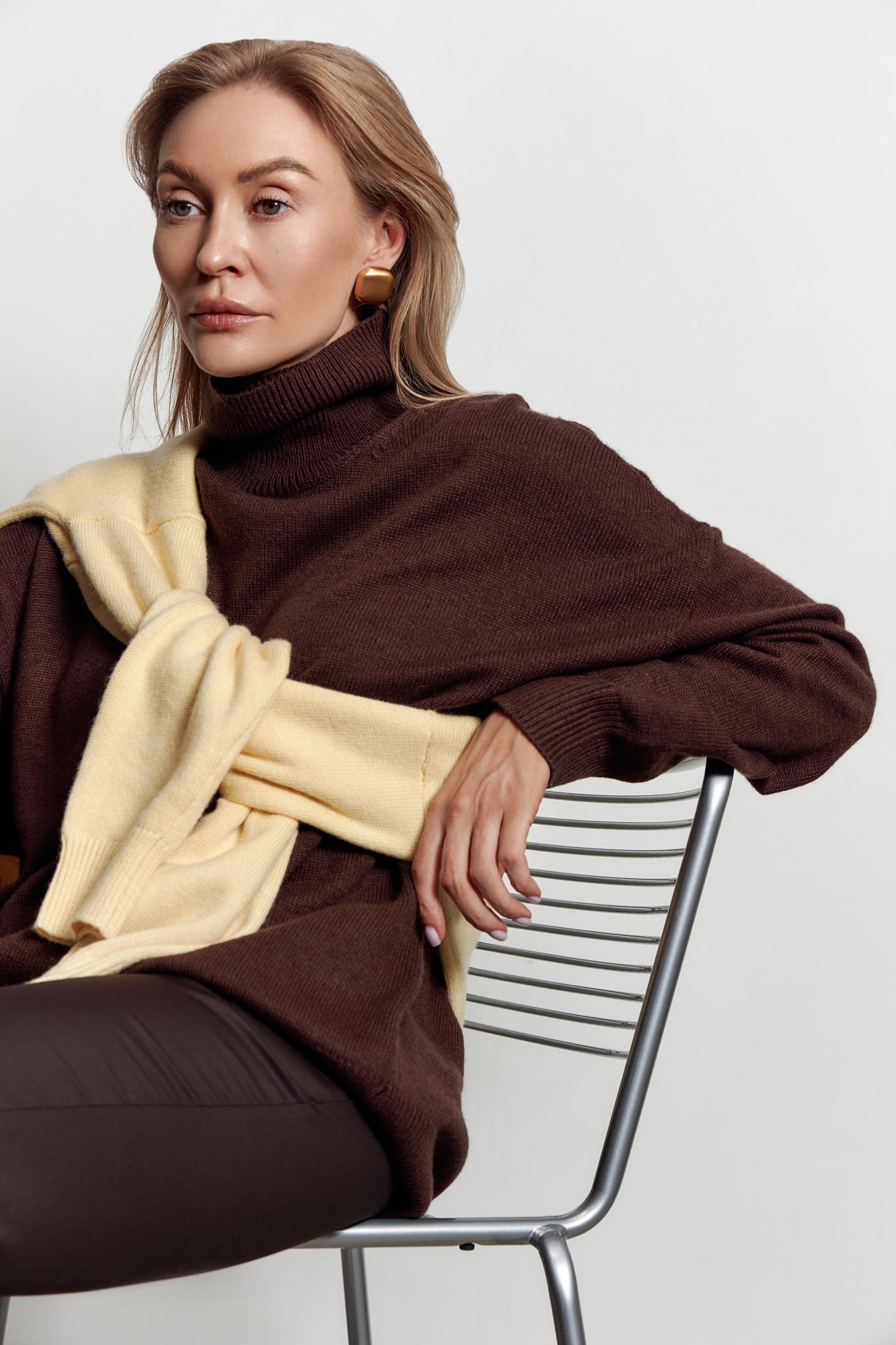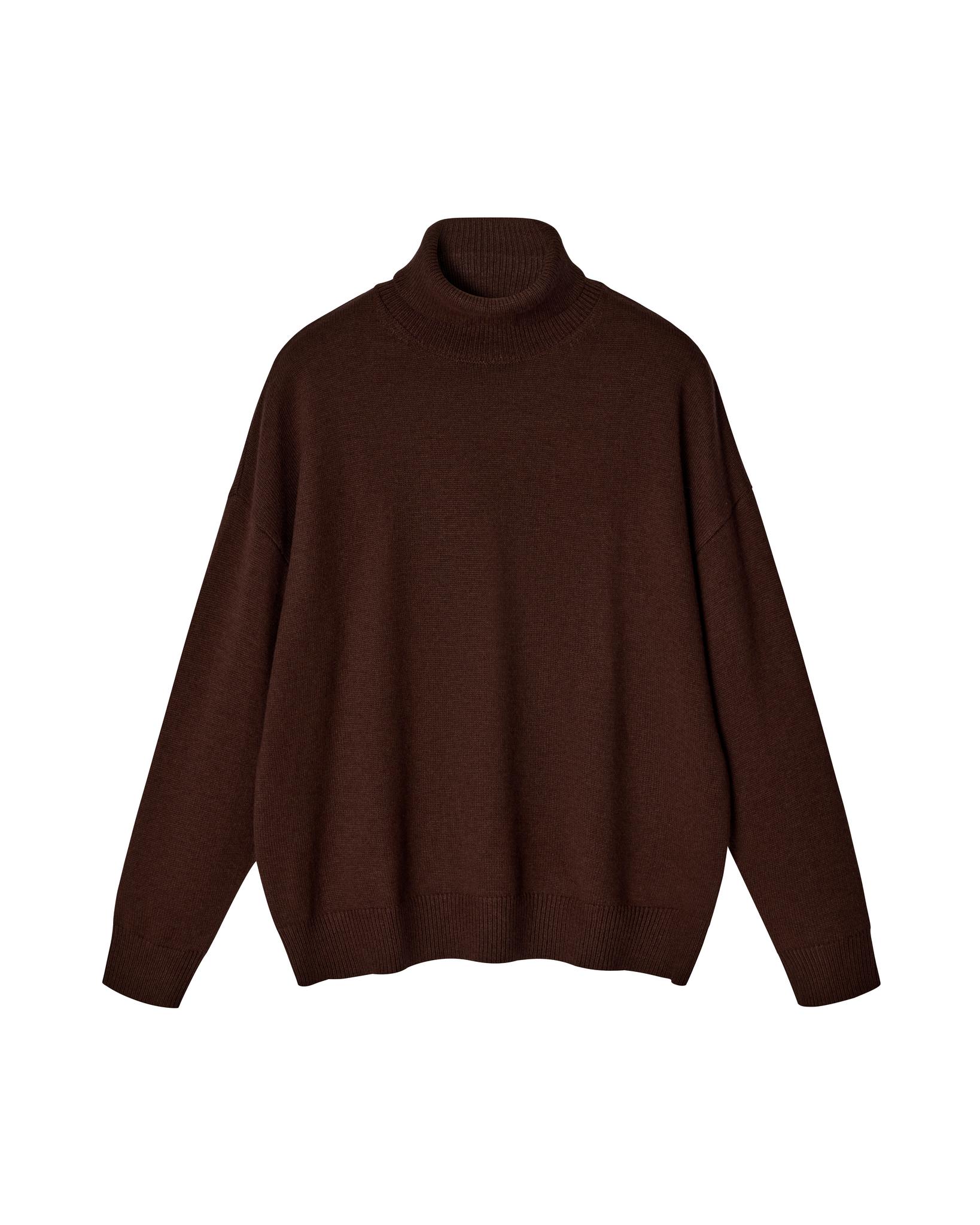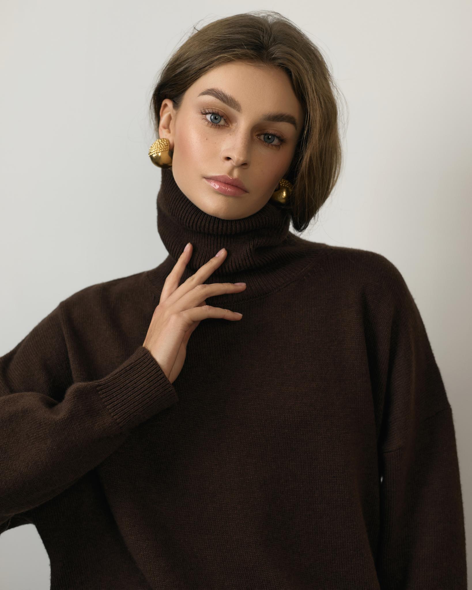 Базовый свитер с высоким воротом, длинным рукавом с манжетами и спущенной линией плеч.