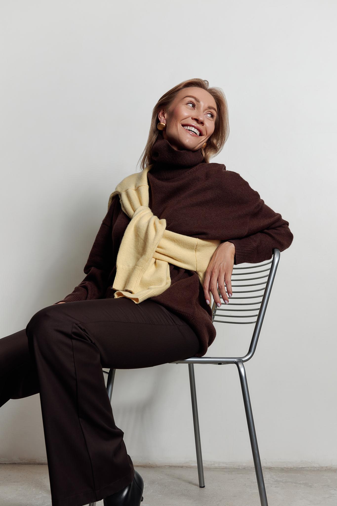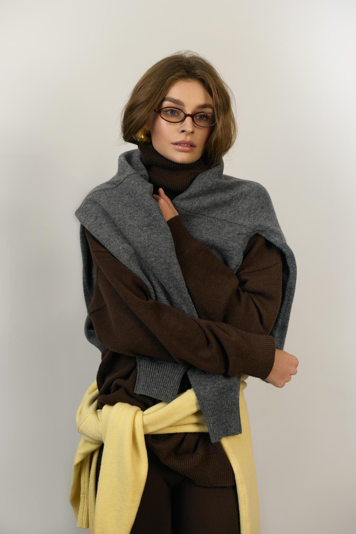Свитер свободного кроя со спущенным плечом, воротником-стойкой, резинкой на рукавах и по низу изделия. Изделия изготавливаются на нашей фабрике в России. Процесс вязки происходит на японской плосковязальной машине Shima Seiki. Пряжа проходит обработку специальным гипоаллергенным воском, чтобы...