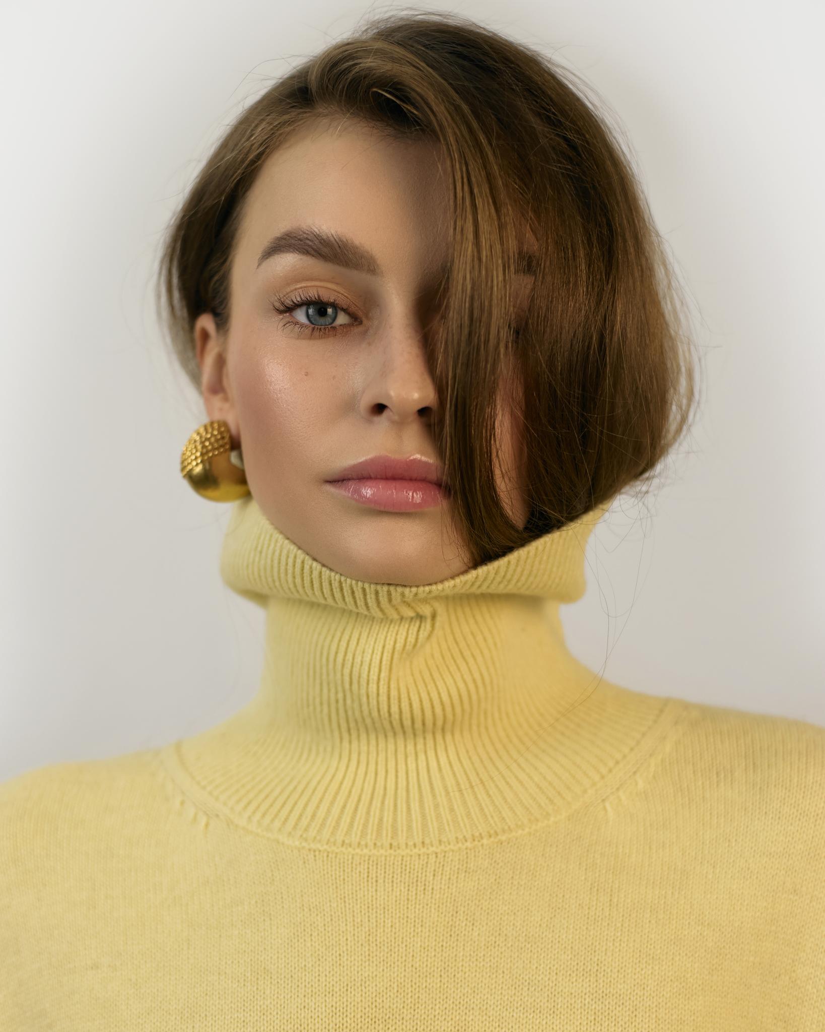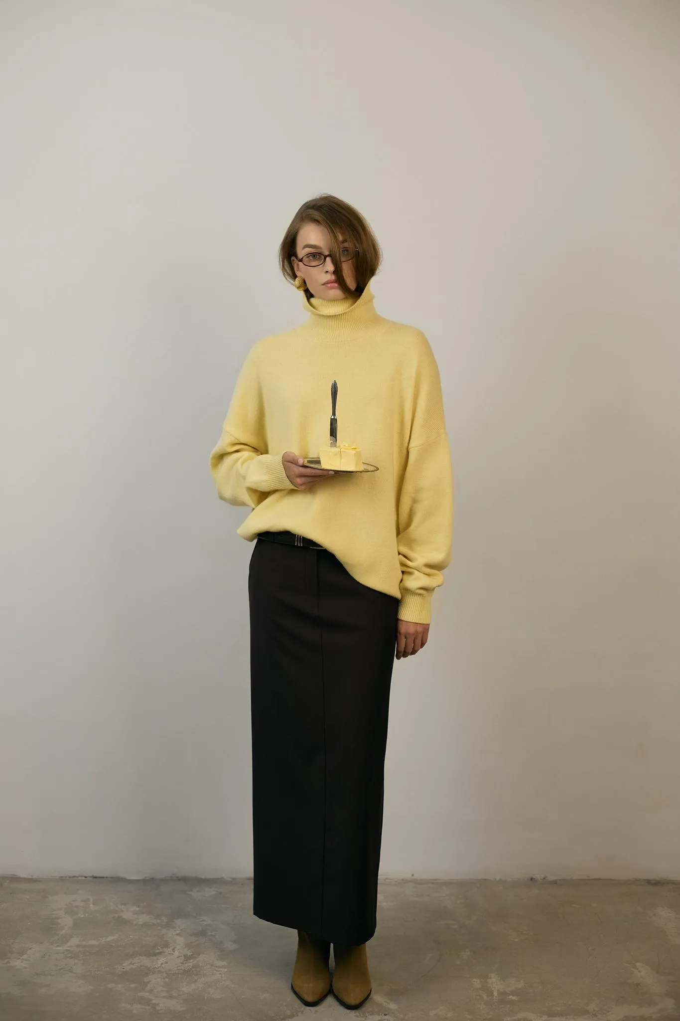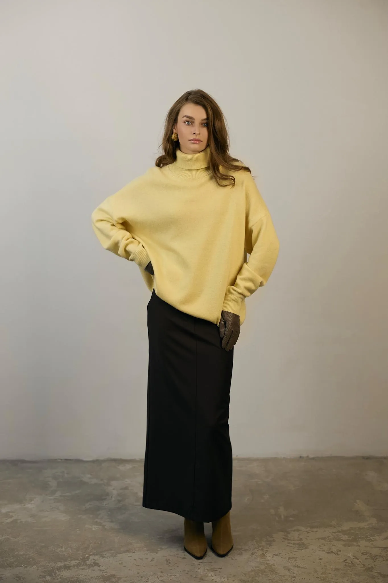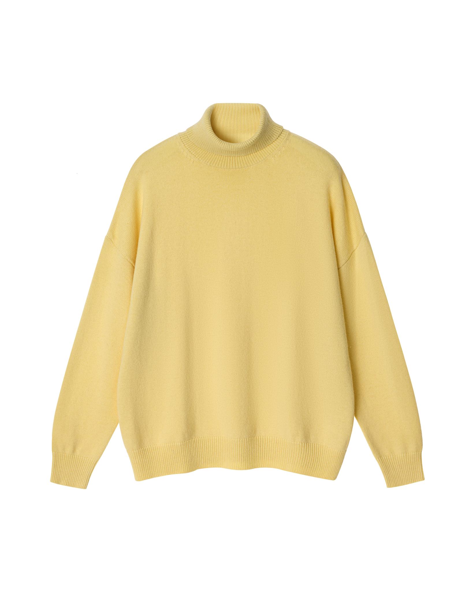 Базовый свитер с высоким воротом, длинным рукавом с манжетами и спущенной линией плеч.