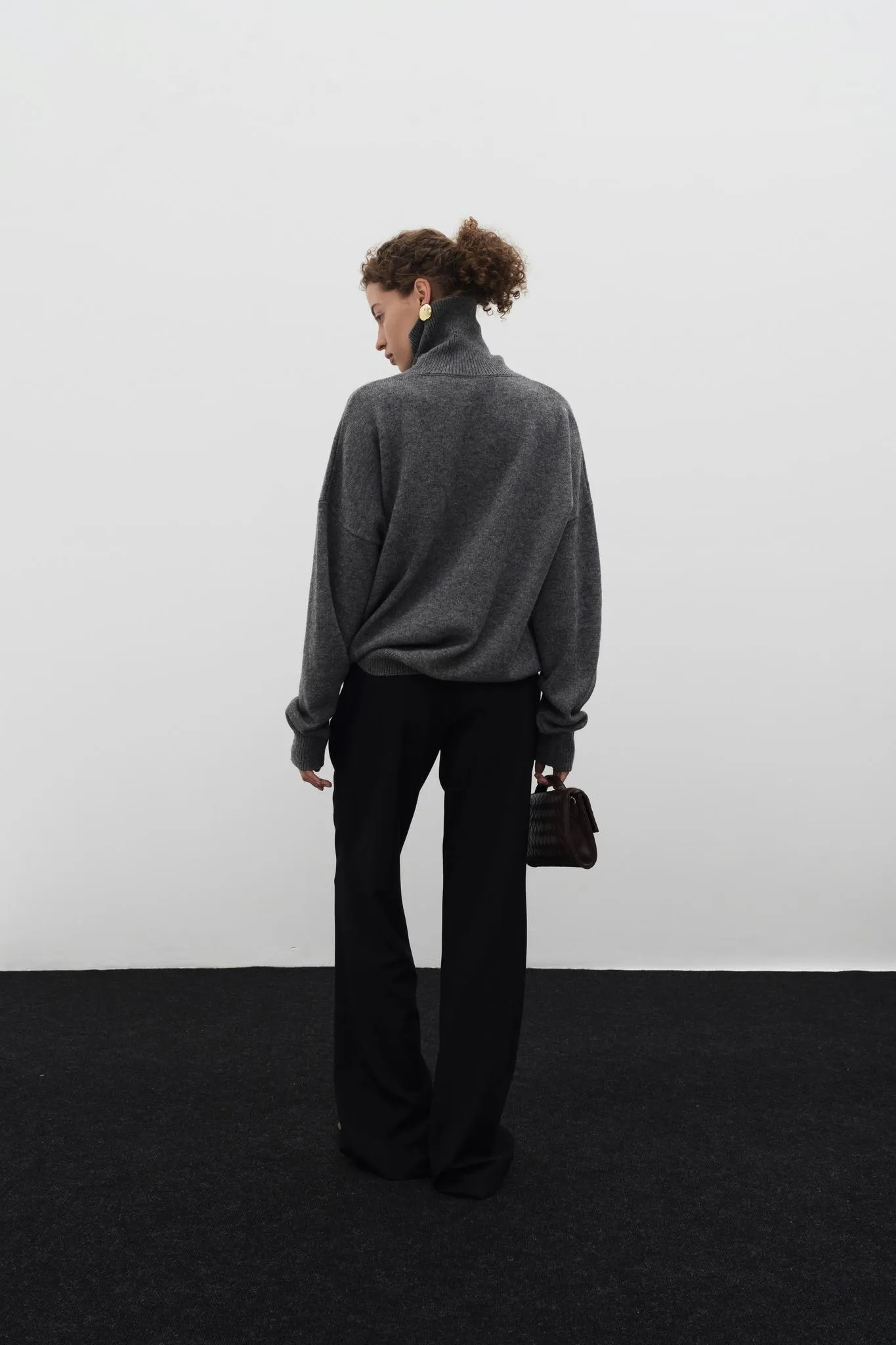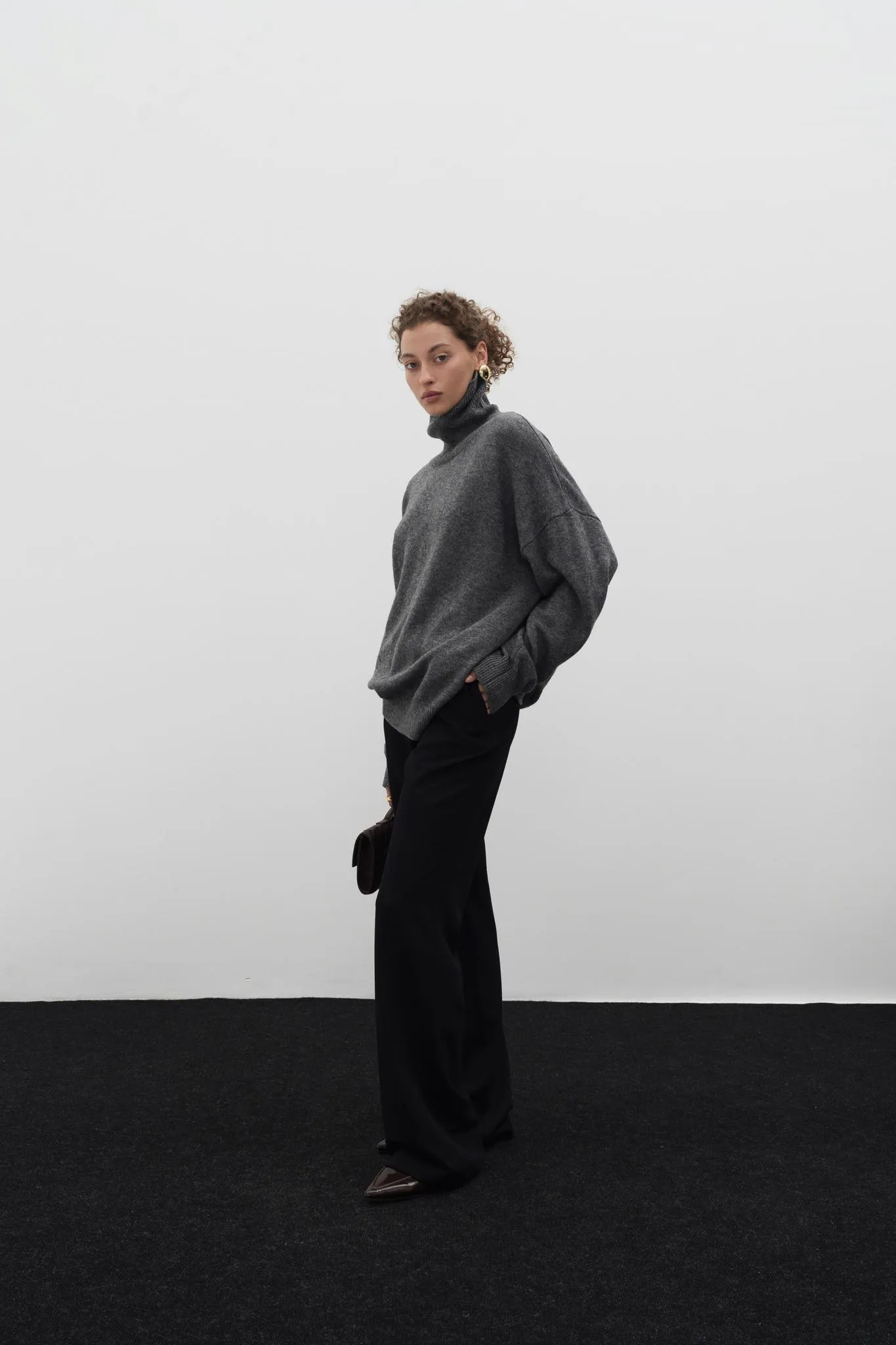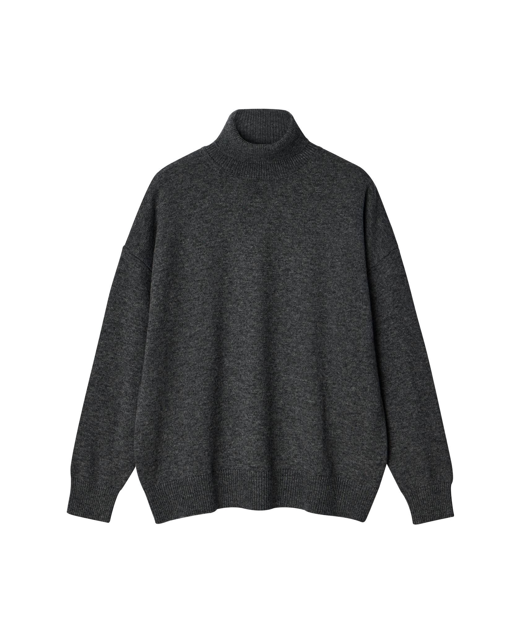 Базовый свитер с высоким воротом, длинным рукавом с манжетами и спущенной линией плеч.